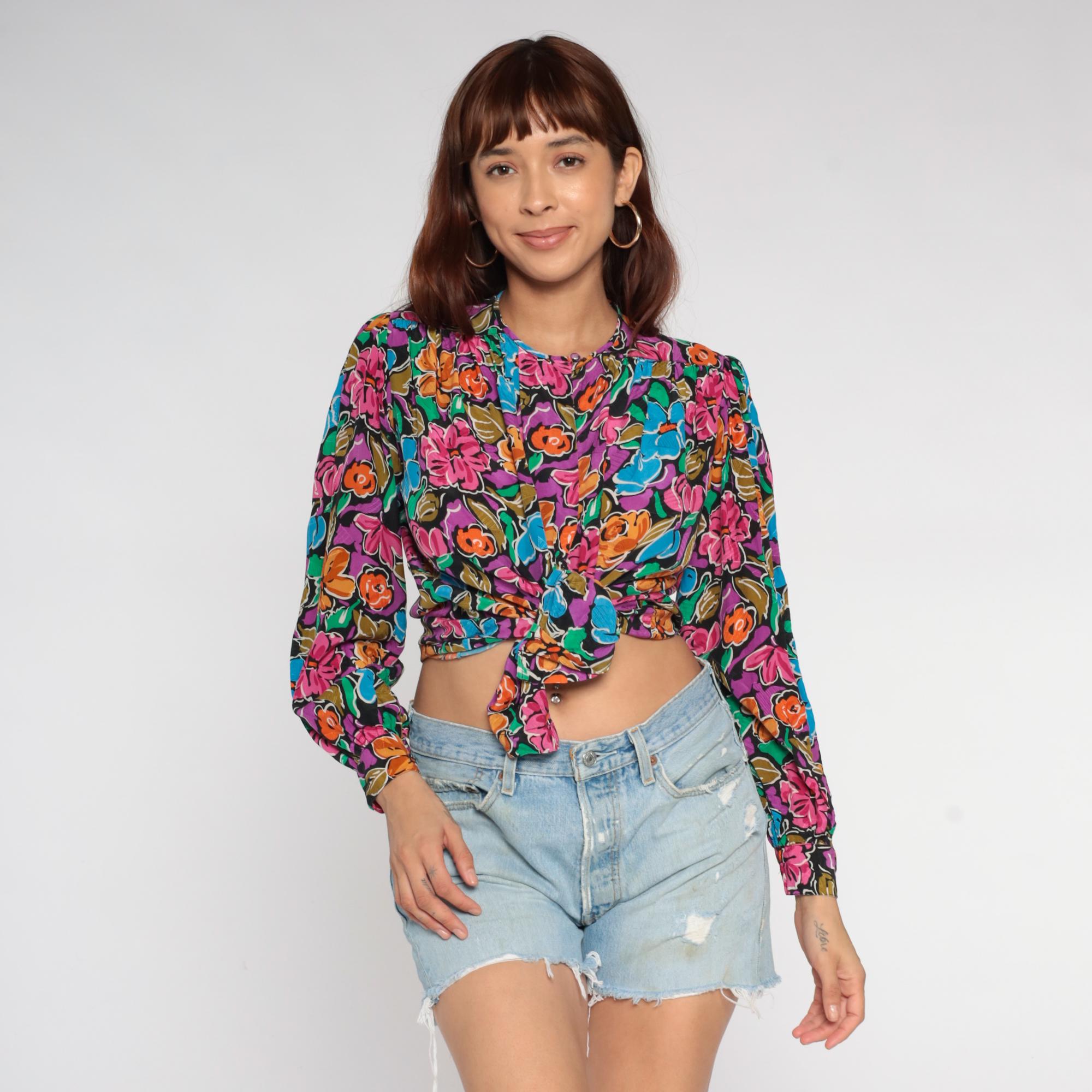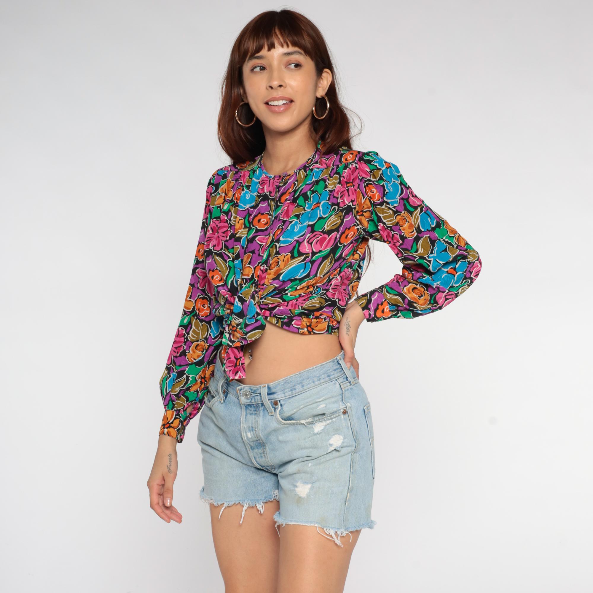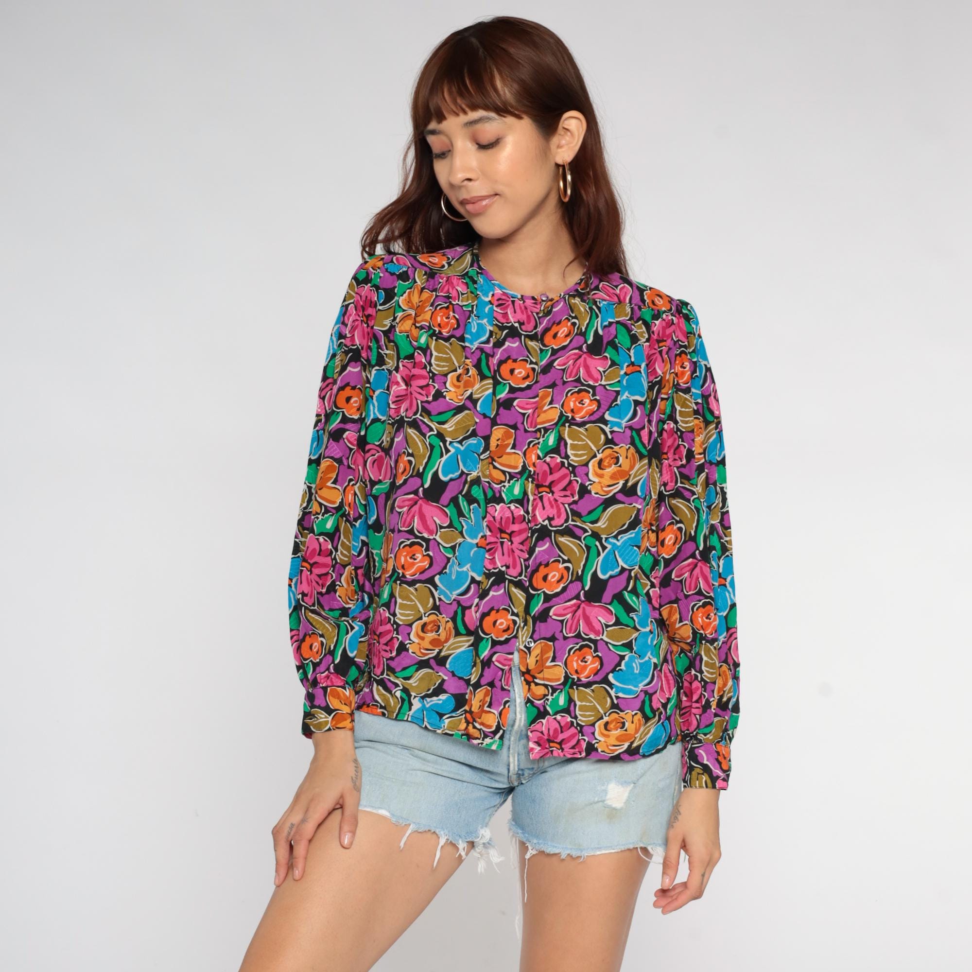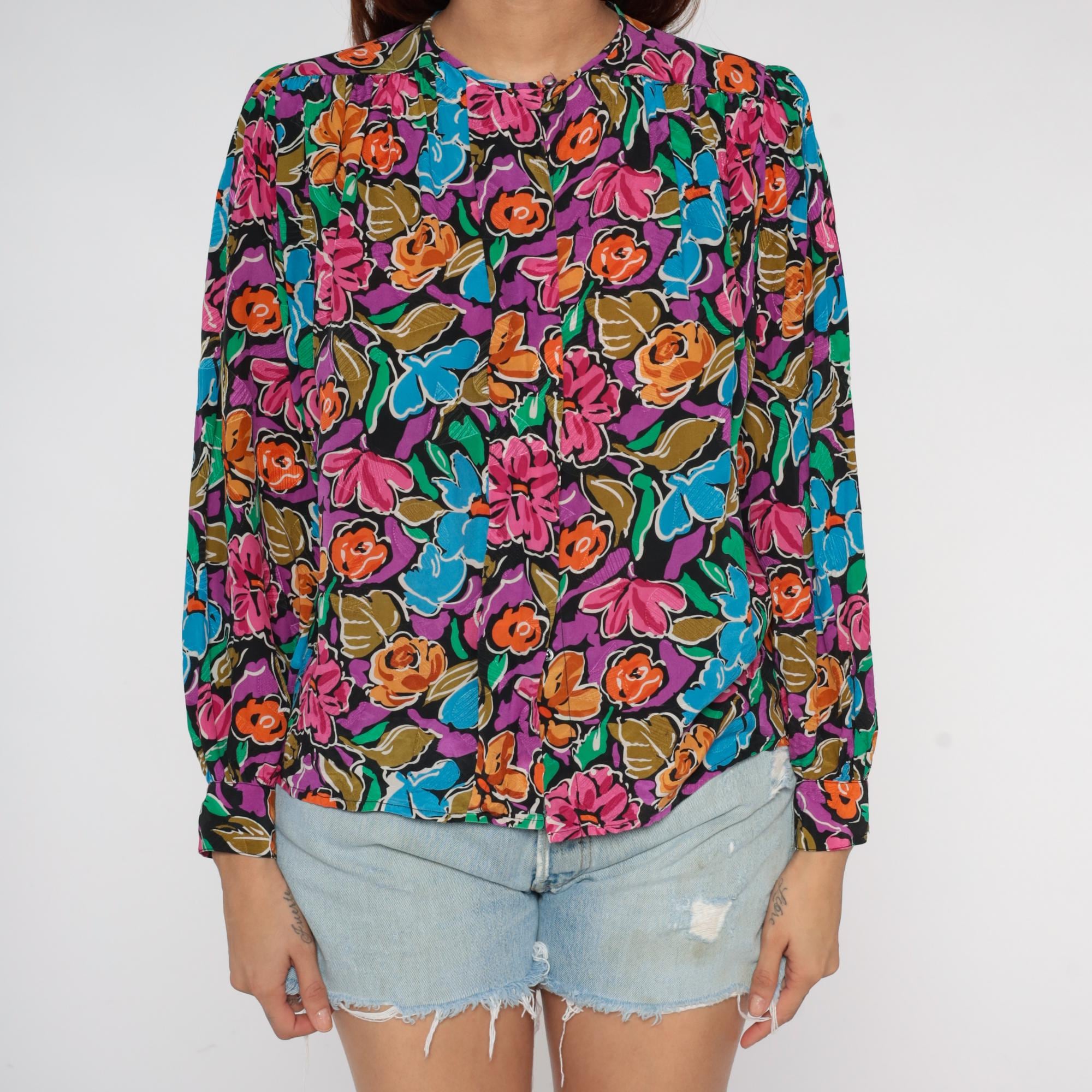 90s silk blouse with bold floral print in pink, orange, blue, green, and olive against a black background. Made from 100% silk with a soft, flowing hand and luxurious drape. Features a jewel neckline with gathered pleats, long sleeves with elasticized cuffs, and a relaxed fit through the body.