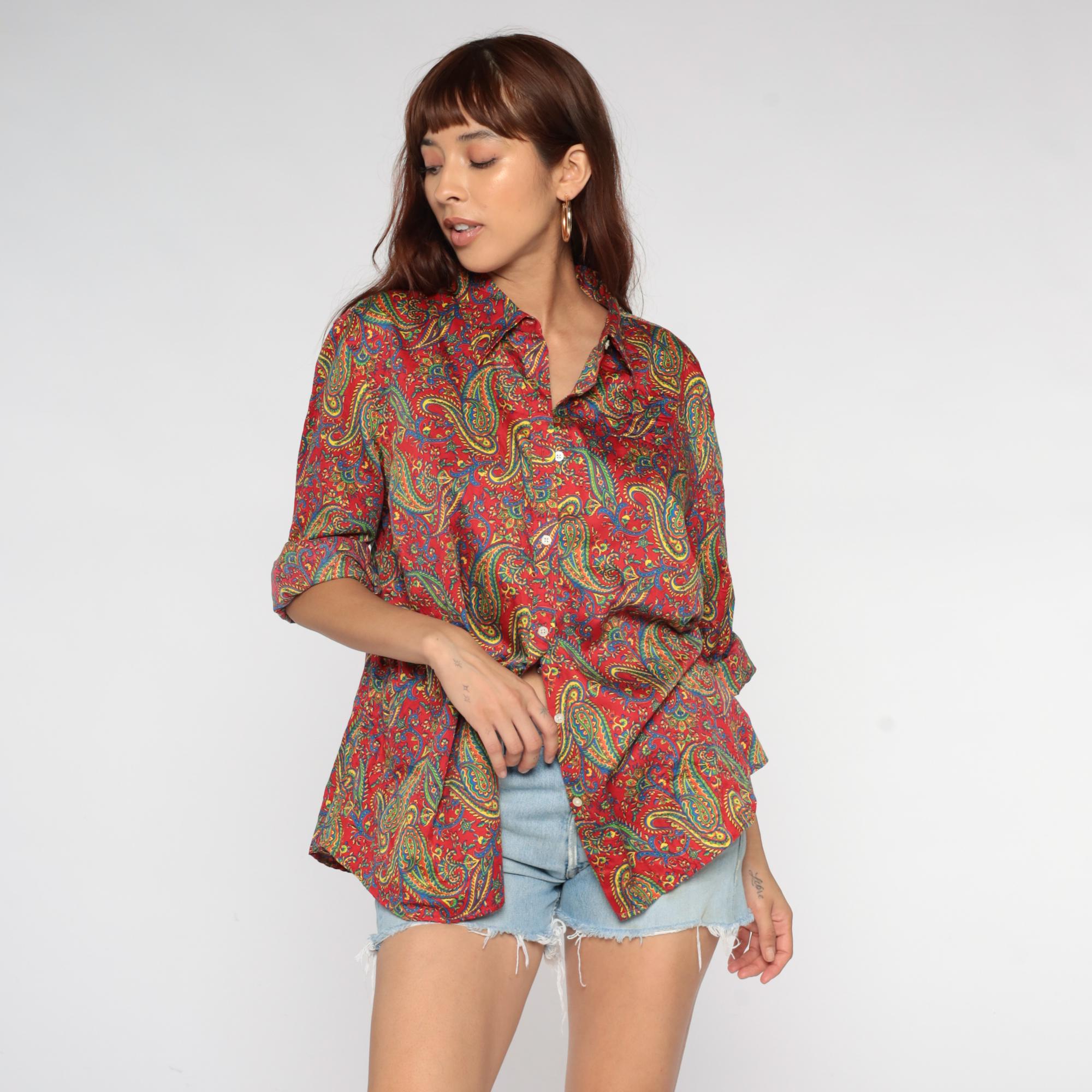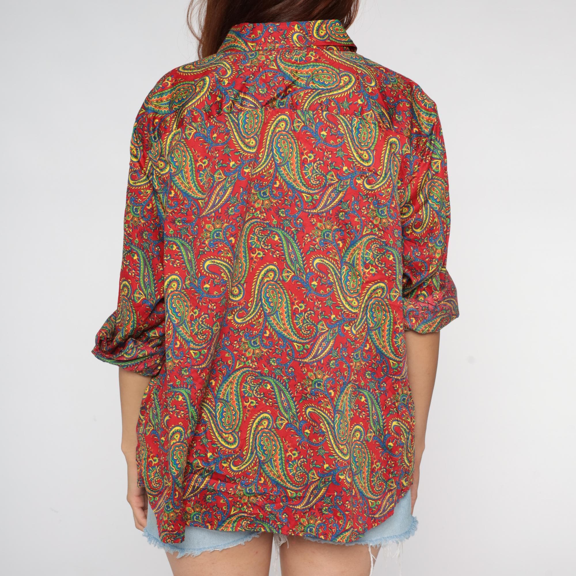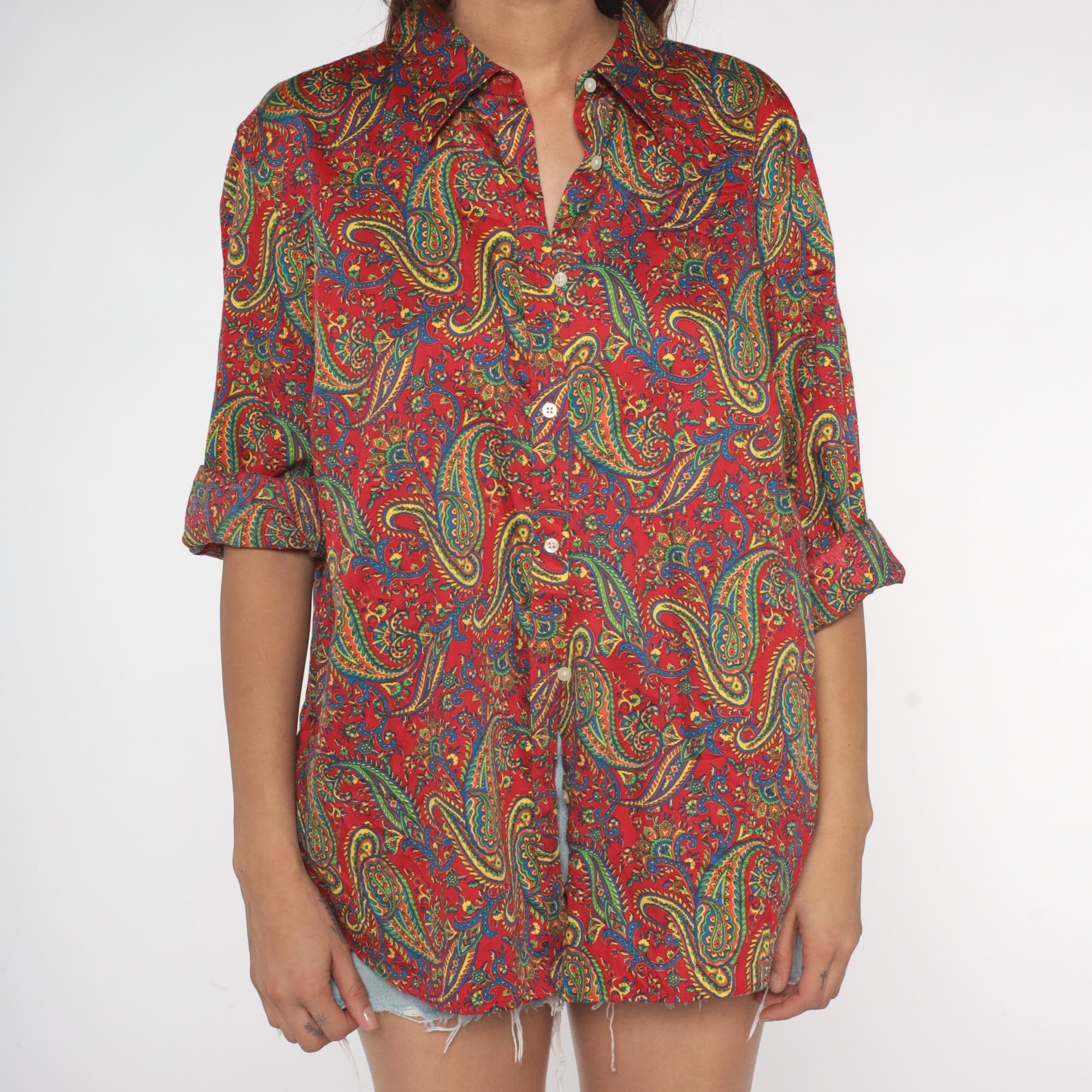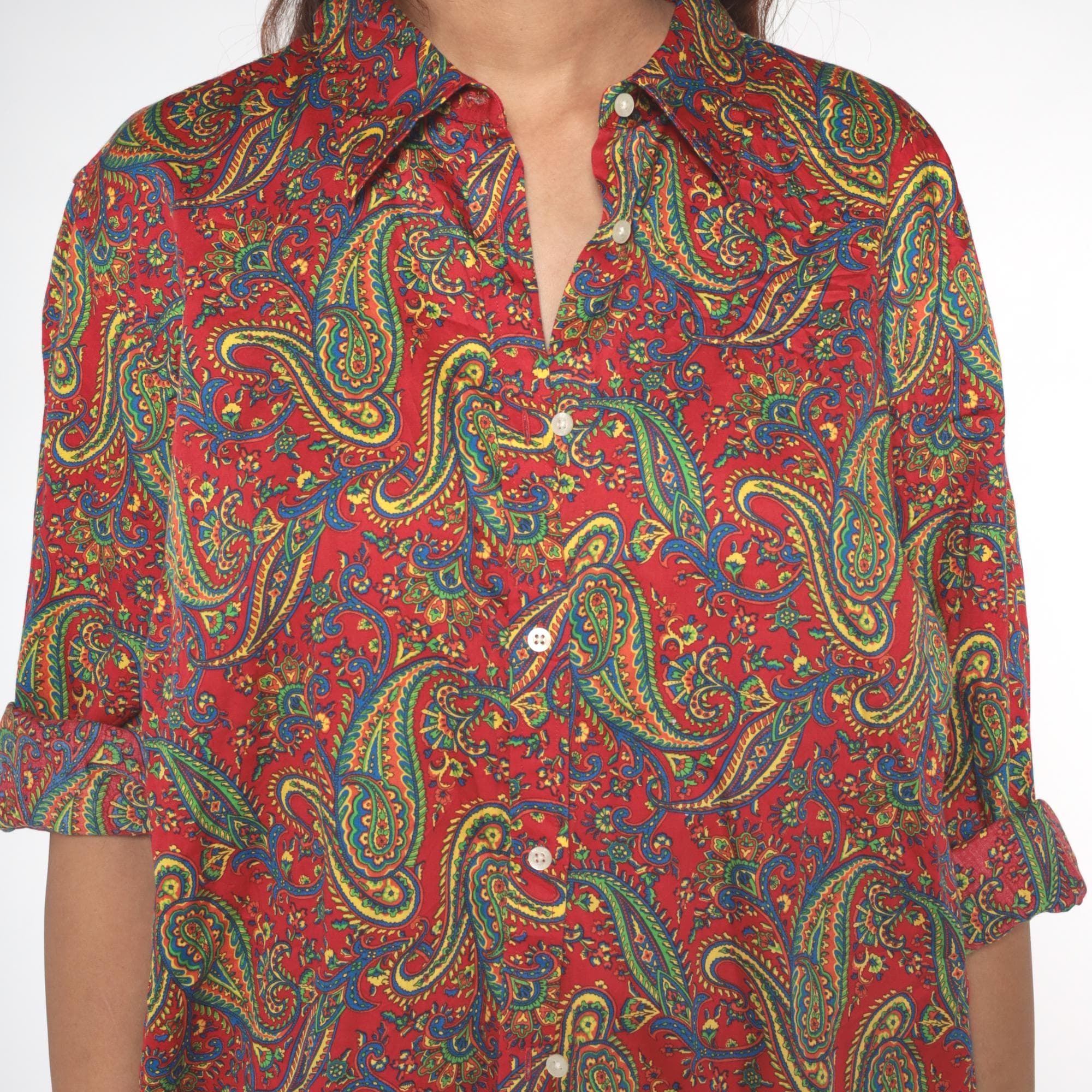 Y2K paisley print button-up shirt from Ralph Lauren in a vibrant red base with intricate multicolored paisley patterns throughout in yellow, green, blue, and teal. Long sleeves with button cuffs, pointed collar, and full button front closure.