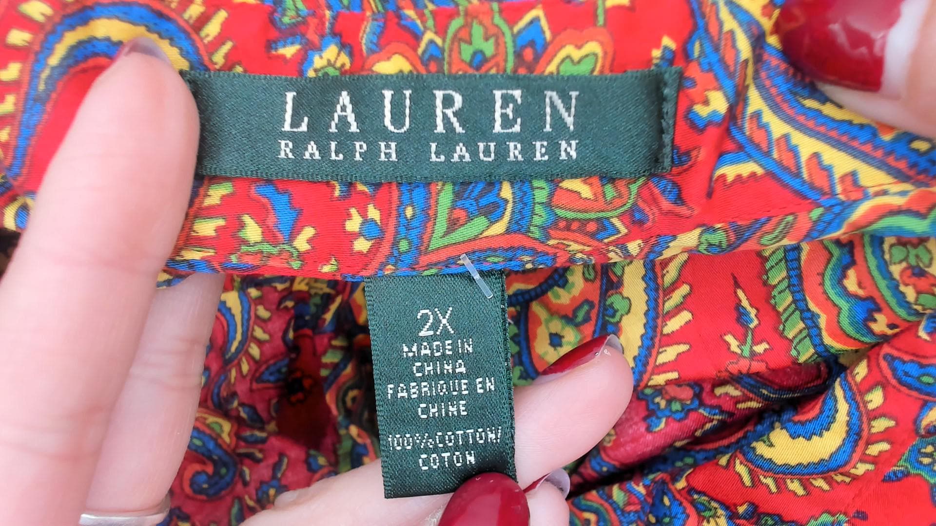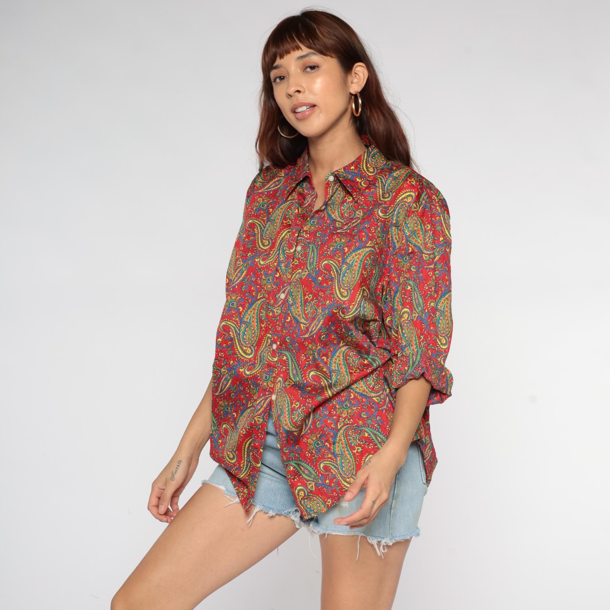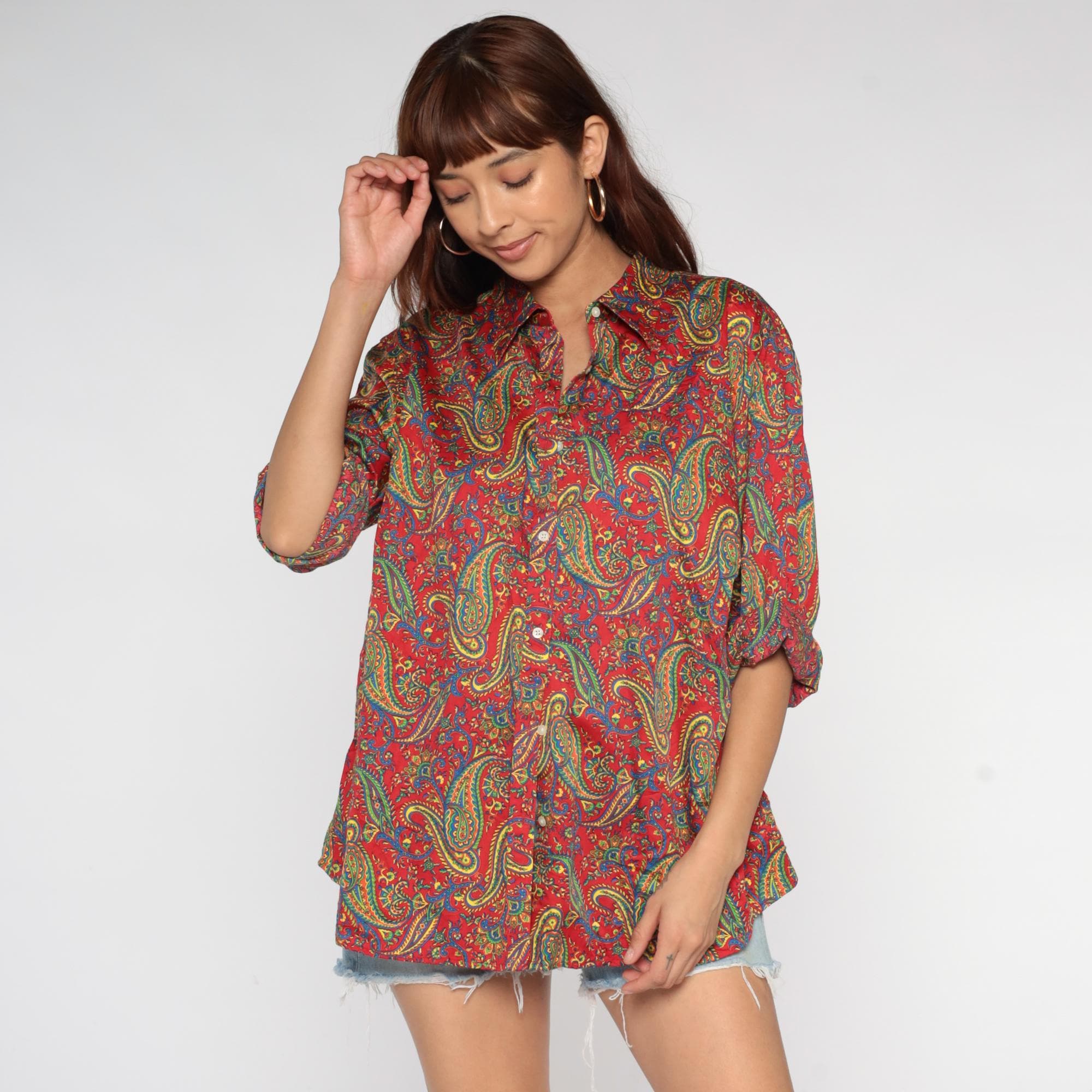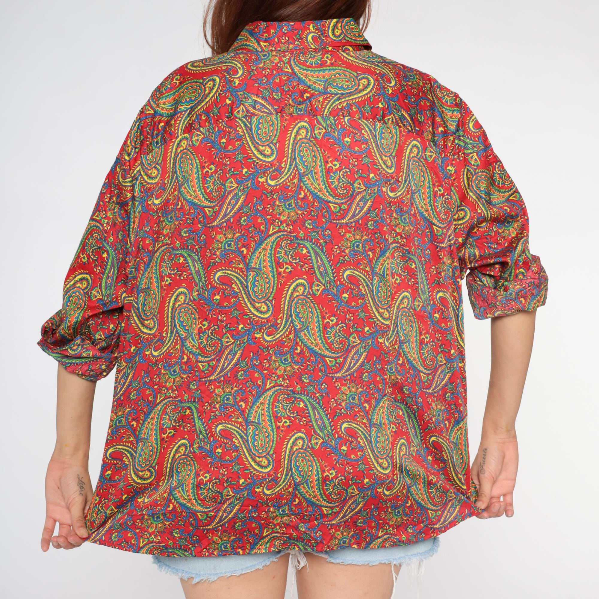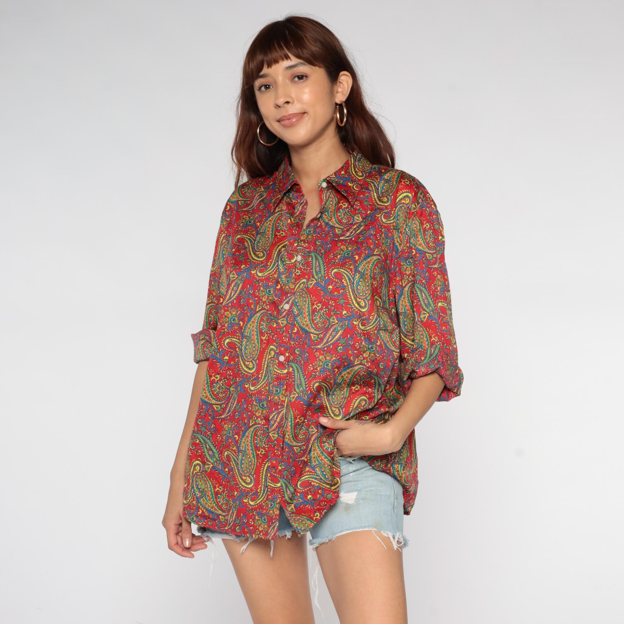 Y2K paisley print button-up shirt from Ralph Lauren in a vibrant red base with intricate multicolored paisley patterns throughout in yellow, green, blue, and teal. Long sleeves with button cuffs, pointed collar, and full button front closure.