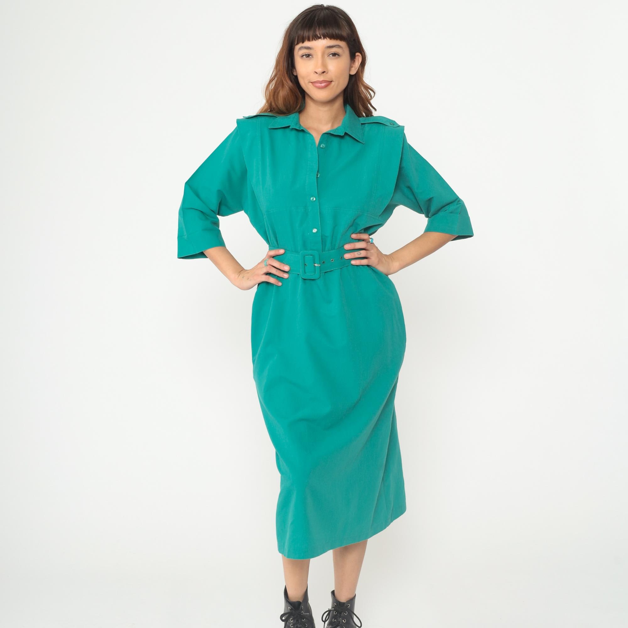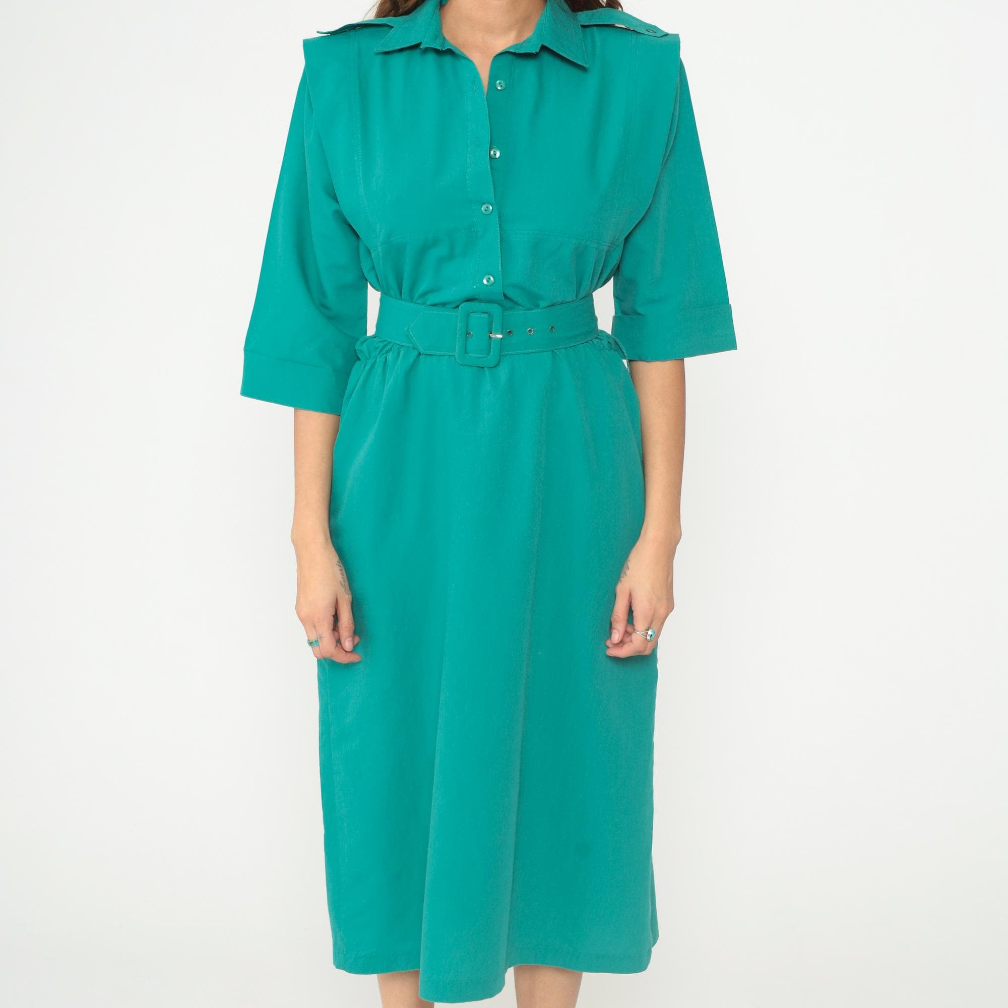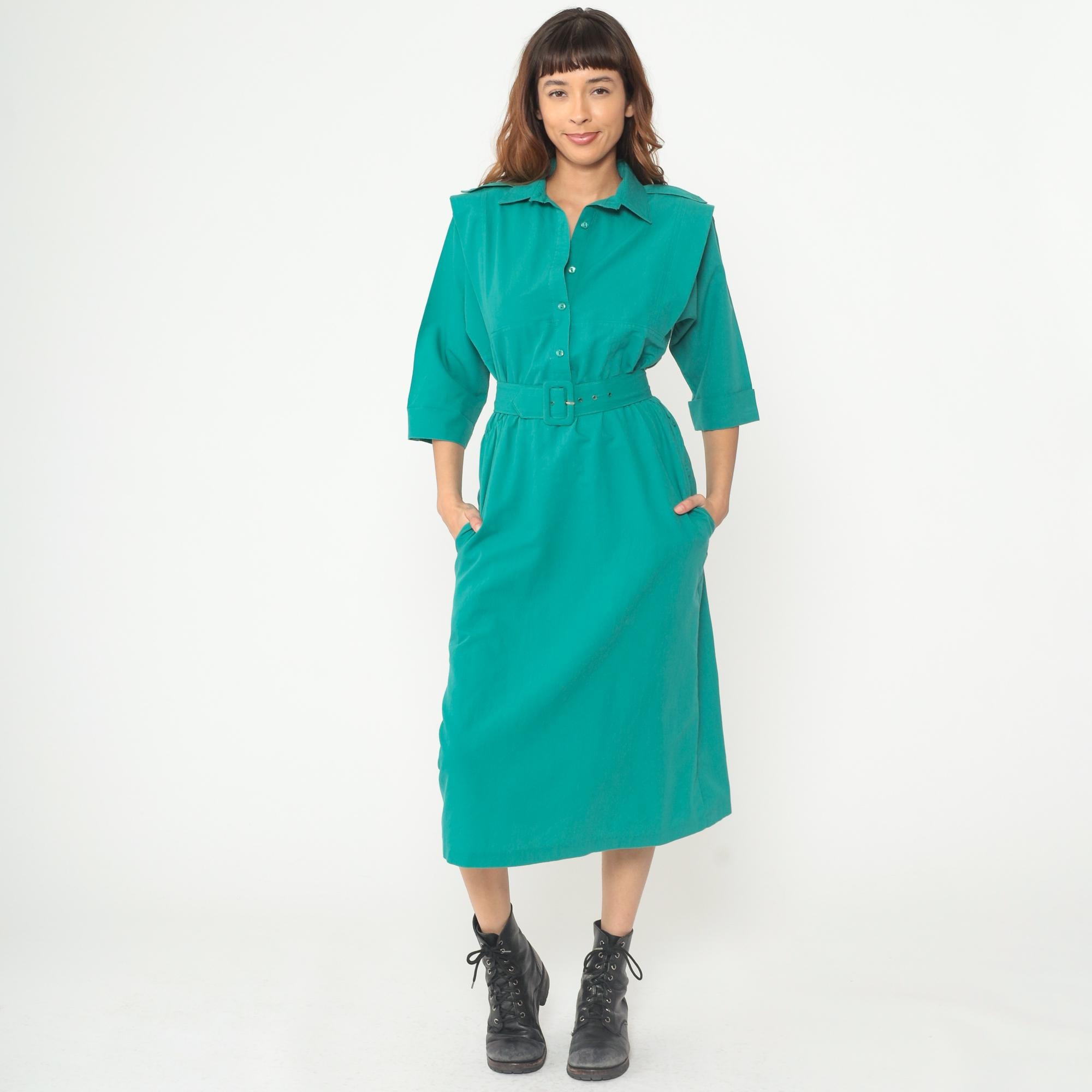80s teal shirtdress with structured collar and button front closure, belted waist with matching fabric belt and covered buckle. Three-quarter sleeves with turned-back cuffs, shoulder tabs with button details, and front chest pockets. Midi length with side pockets.
