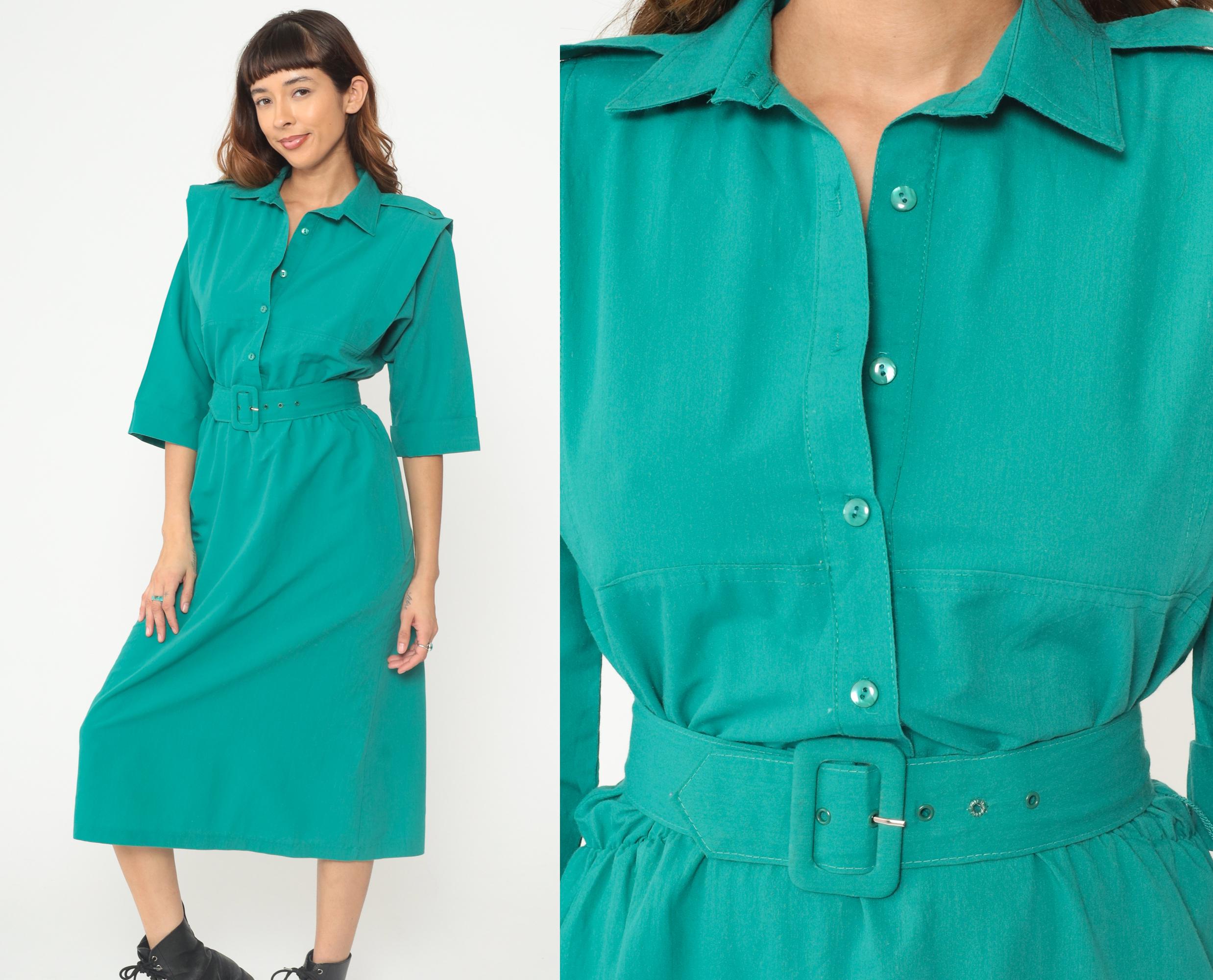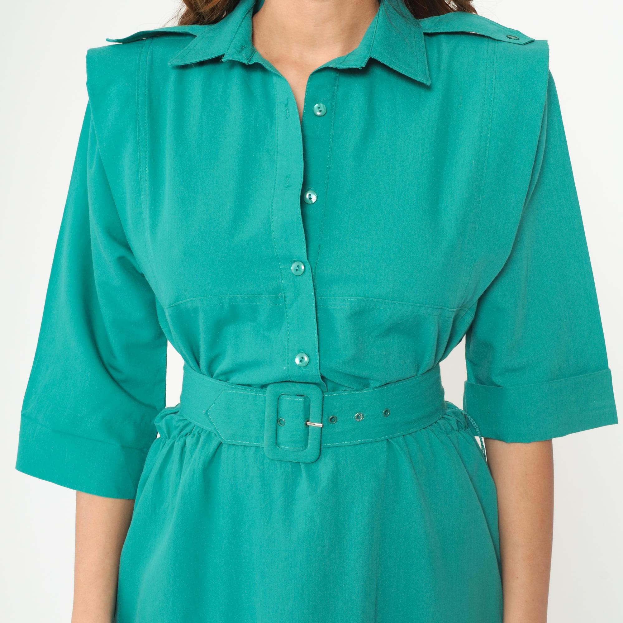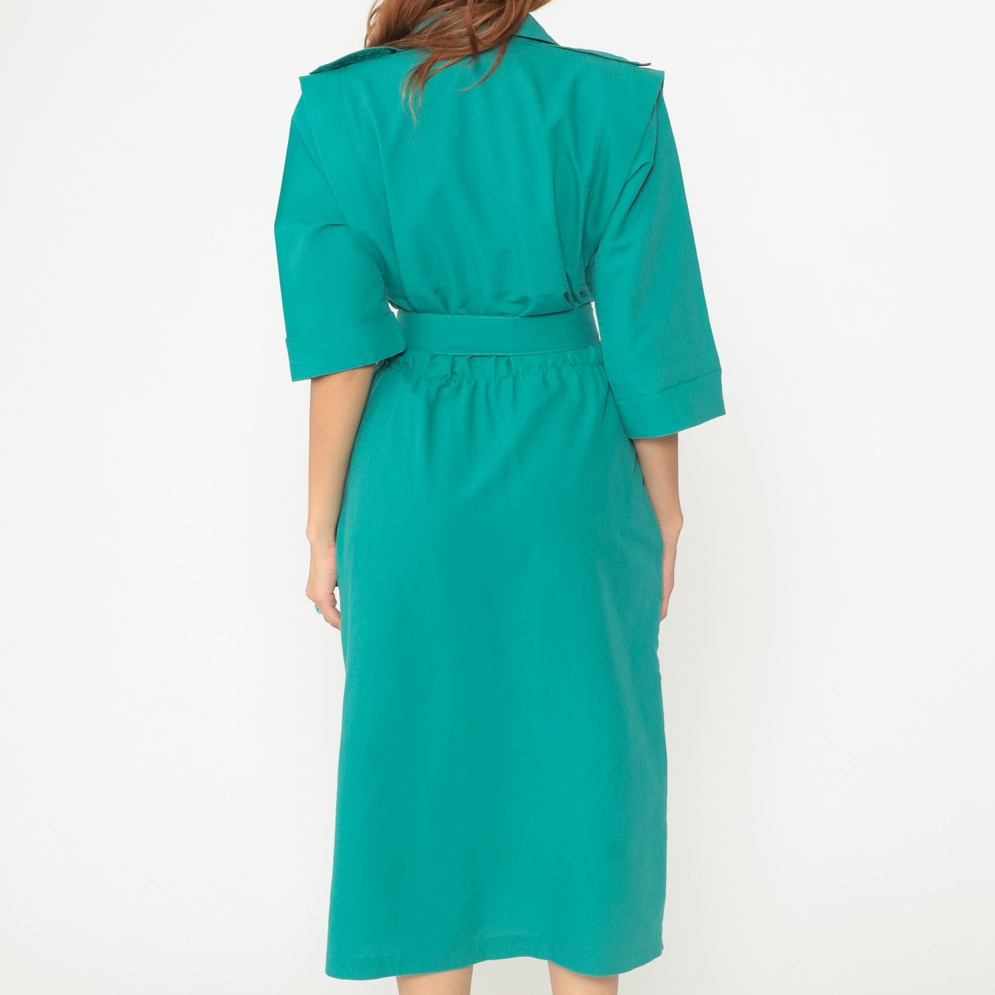 80s teal shirtdress with structured collar and button front closure, belted waist with matching fabric belt and covered buckle. Three-quarter sleeves with turned-back cuffs, shoulder tabs with button details, and front chest pockets. Midi length with side pockets.