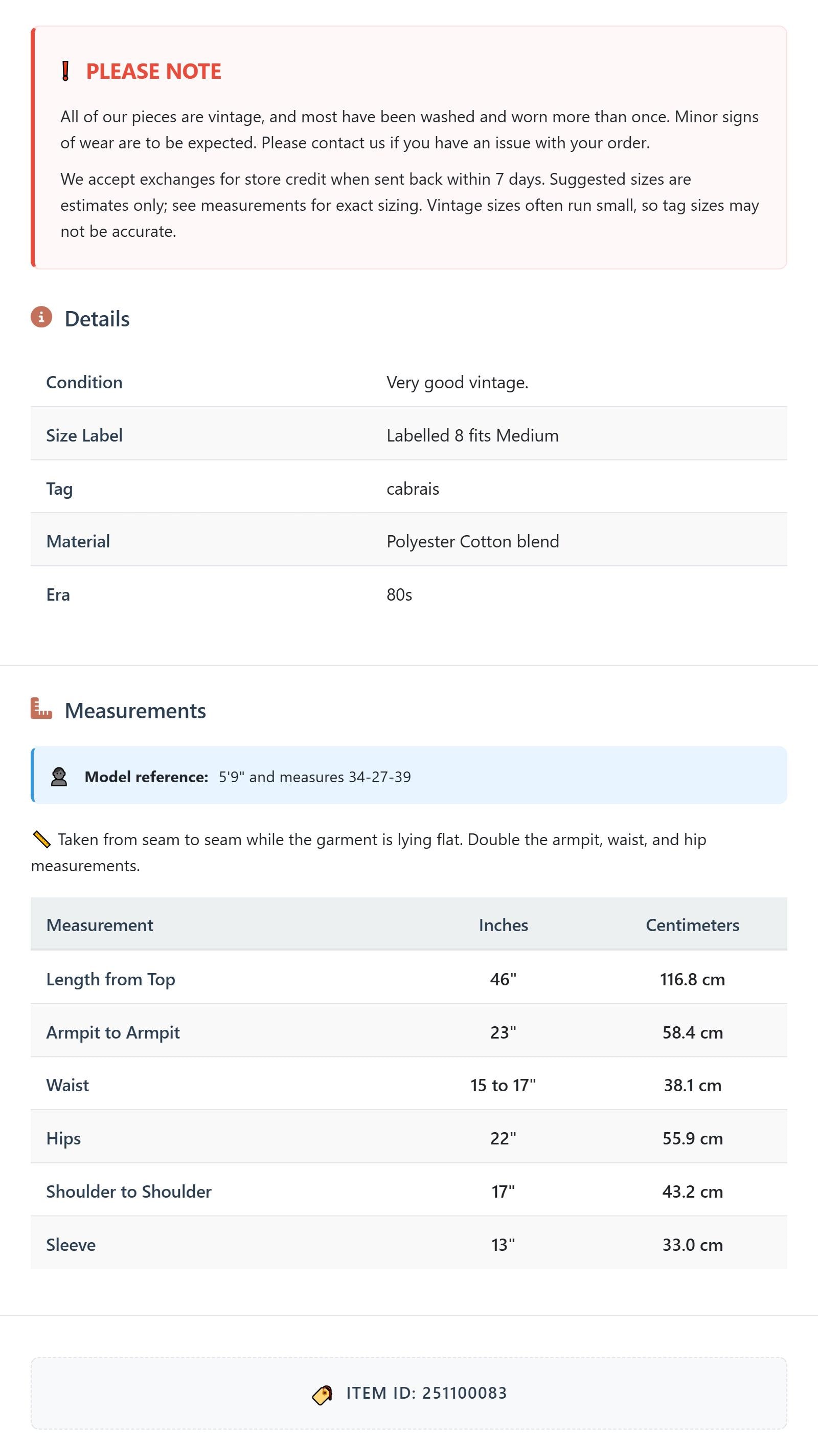 Suggested sizes are estimates only; see measurements for exact sizing. Vintage sizes often run small, so tag sizes may not be accurate.