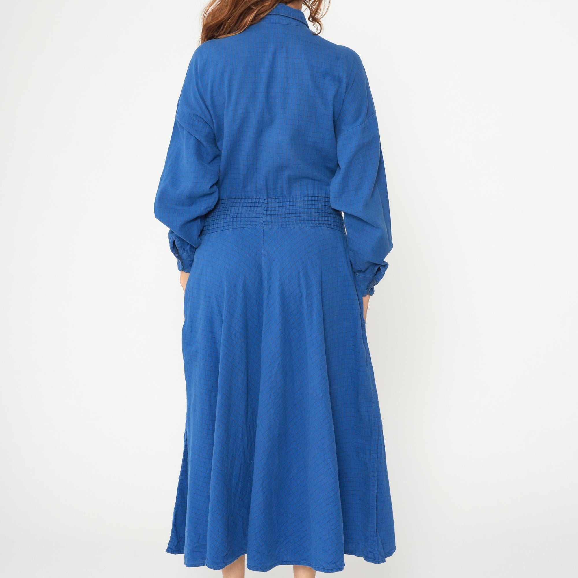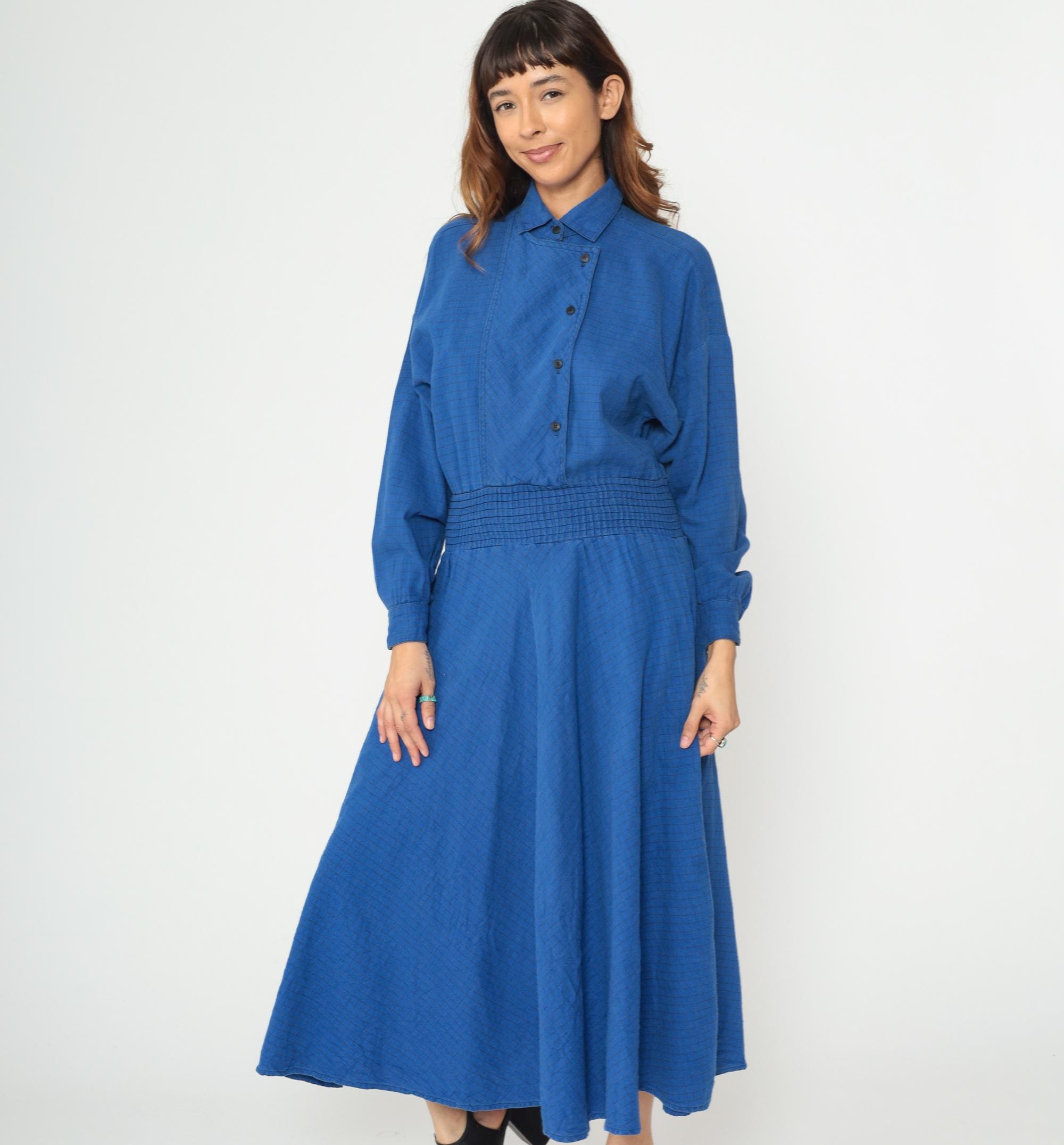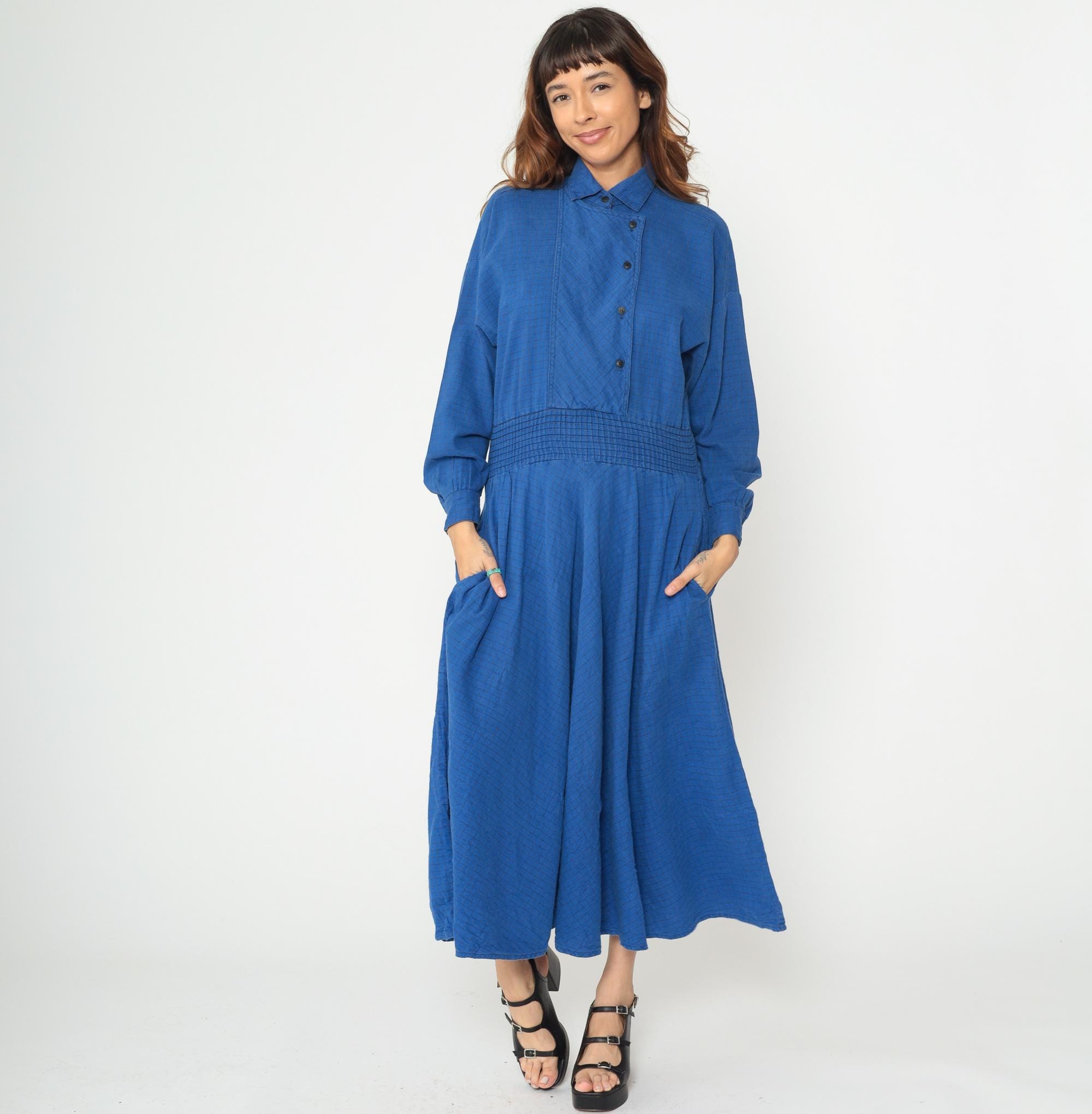 80s royal blue shirt dress from Carol Anderson with classic collar and button front placket. Long sleeves with button cuffs, smocked waist creating definition at the natural waistline, and full A-line skirt falling to maxi length. Side seam pockets. Cotton.