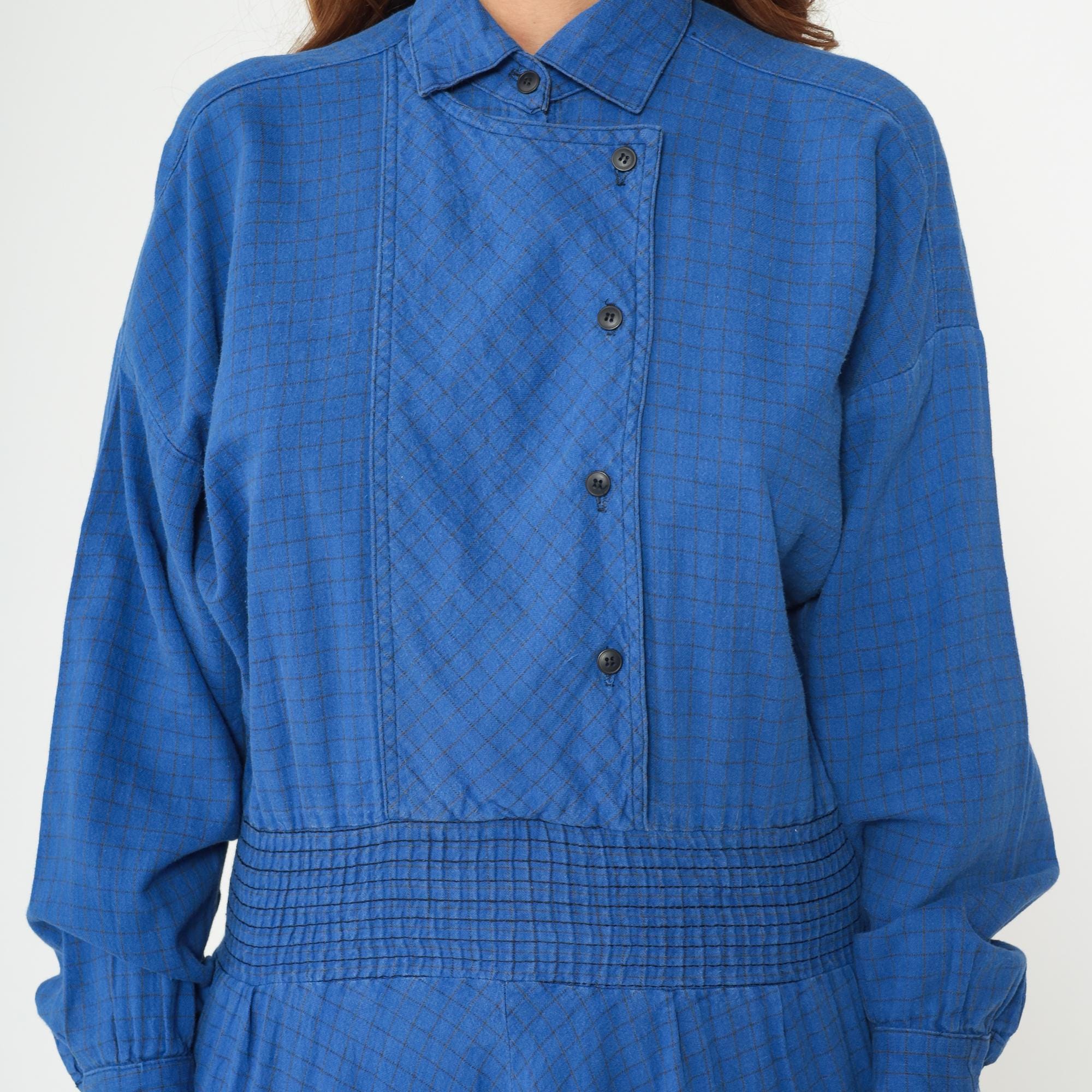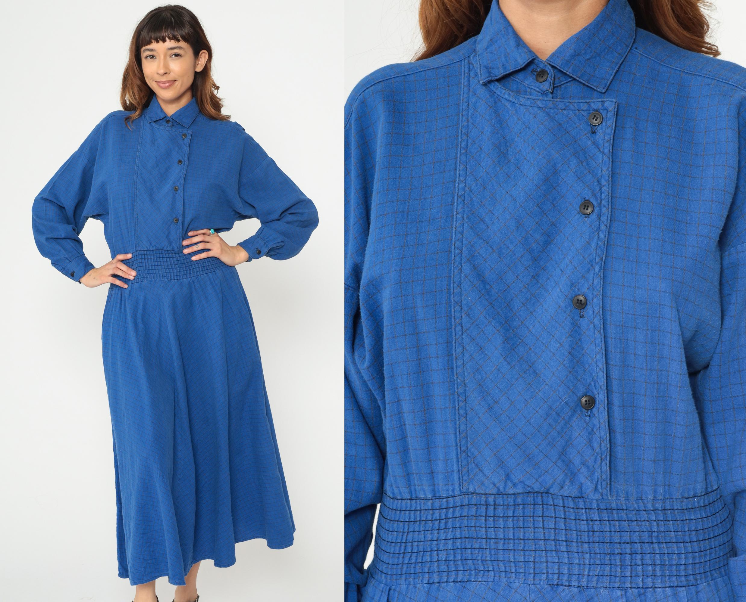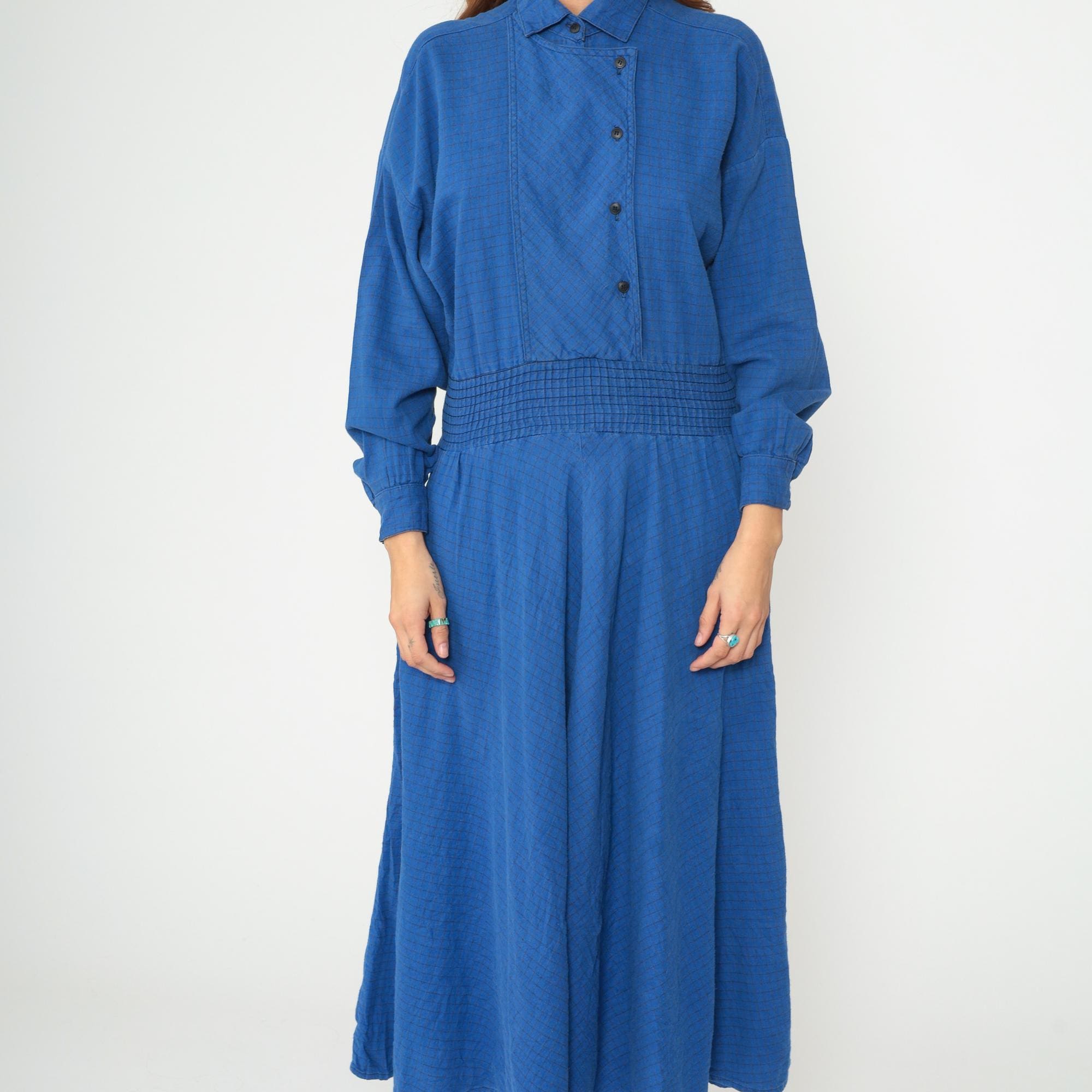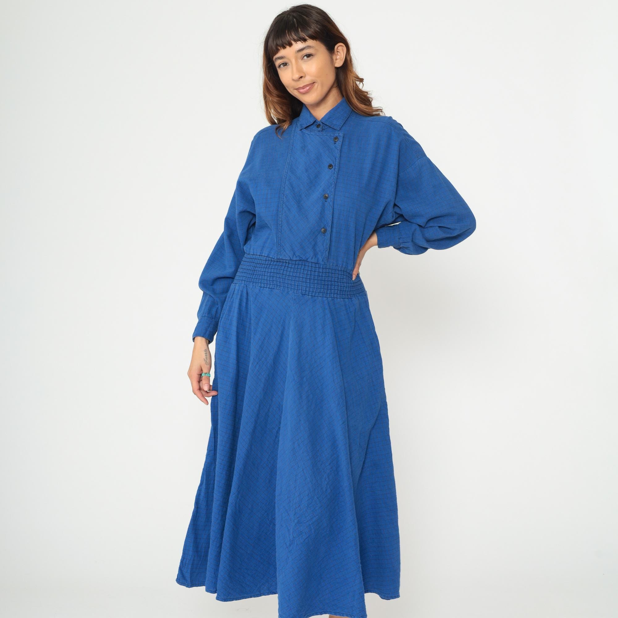 80s royal blue shirt dress from Carol Anderson with classic collar and button front placket. Long sleeves with button cuffs, smocked waist creating definition at the natural waistline, and full A-line skirt falling to maxi length. Side seam pockets. Cotton.