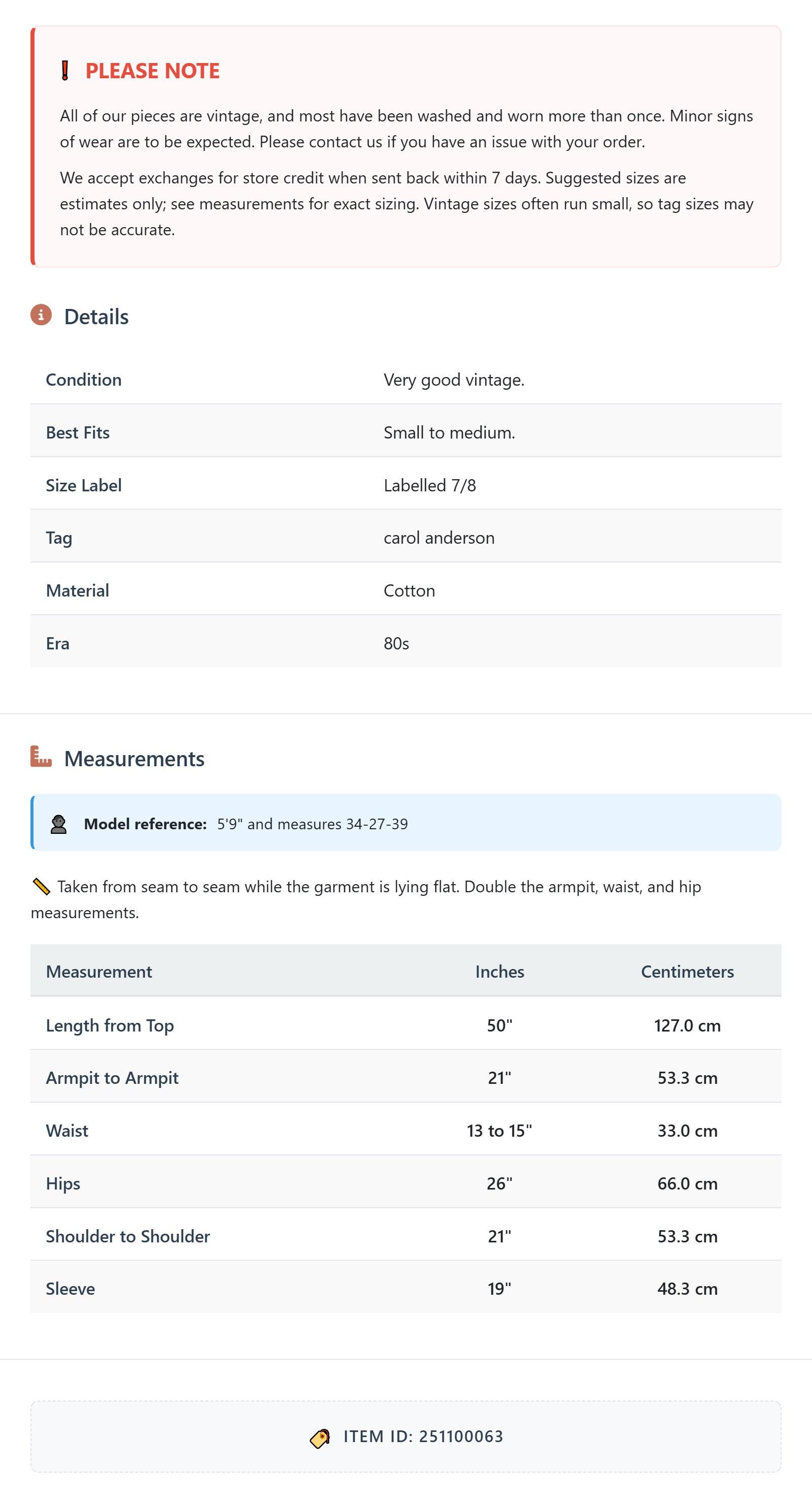 All of our pieces are vintage, and most have been washed and worn more than once. Minor signs of wear are to be expected. Please contact us if you have an issue with your order. We accept exchanges for store credit when sent back within 7 days.