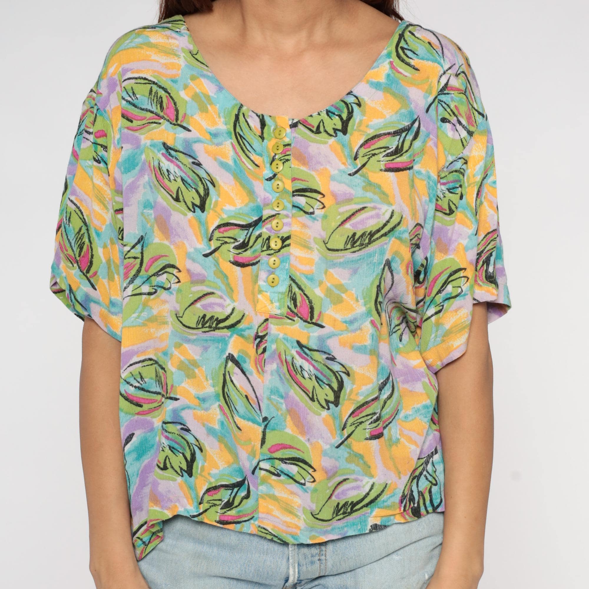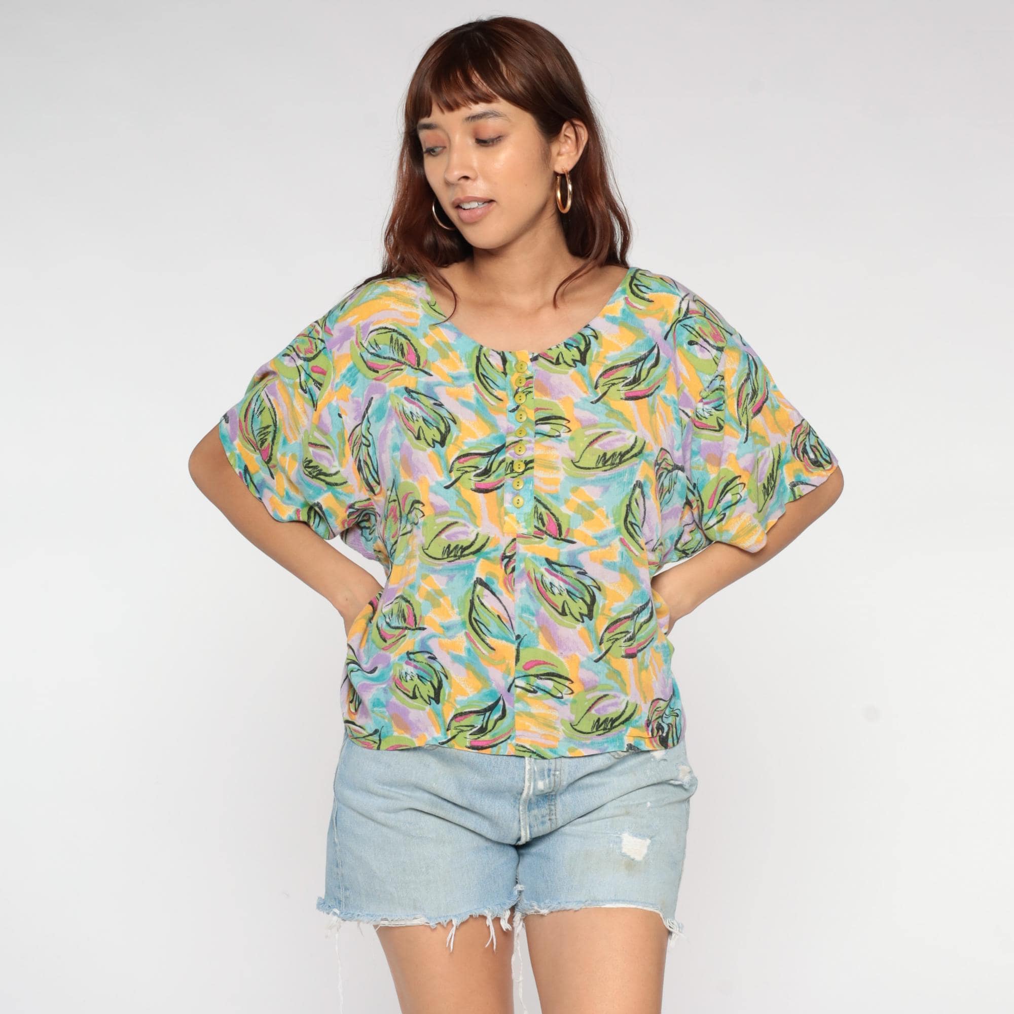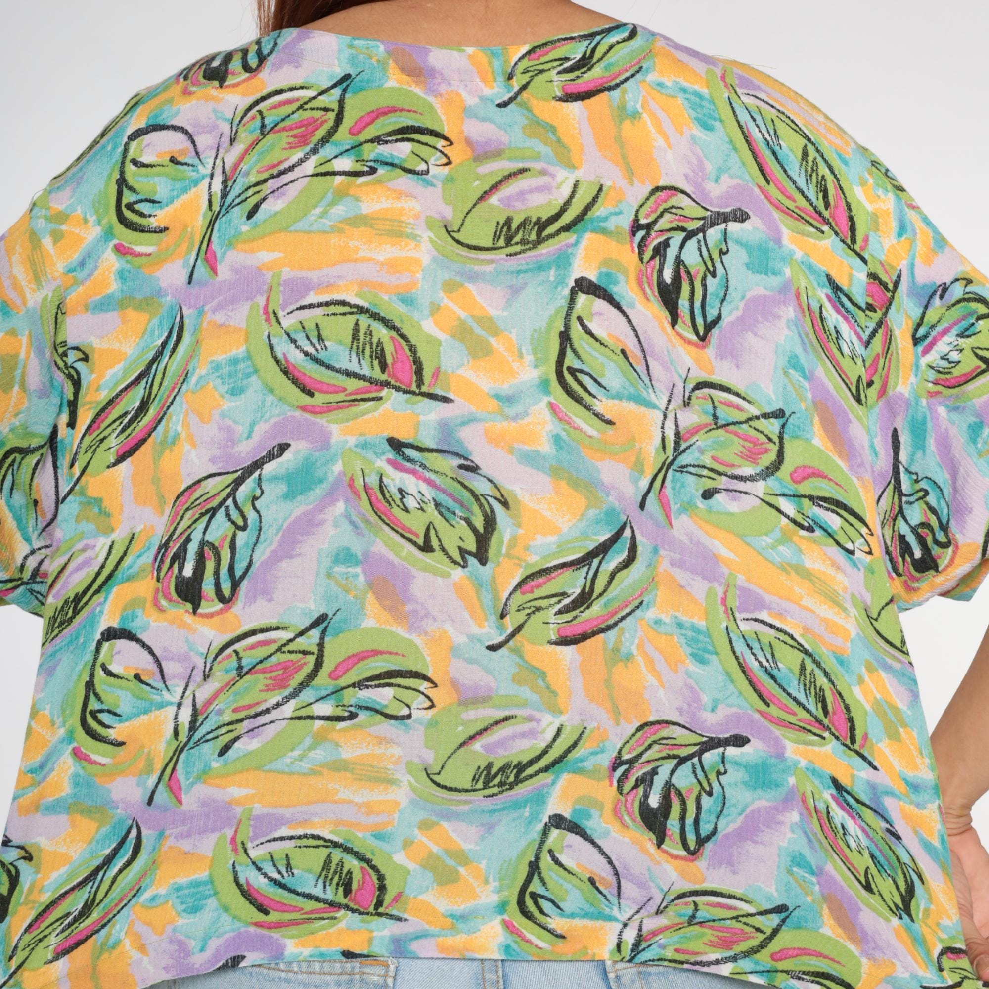 90s tropical leaf print top from Forenza with abstract botanical pattern in soft pastels including lavender, mint green, yellow, blue, and pink. Button front closure with yellow-green buttons and short sleeves.