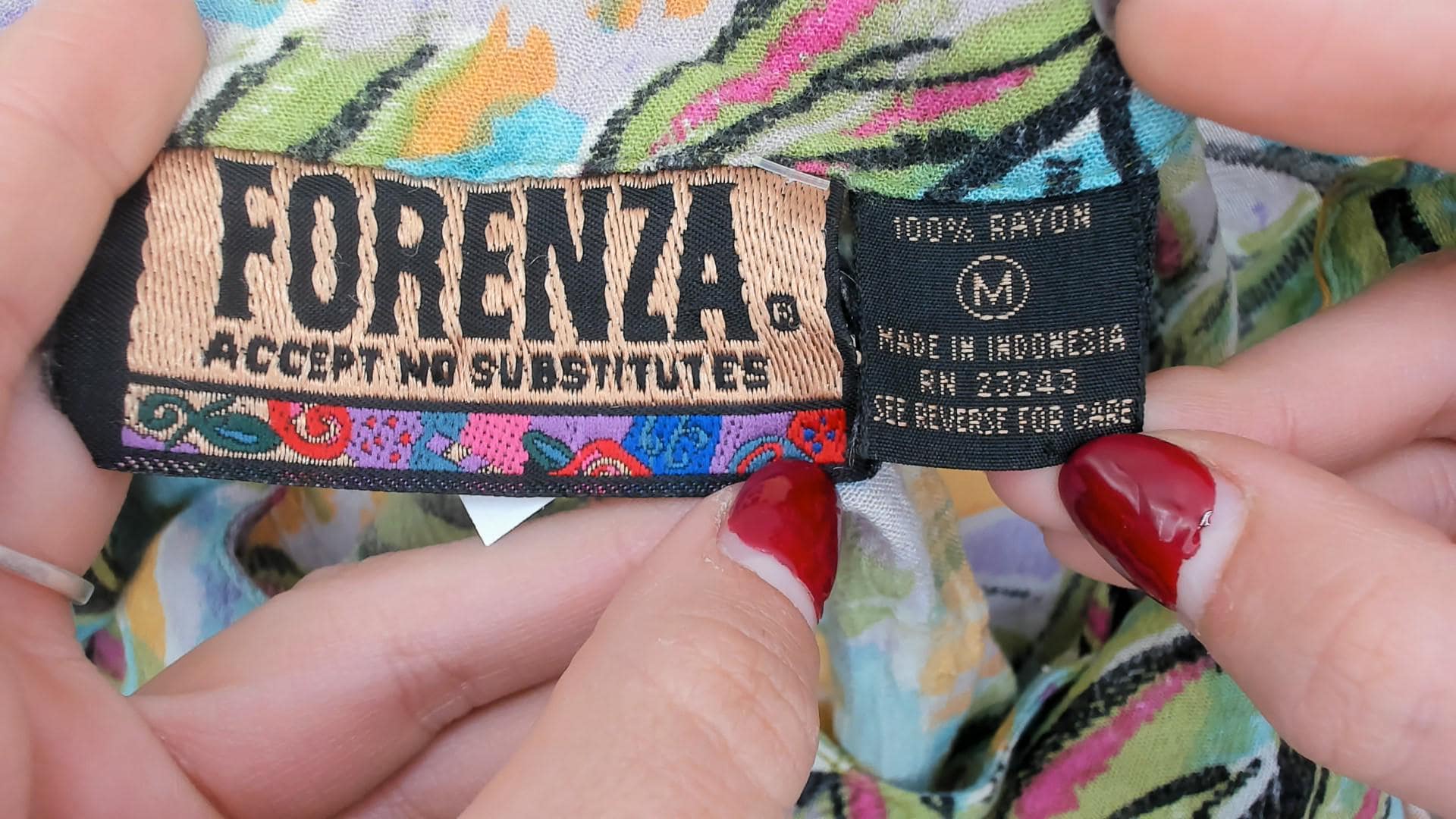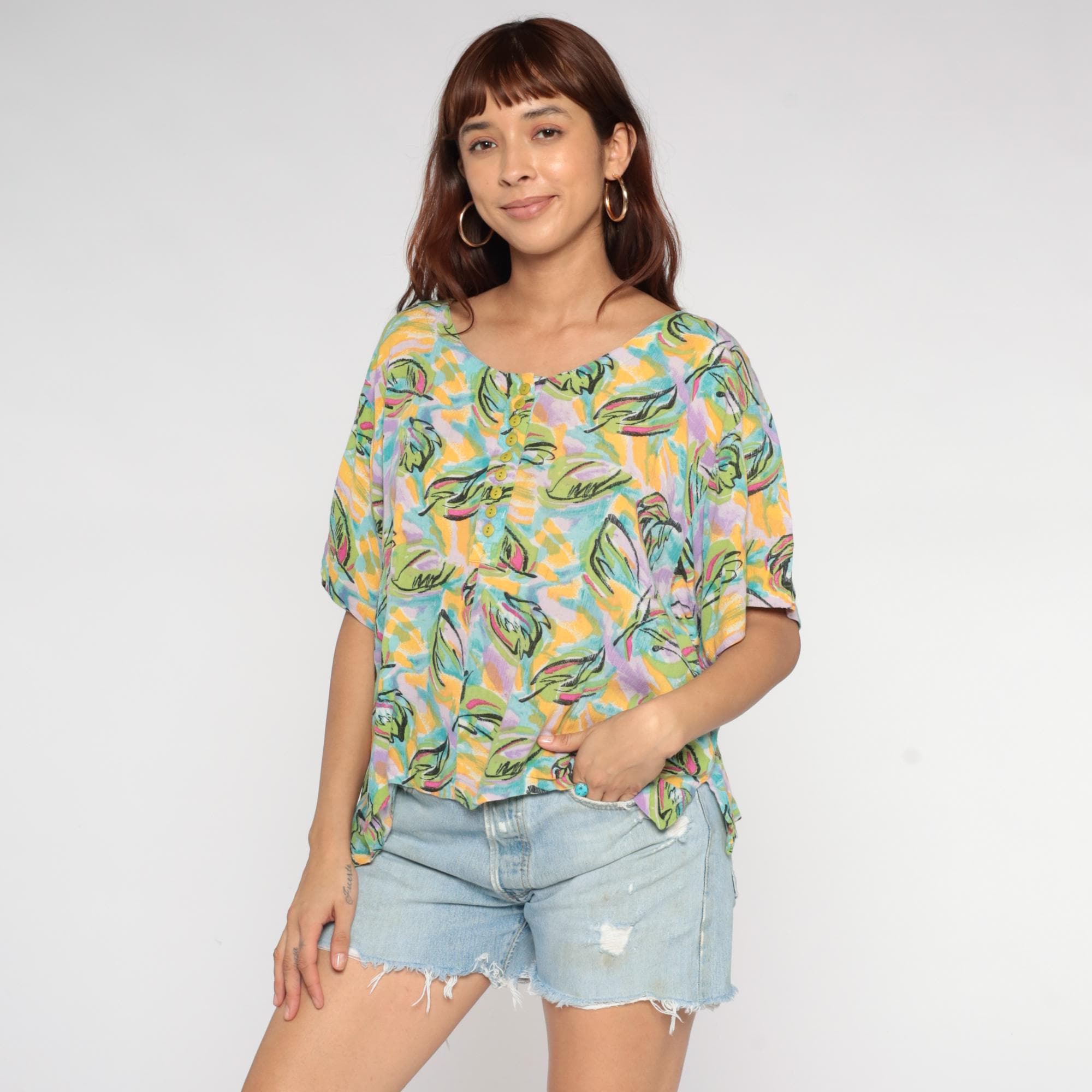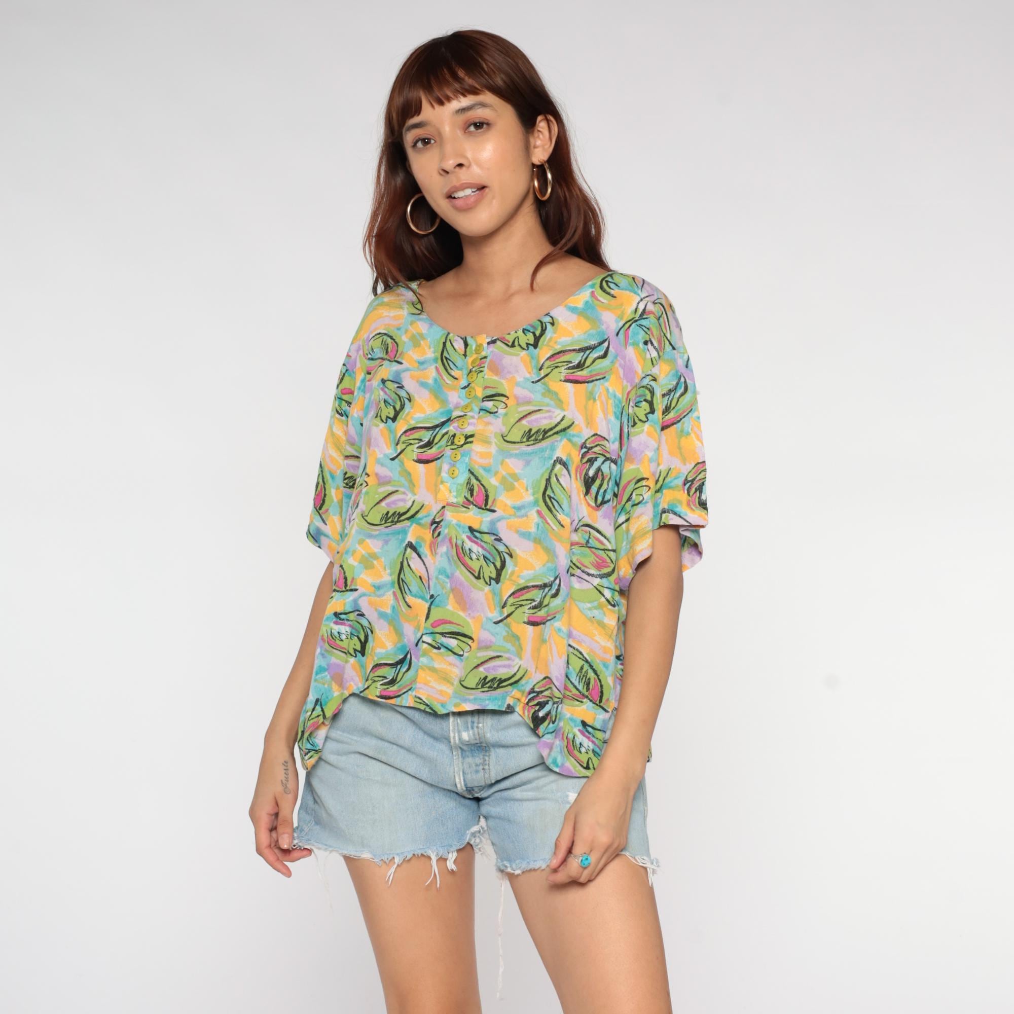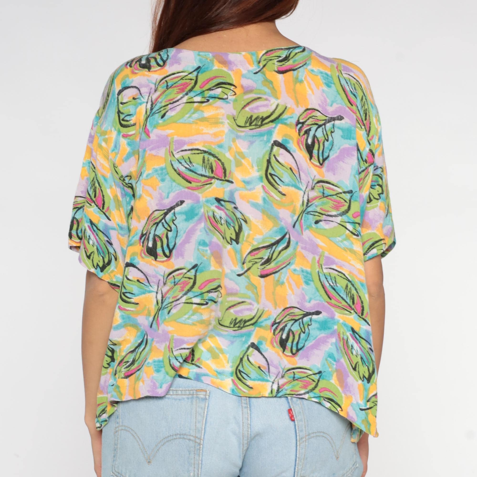 90s tropical leaf print top from Forenza with abstract botanical pattern in soft pastels including lavender, mint green, yellow, blue, and pink. Button front closure with yellow-green buttons and short sleeves.