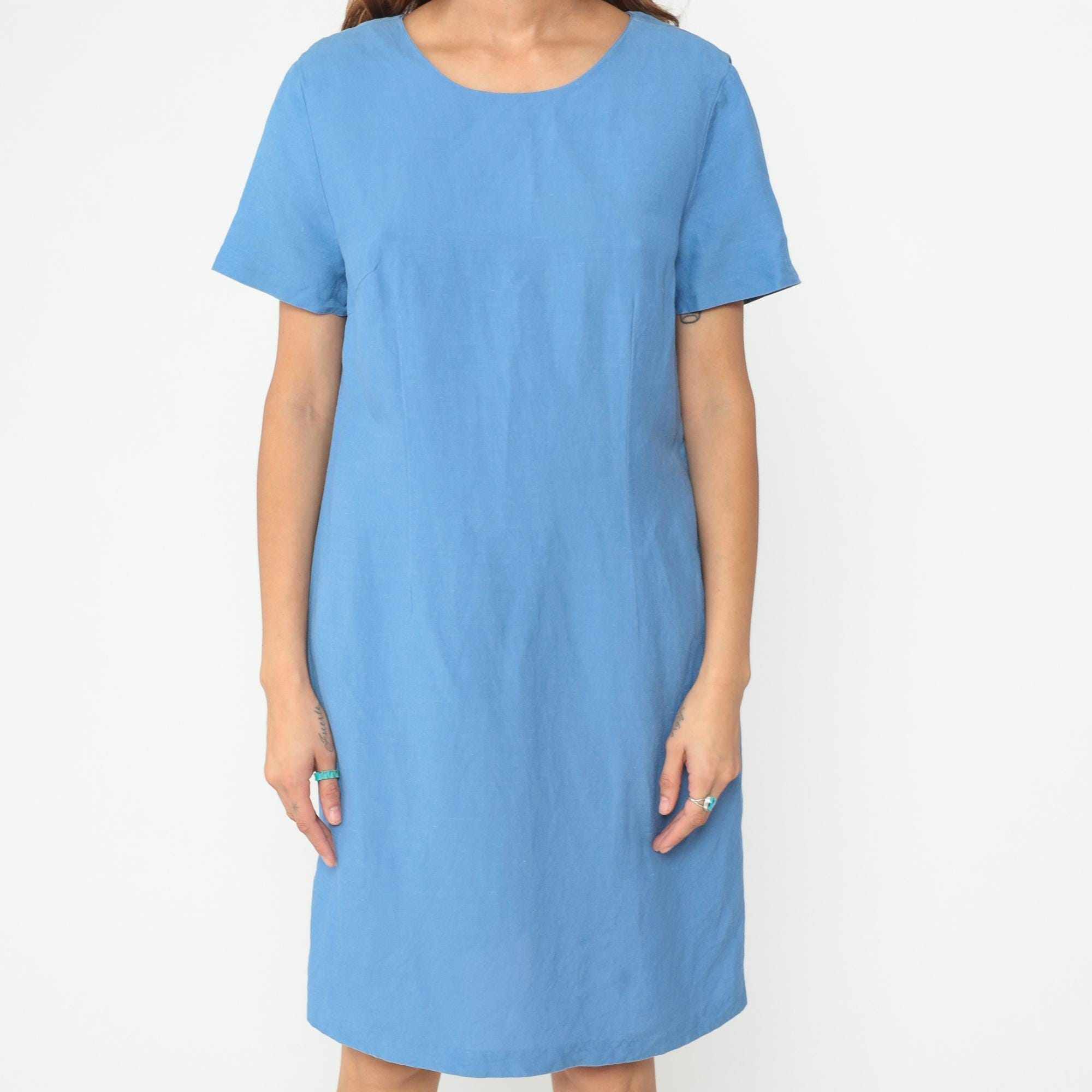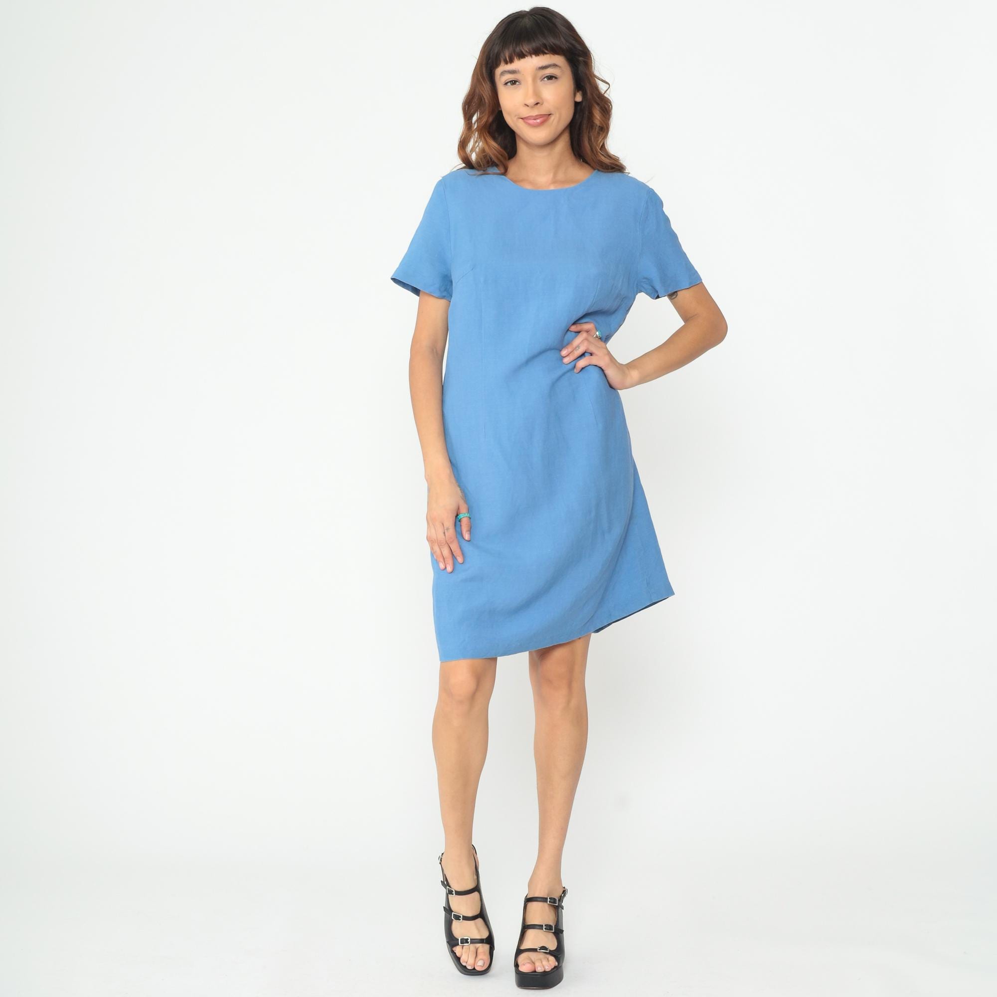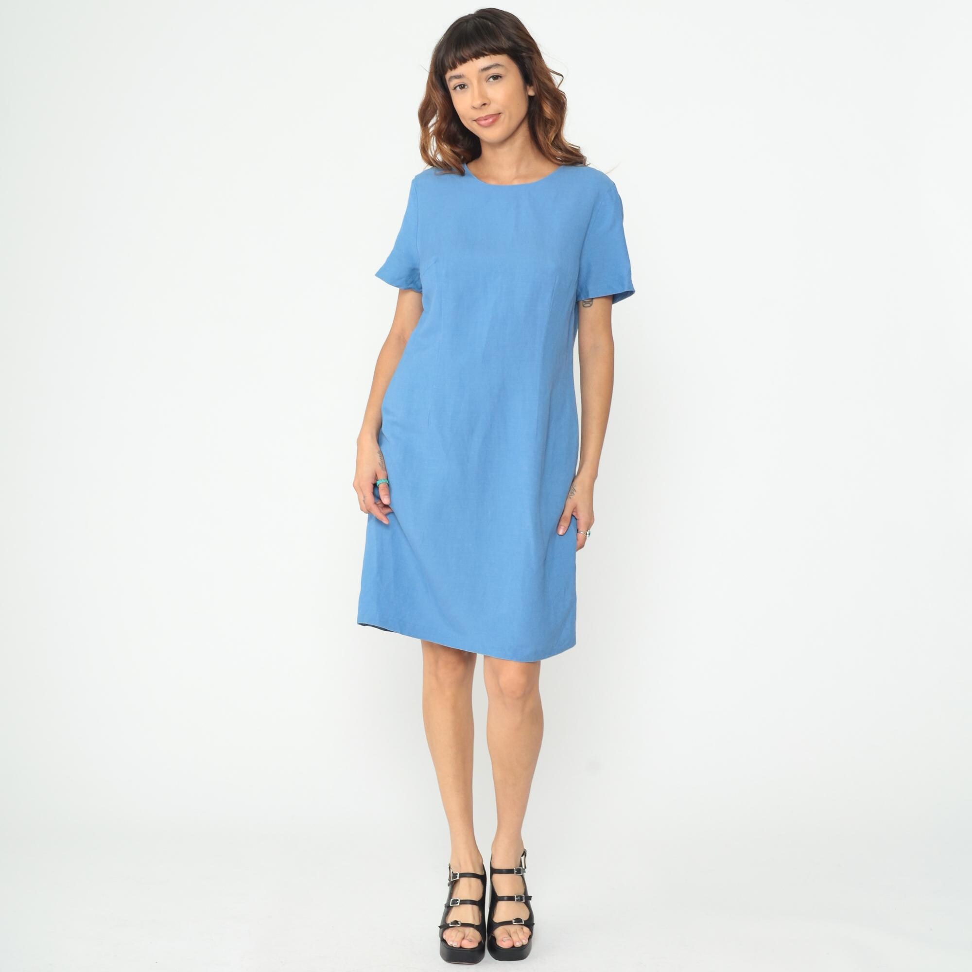Y2K blue shift dress with clean minimalist lines and short sleeves. Simple crew neckline, straight silhouette, and back zipper closure.