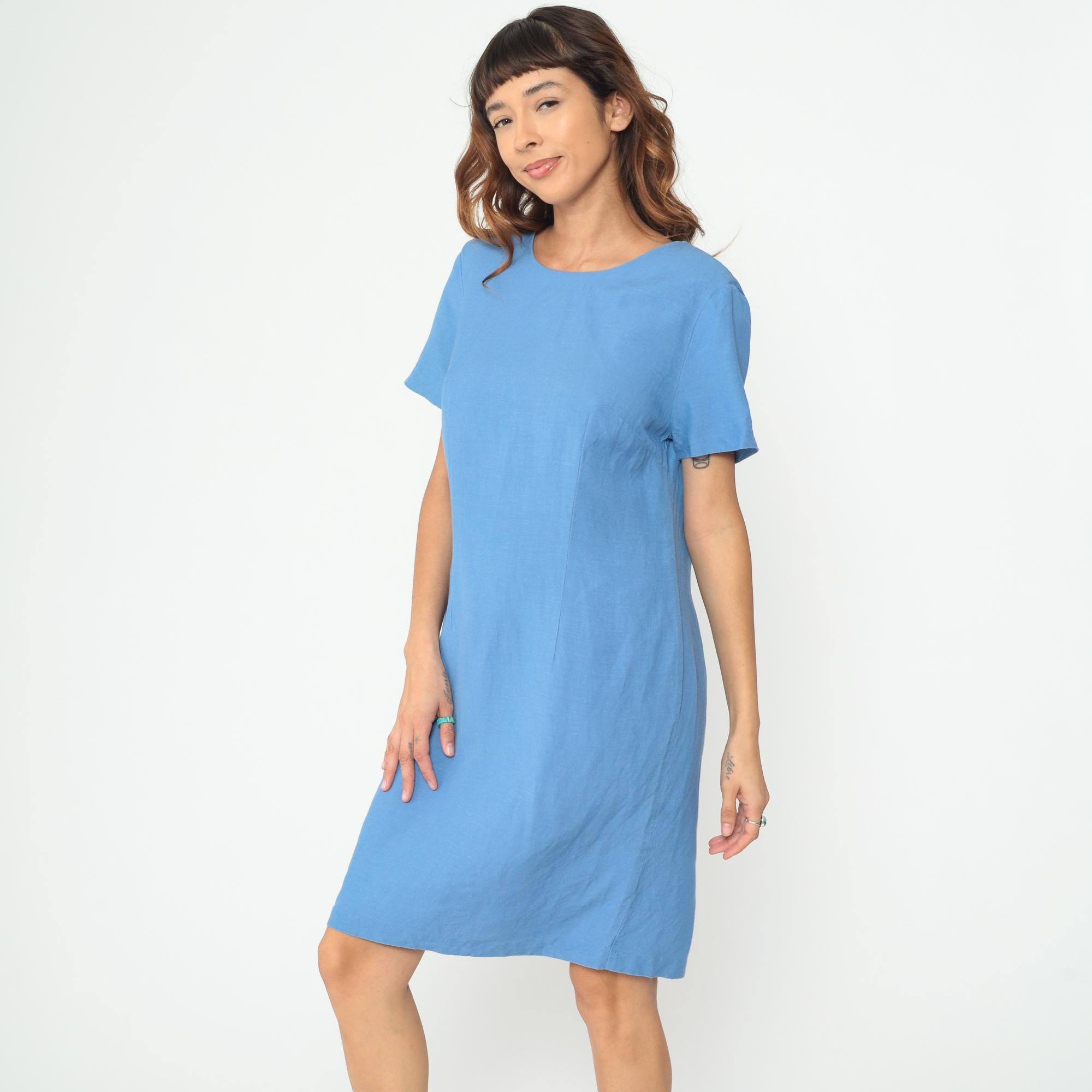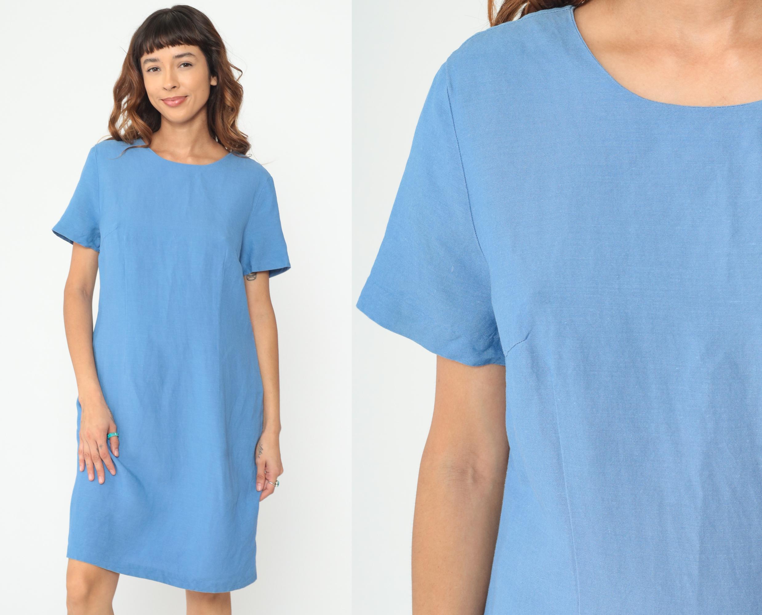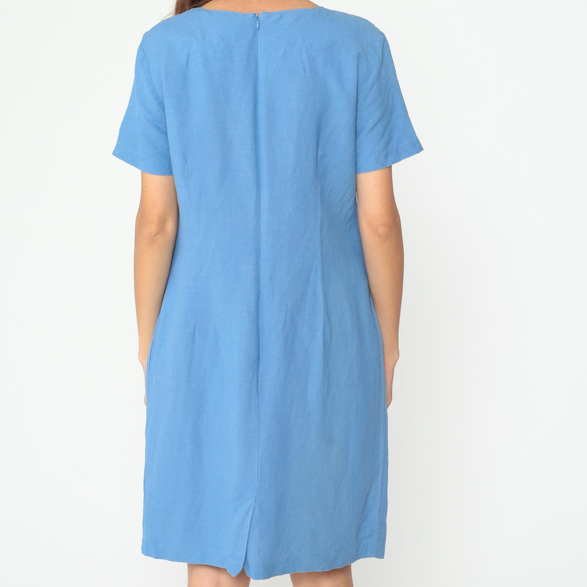 Y2K blue shift dress with clean minimalist lines and short sleeves. Simple crew neckline, straight silhouette, and back zipper closure.