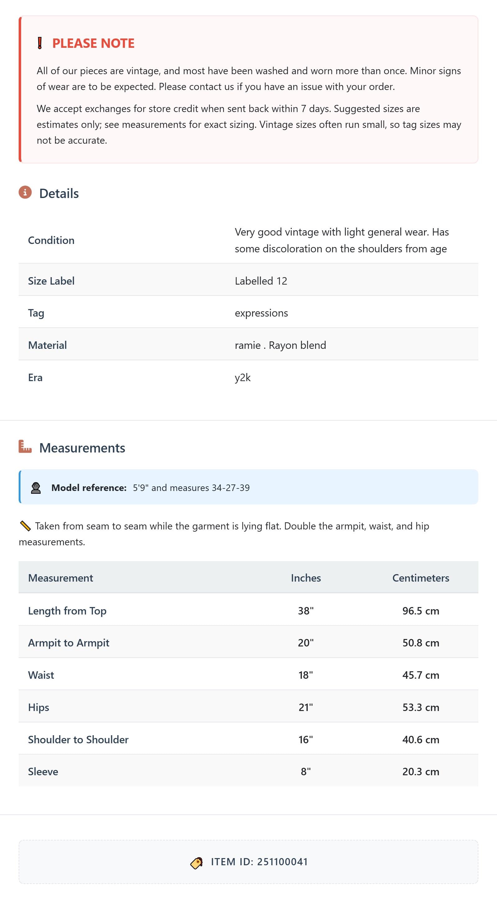 All of our pieces are vintage, and most have been washed and worn more than once. Minor signs of wear are to be expected. Please contact us if you have an issue with your order. We accept exchanges for store credit when sent back within 7 days.