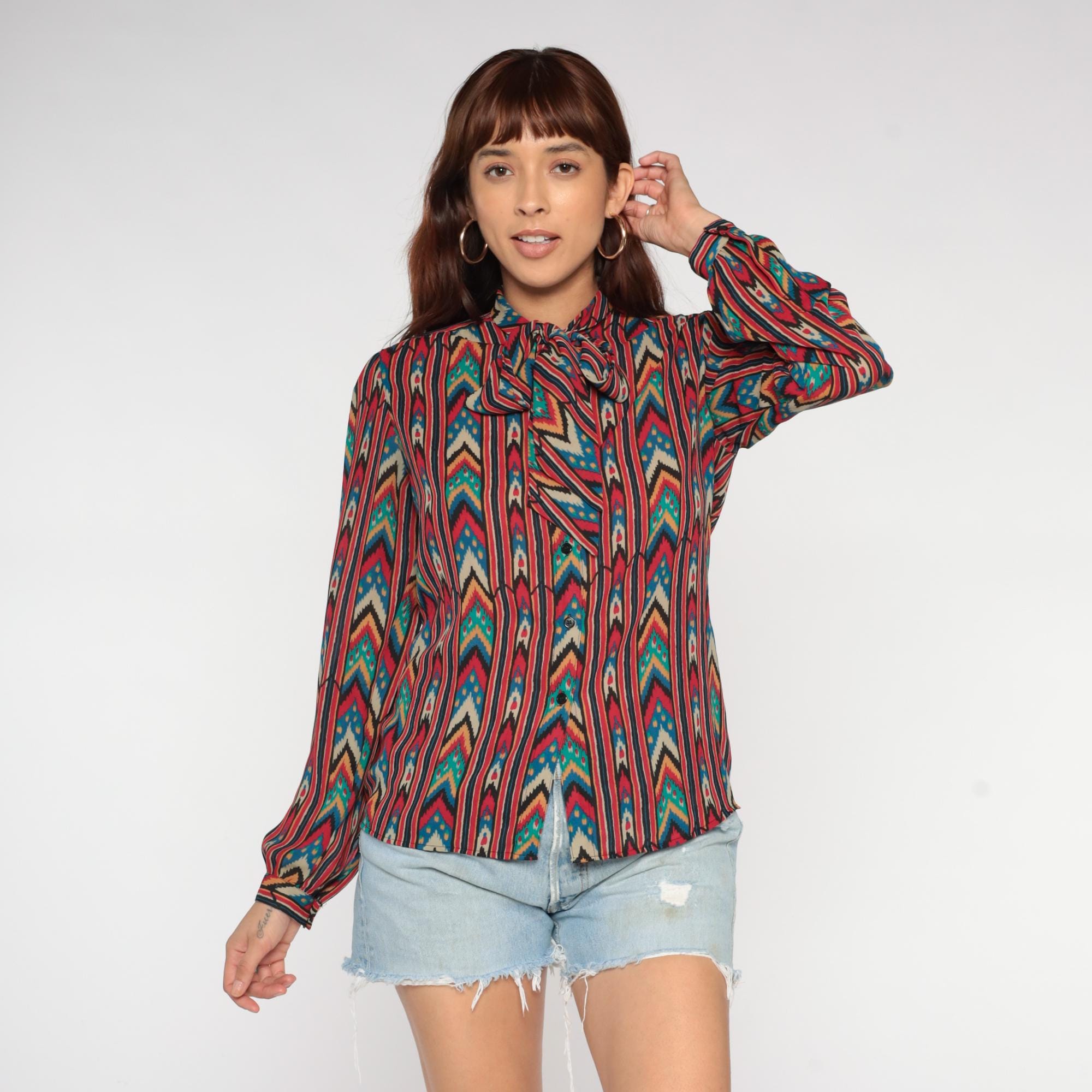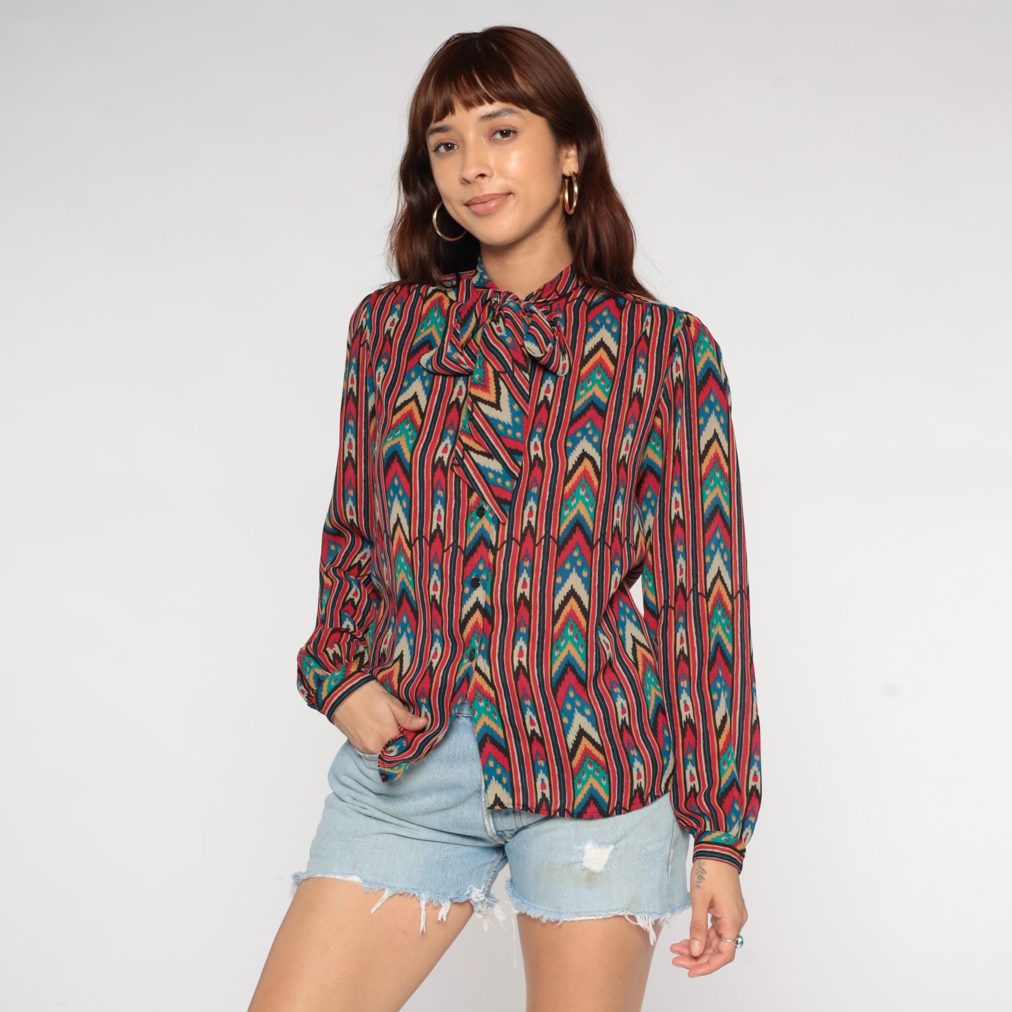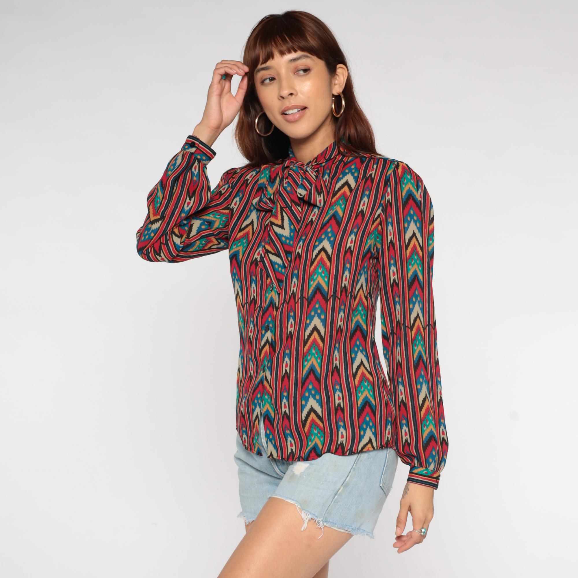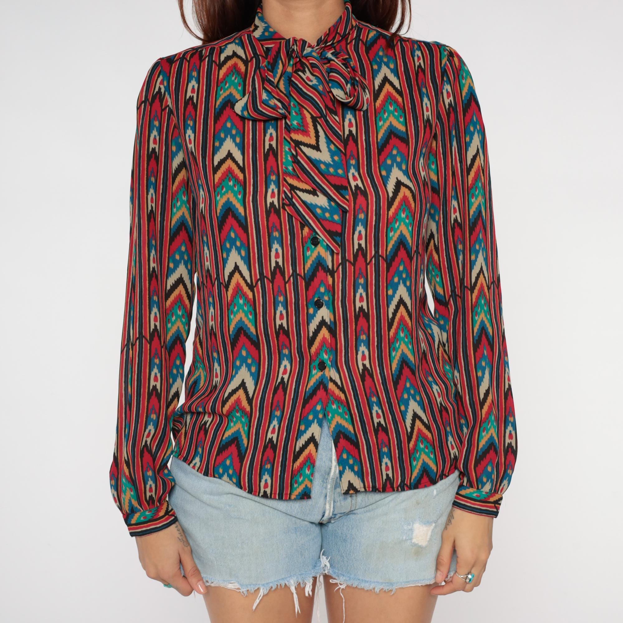 90s Regina Porter blouse in vibrant geometric chevron print with vertical striping in red, teal, blue, cream, yellow, and burgundy. Button front closure with attached neck tie that creates a bow detail. Long sleeves with elasticated cuffs, fitted at the wrists. Collared neckline.