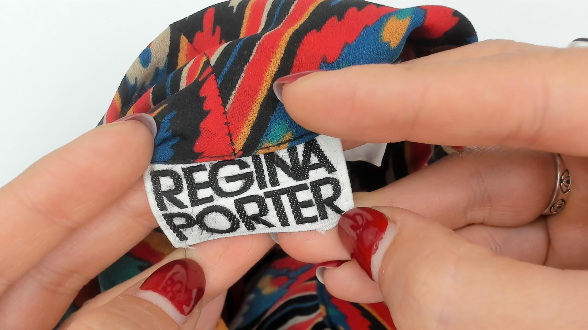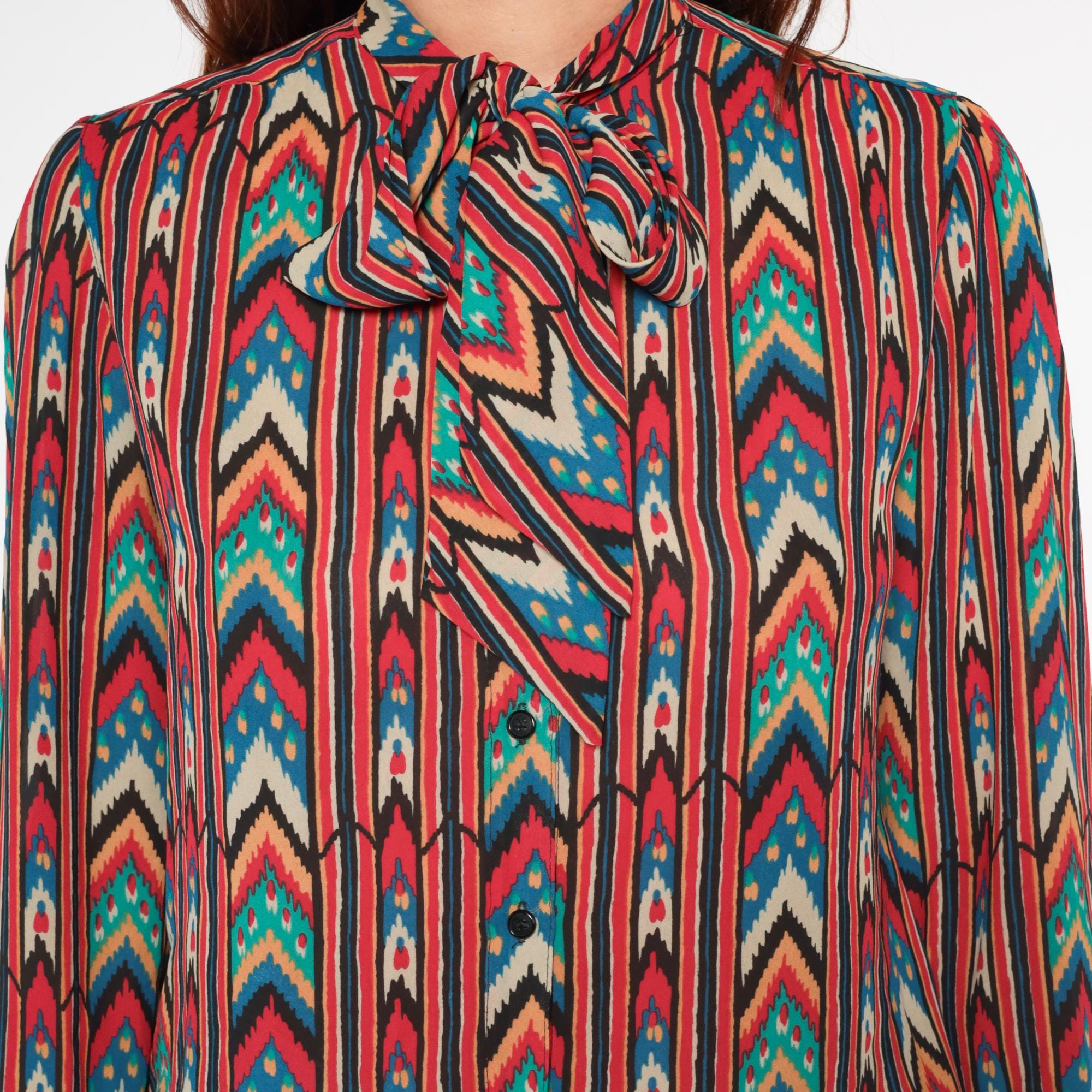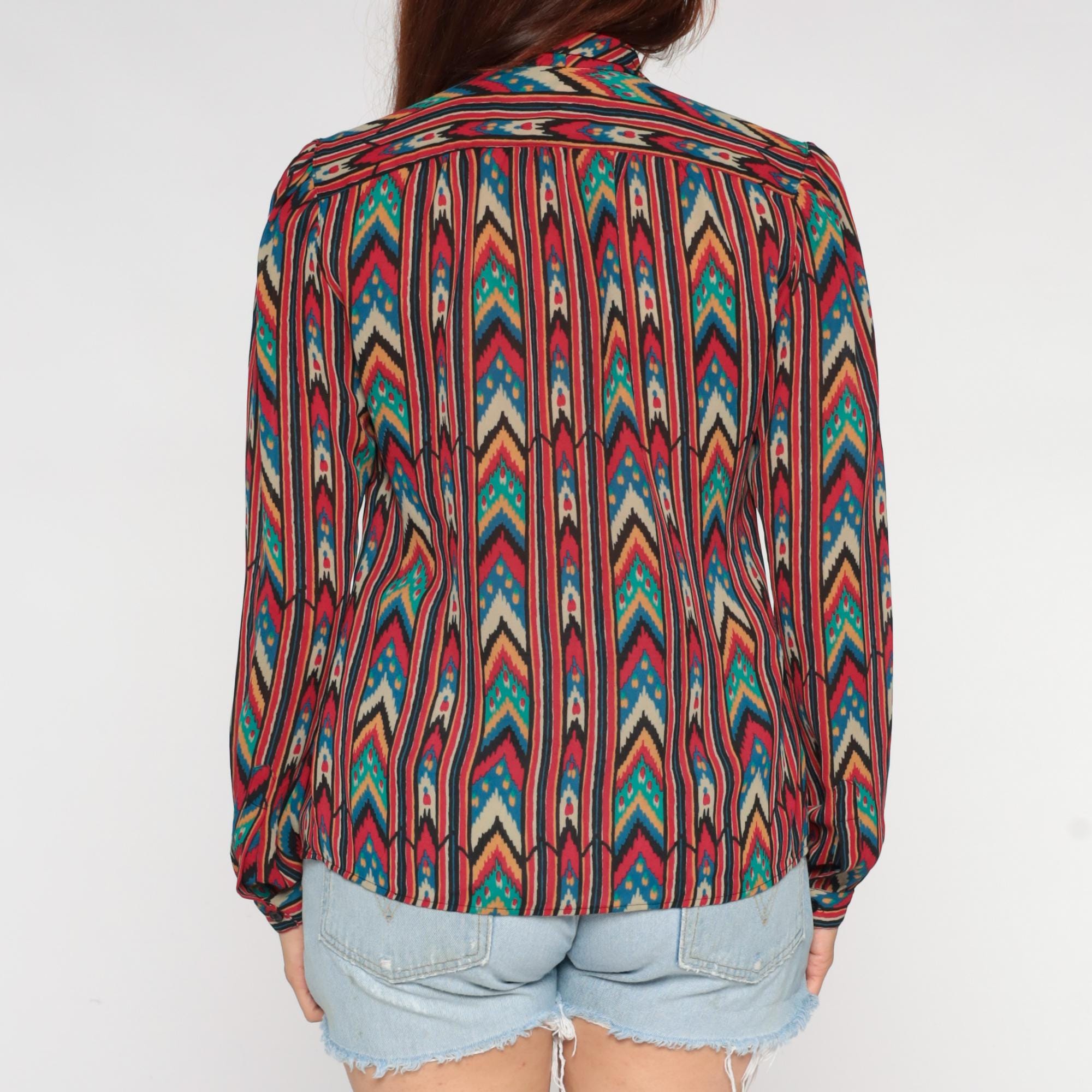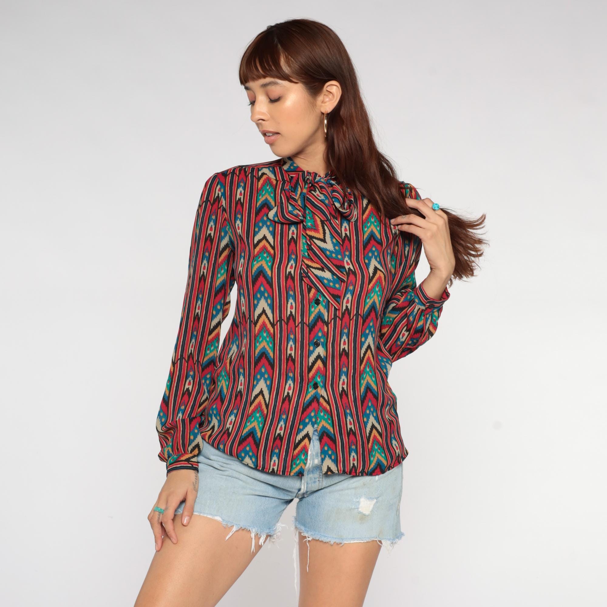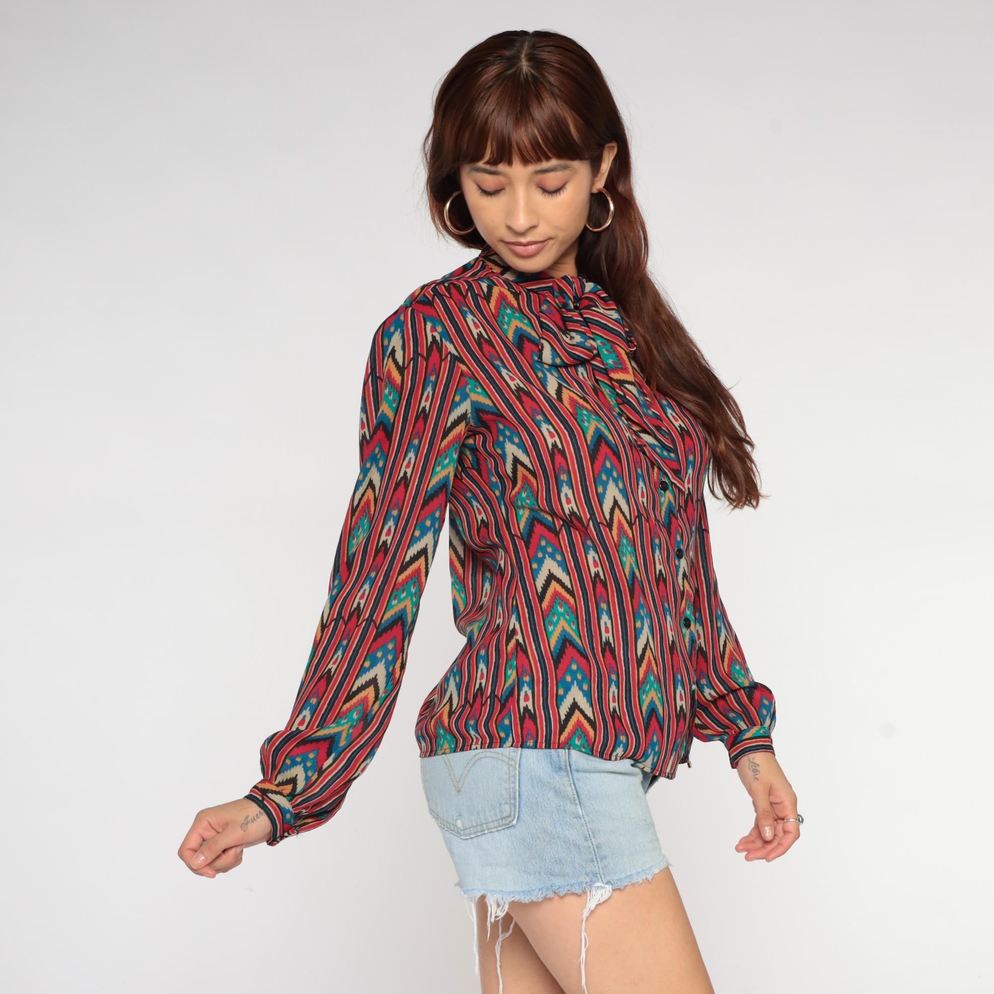 90s Regina Porter blouse in vibrant geometric chevron print with vertical striping in red, teal, blue, cream, yellow, and burgundy. Button front closure with attached neck tie that creates a bow detail. Long sleeves with elasticated cuffs, fitted at the wrists. Collared neckline.