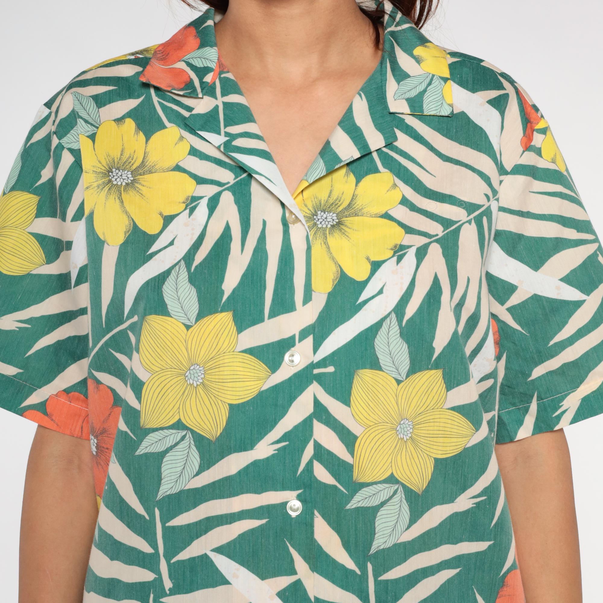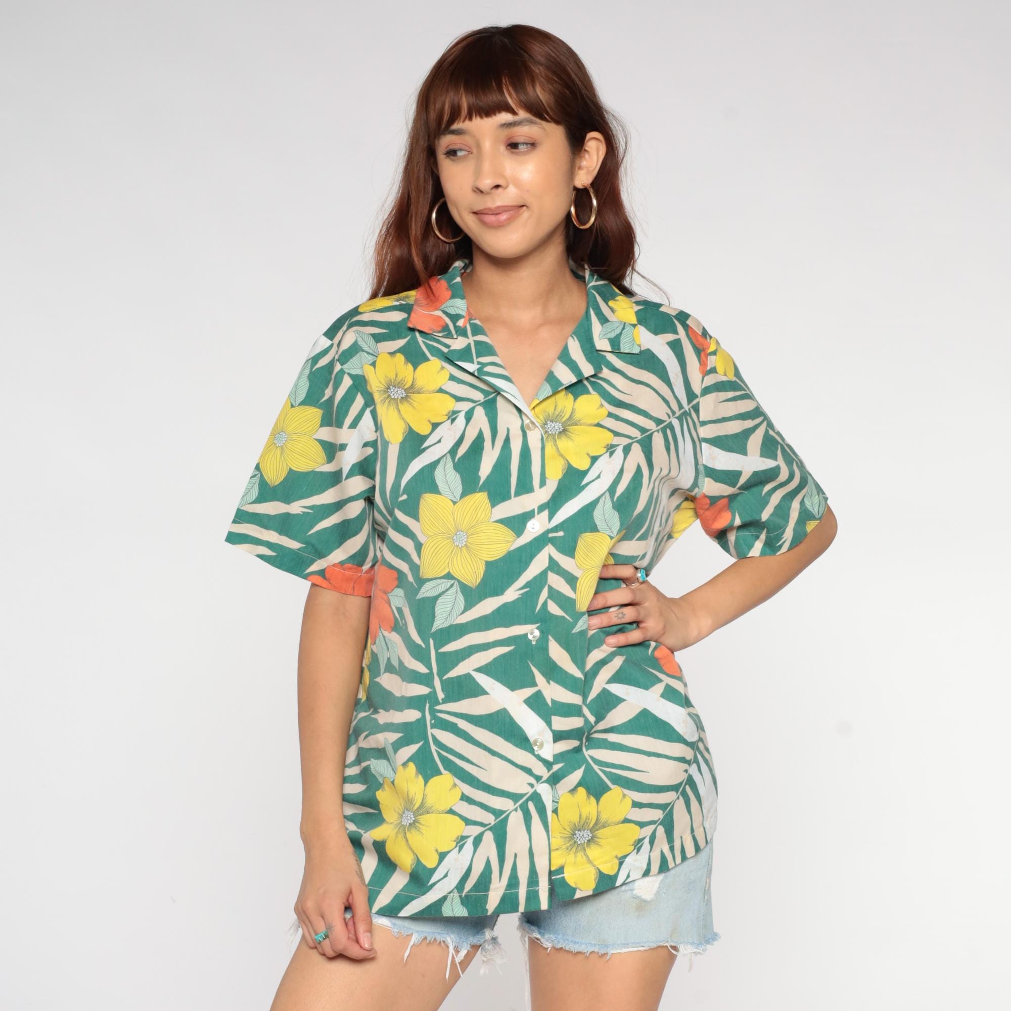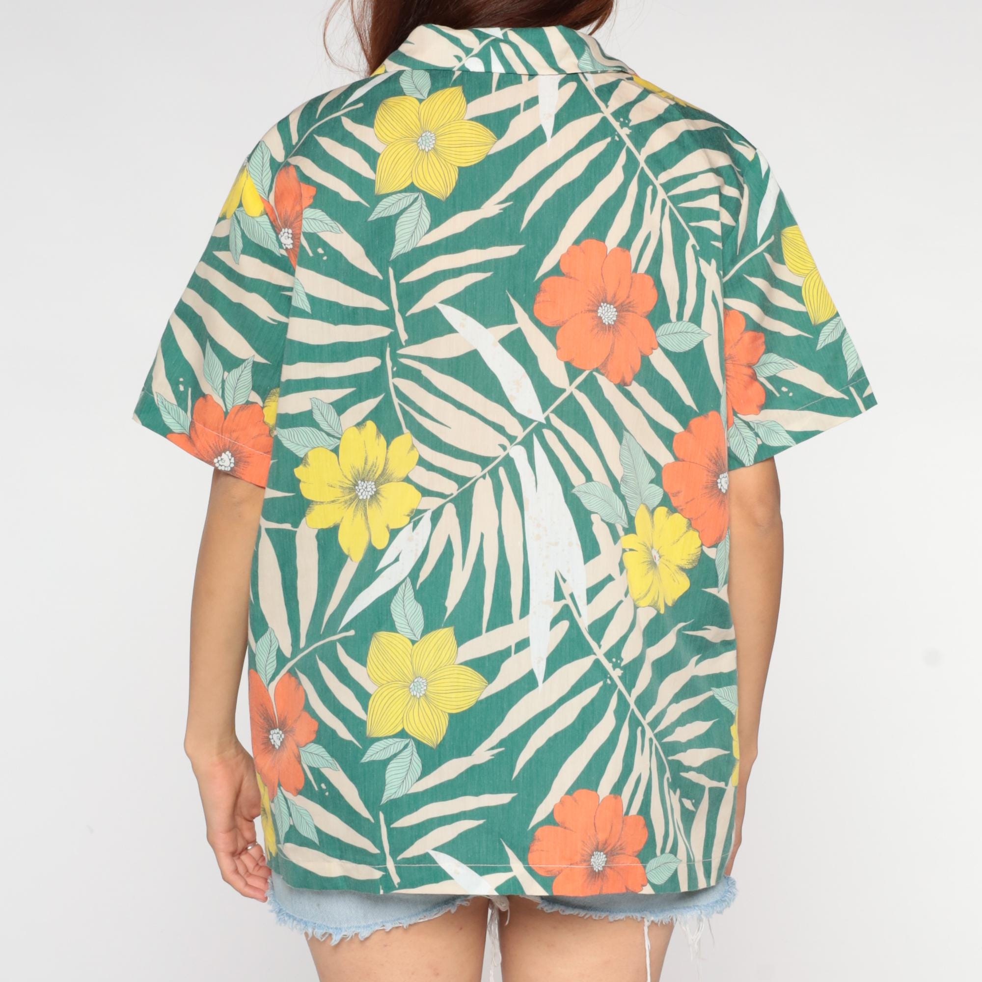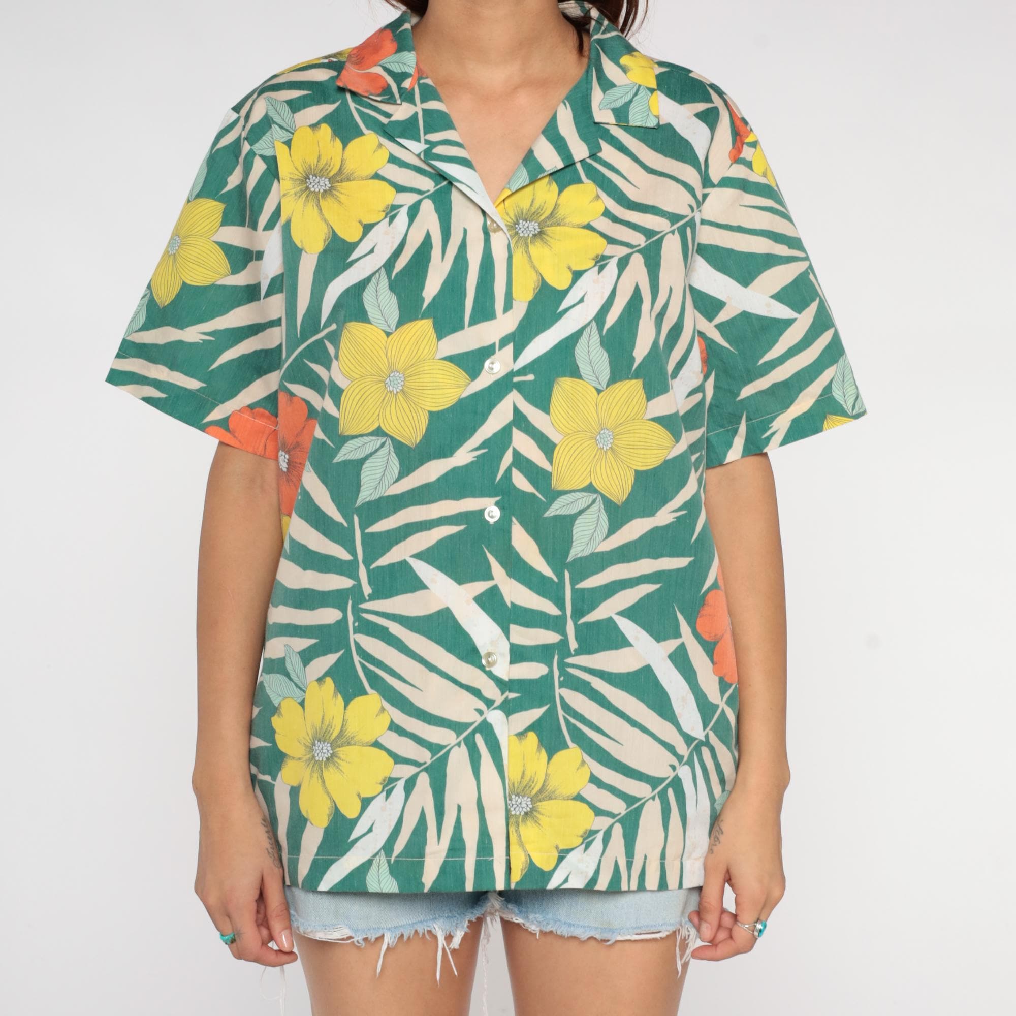 90s Hawaiian button-up shirt in vibrant tropical print, featuring green palm leaves, yellow and orange hibiscus flowers across a cream background. Relaxed fit with short sleeves, pointed collar, and front button closure.