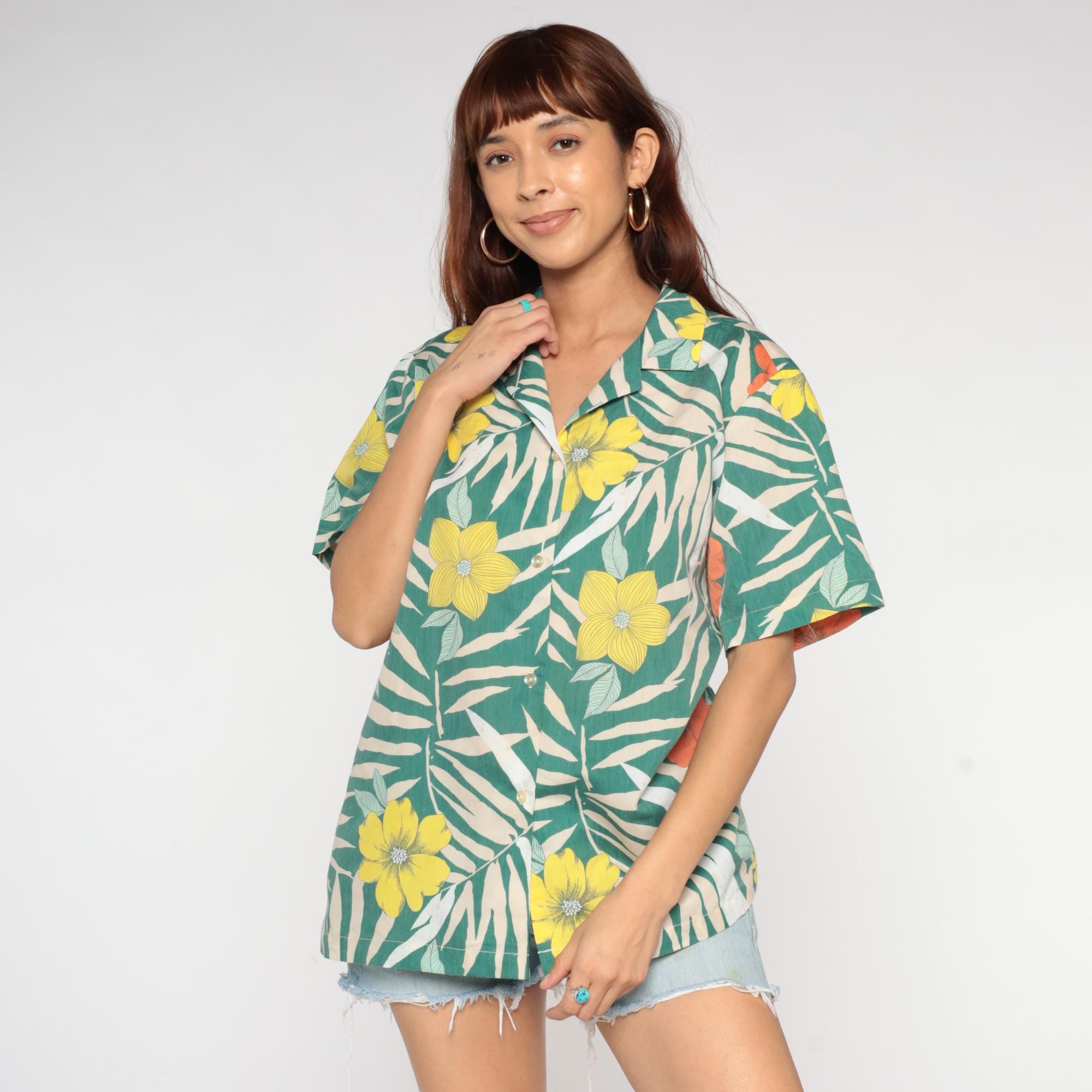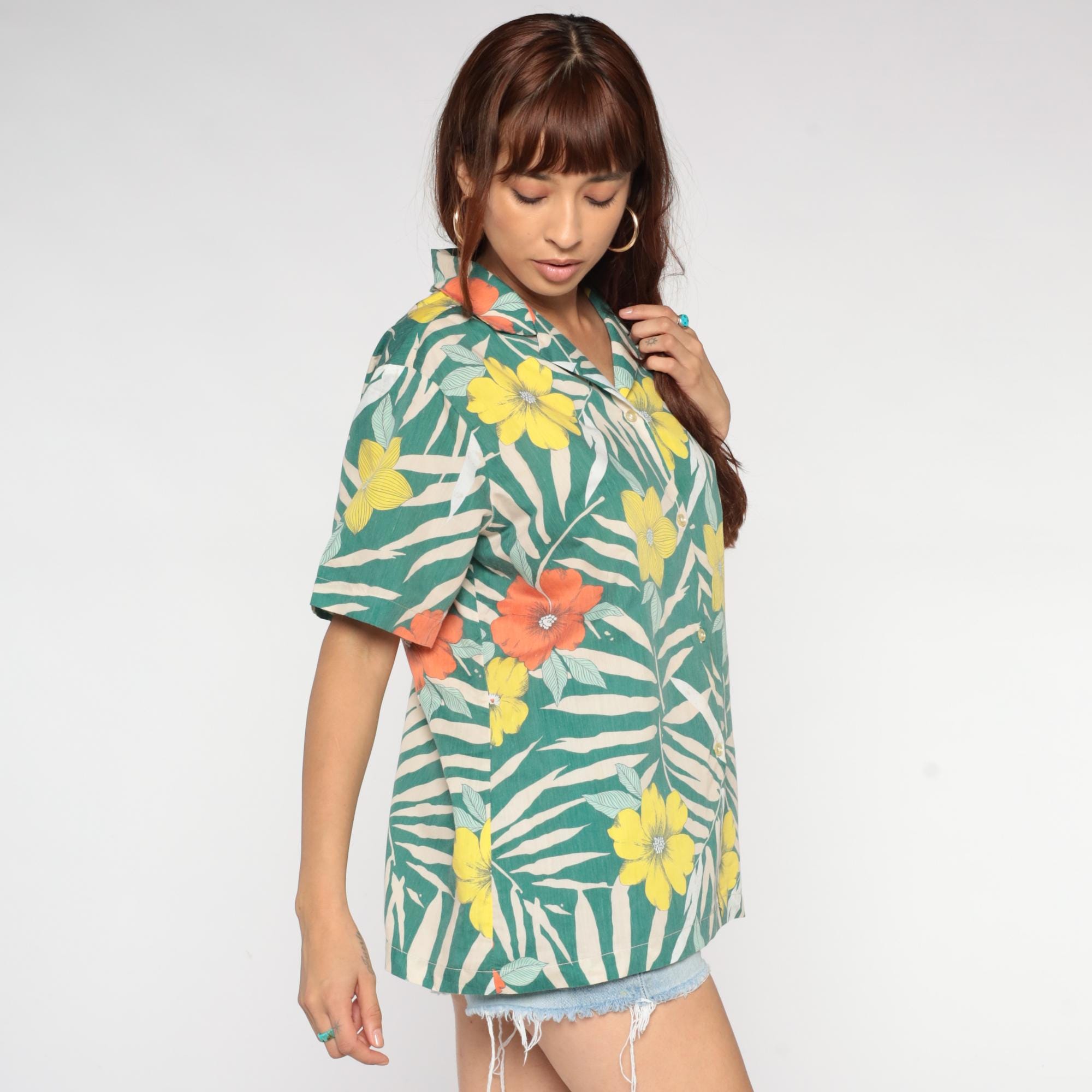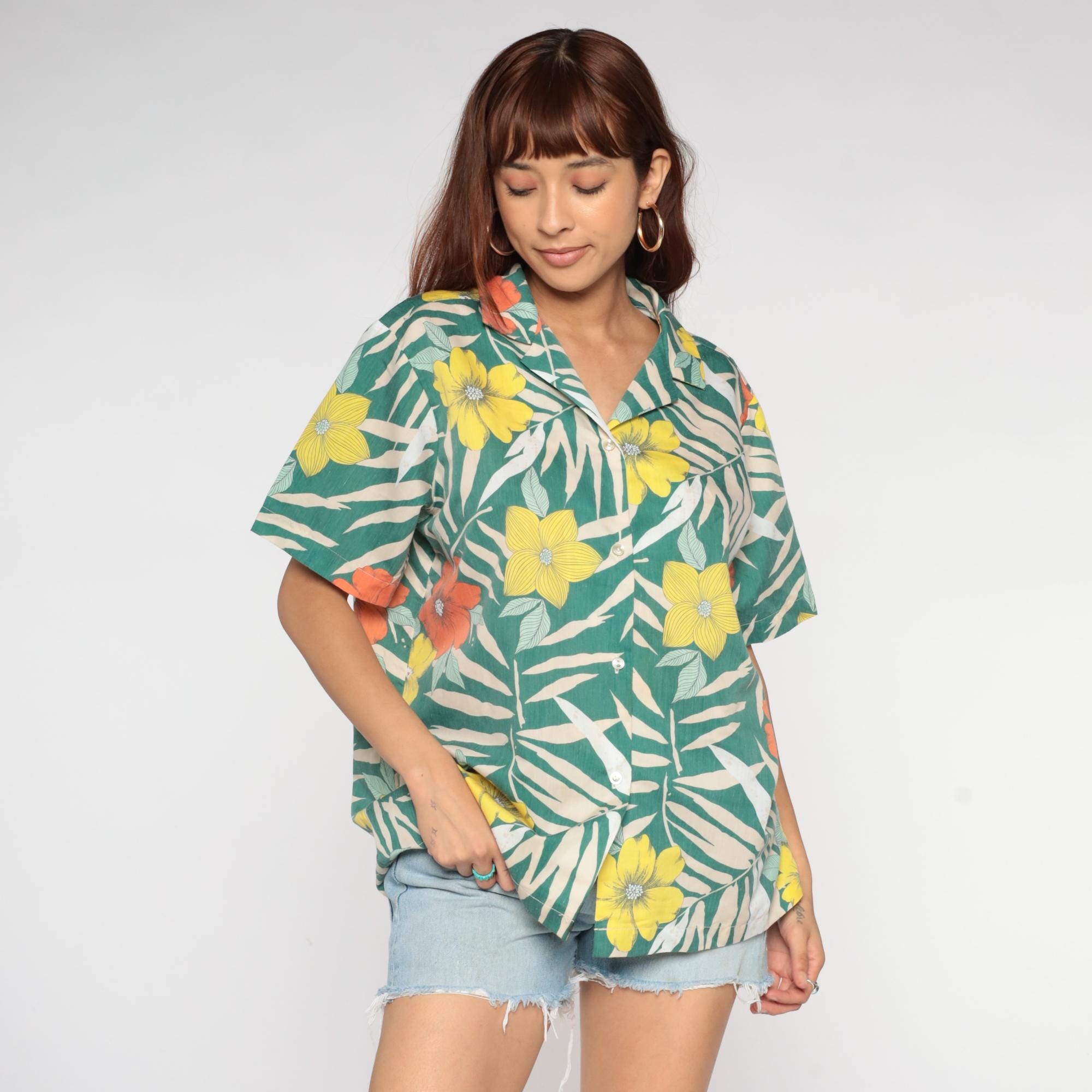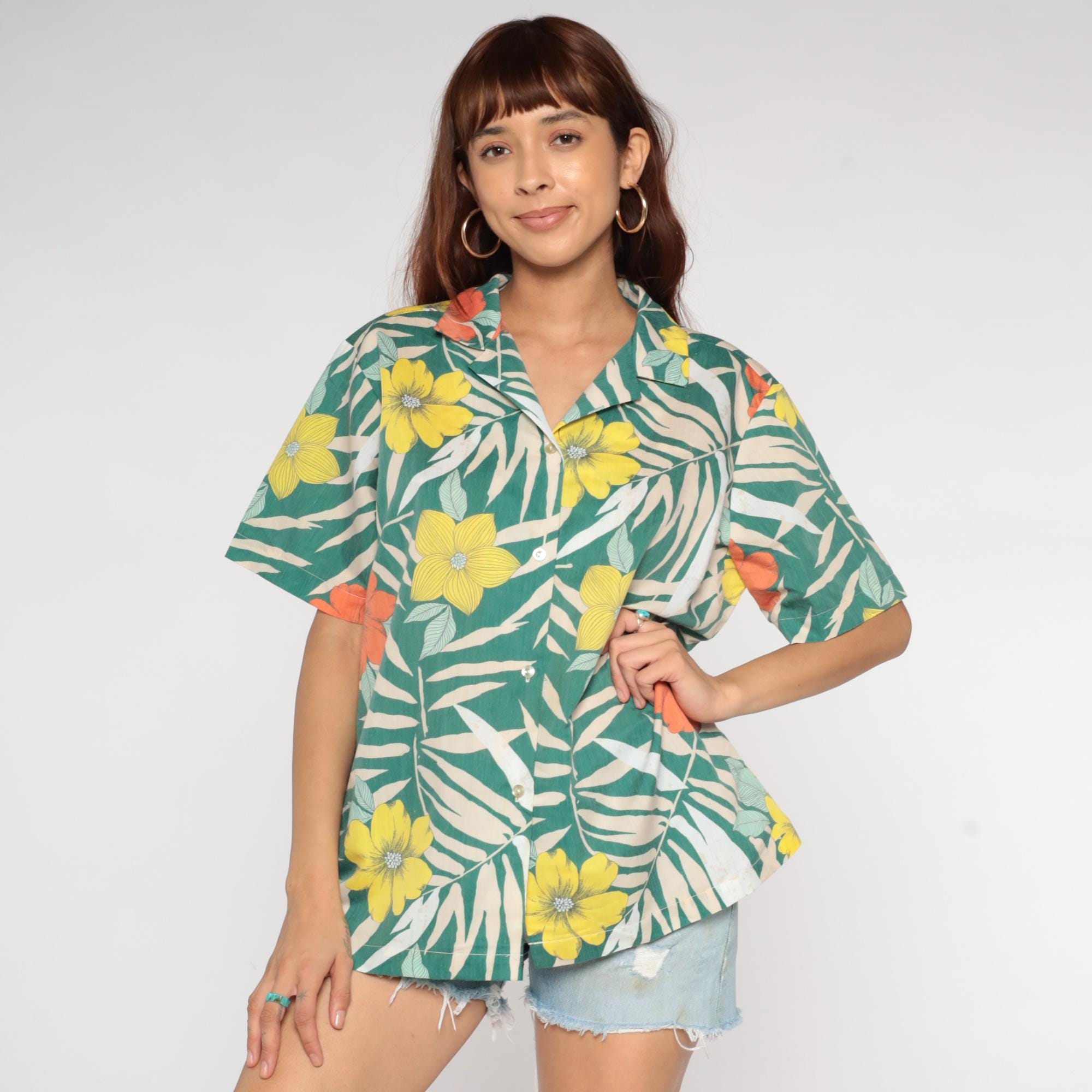90s Hawaiian button-up shirt in vibrant tropical print, featuring green palm leaves, yellow and orange hibiscus flowers across a cream background. Relaxed fit with short sleeves, pointed collar, and front button closure.