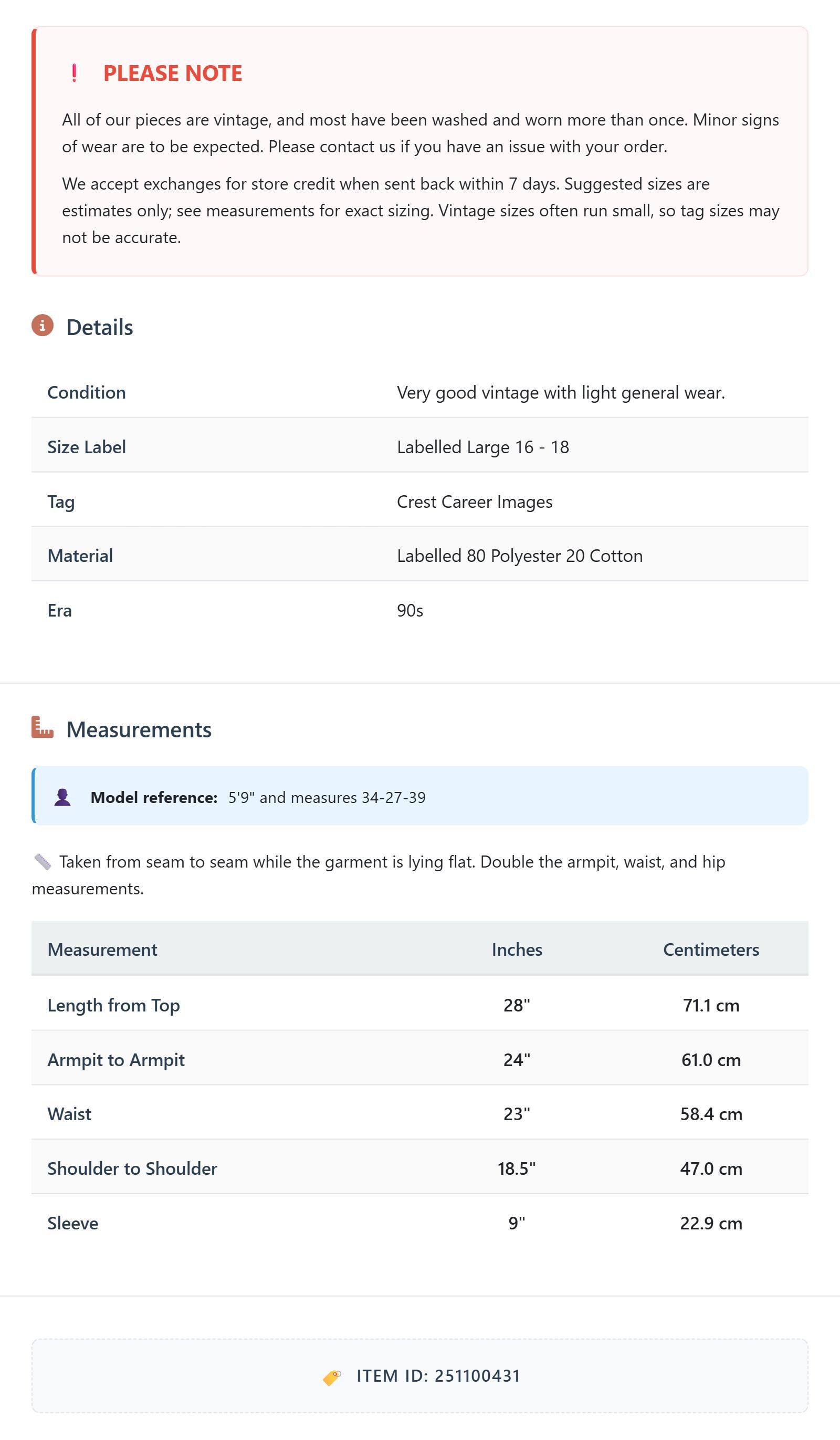 Suggested sizes are estimates only; see measurements for exact sizing. Vintage sizes often run small, so tag sizes may not be accurate.