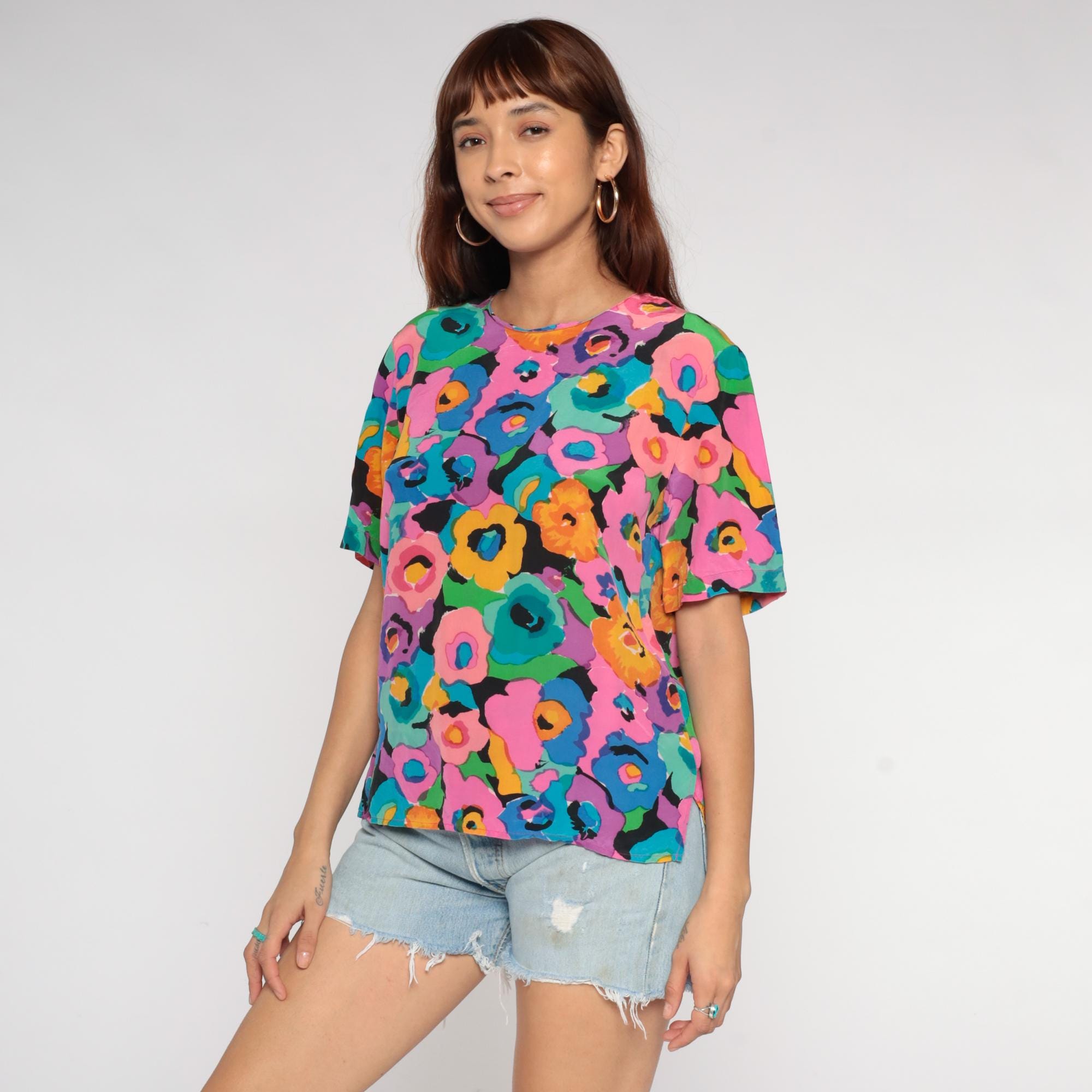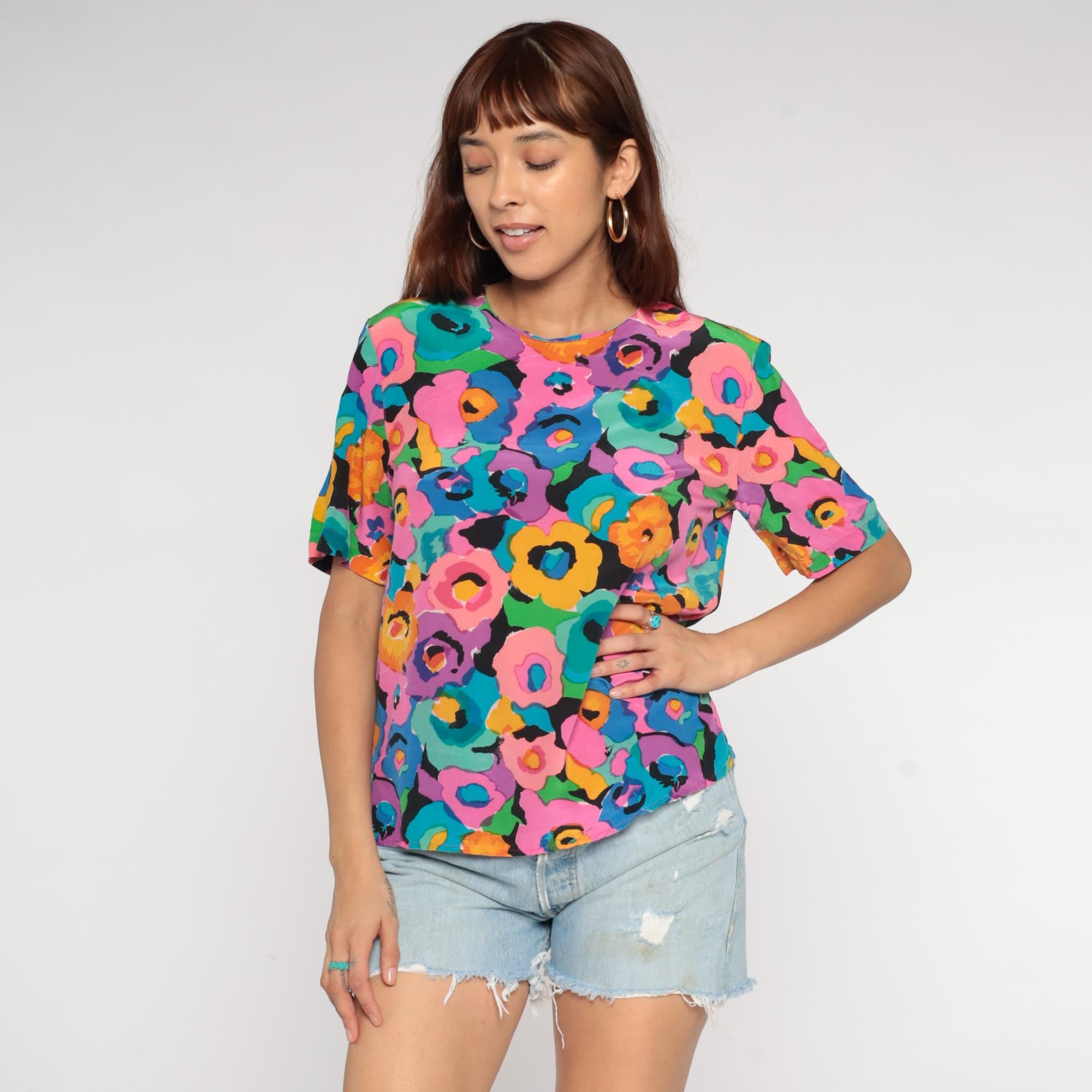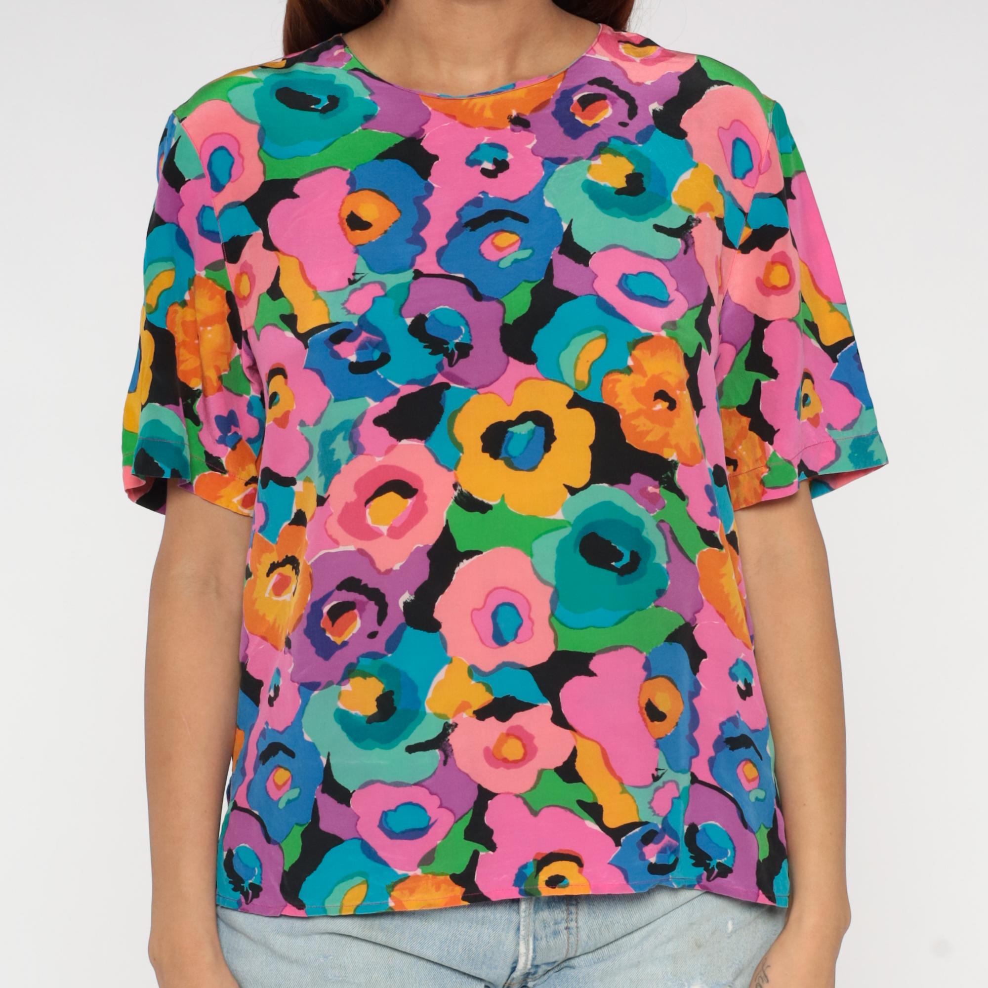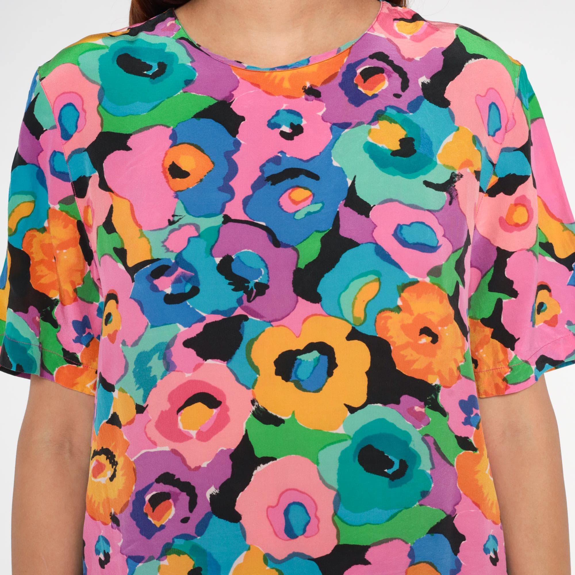 90s silk top with vibrant abstract floral print from Spencer Jeremy, featuring bold pink, blue, yellow, orange, green, and purple flowers across a black background. Short sleeves with a relaxed crew neckline and straight hem.
