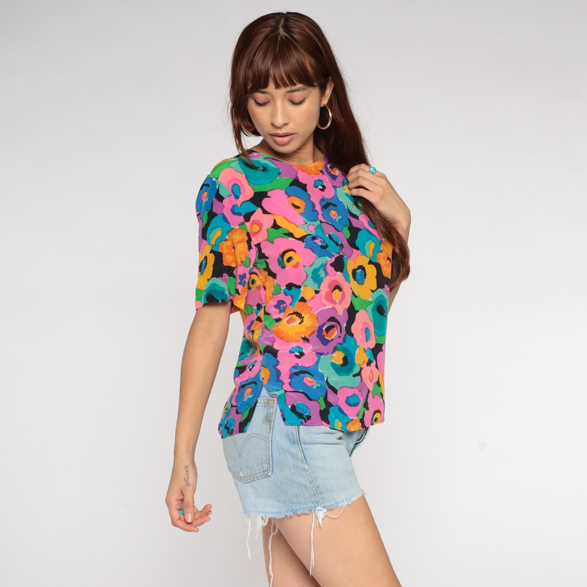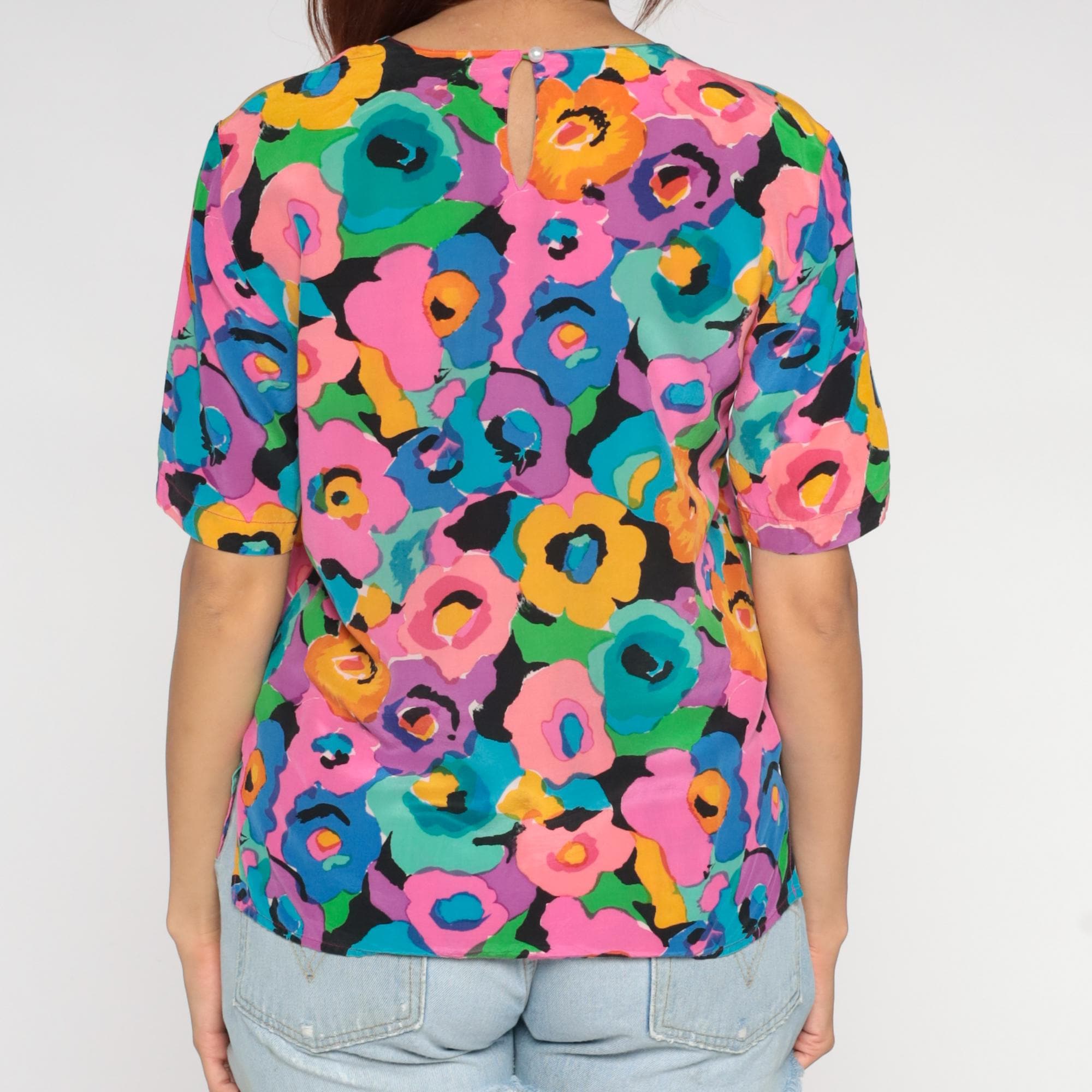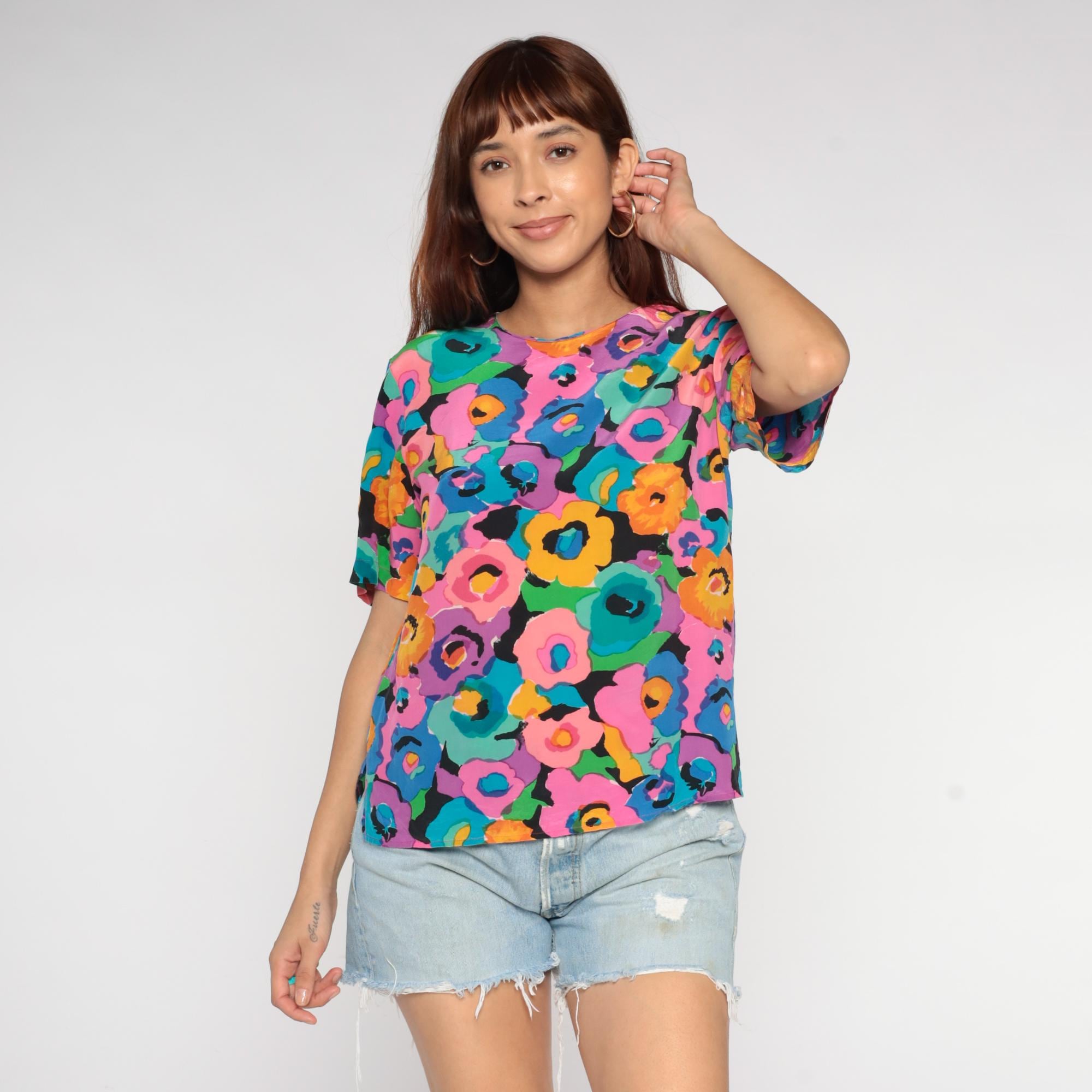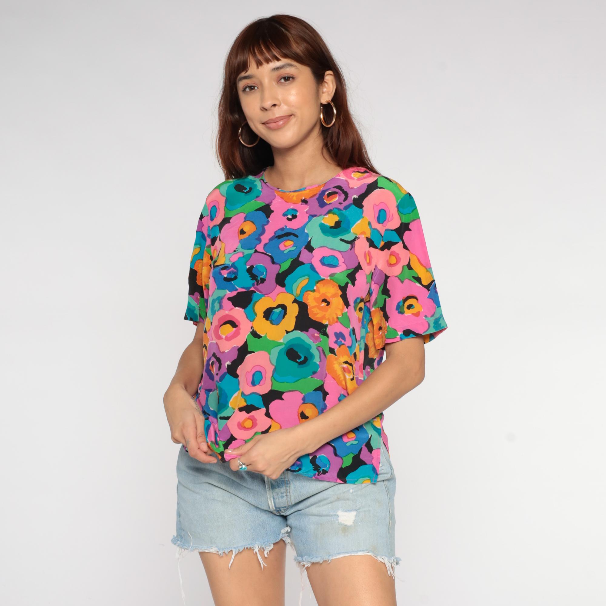 90s silk top with vibrant abstract floral print from Spencer Jeremy, featuring bold pink, blue, yellow, orange, green, and purple flowers across a black background. Short sleeves with a relaxed crew neckline and straight hem.