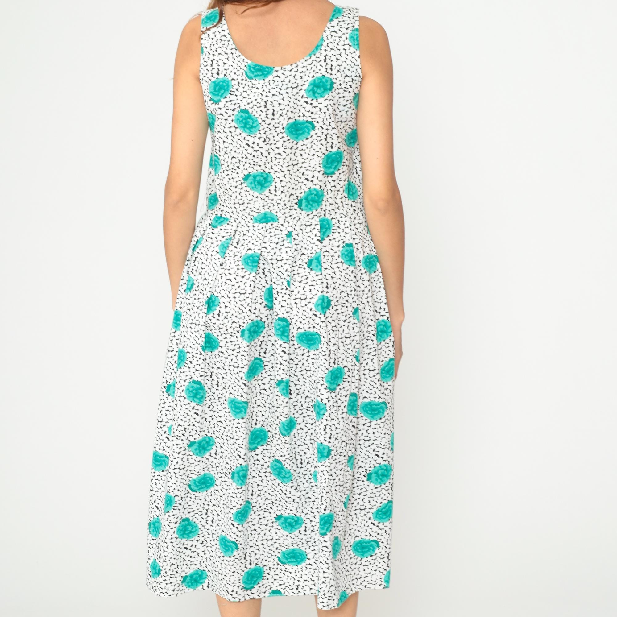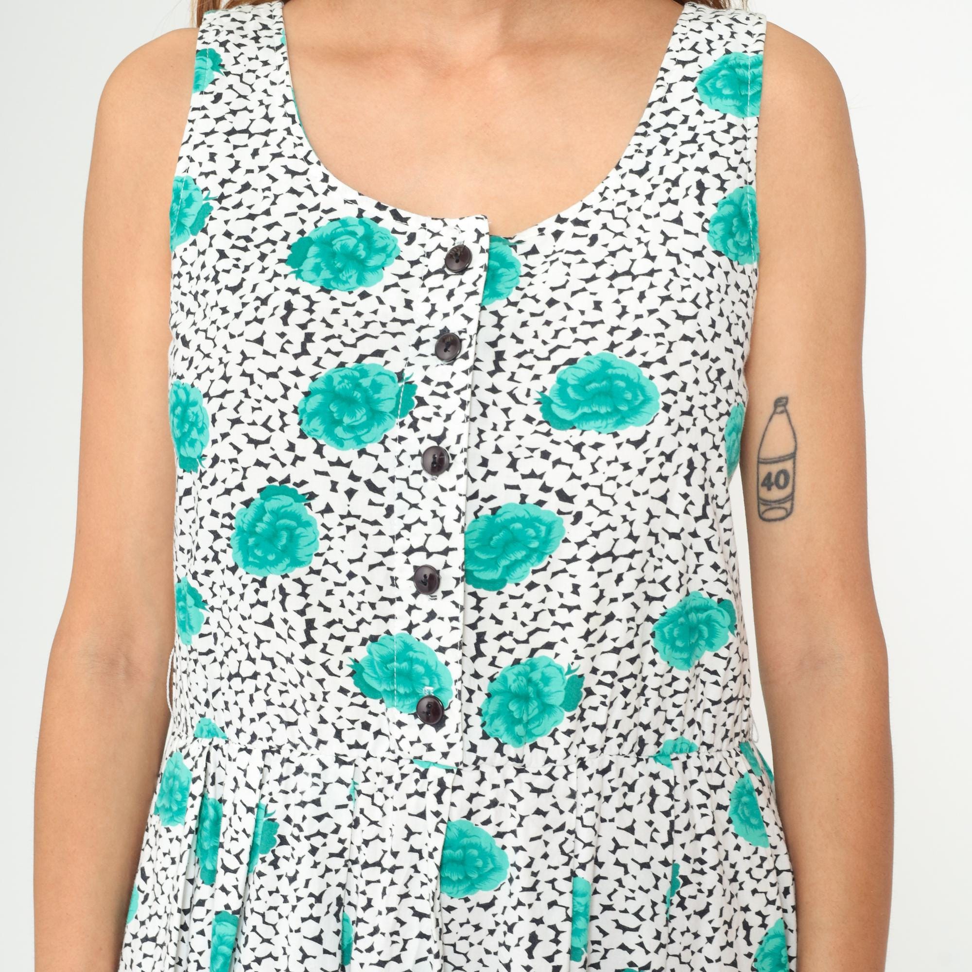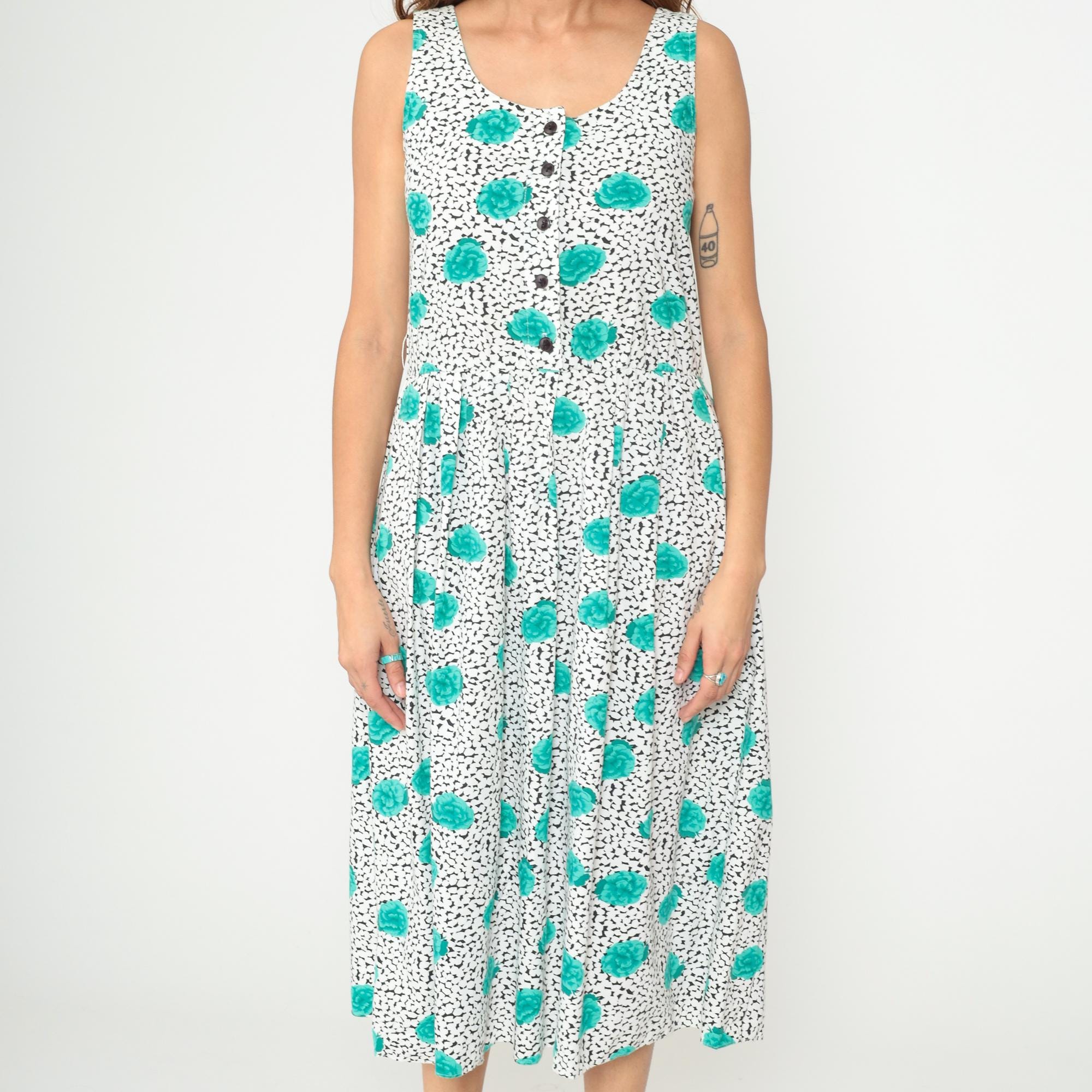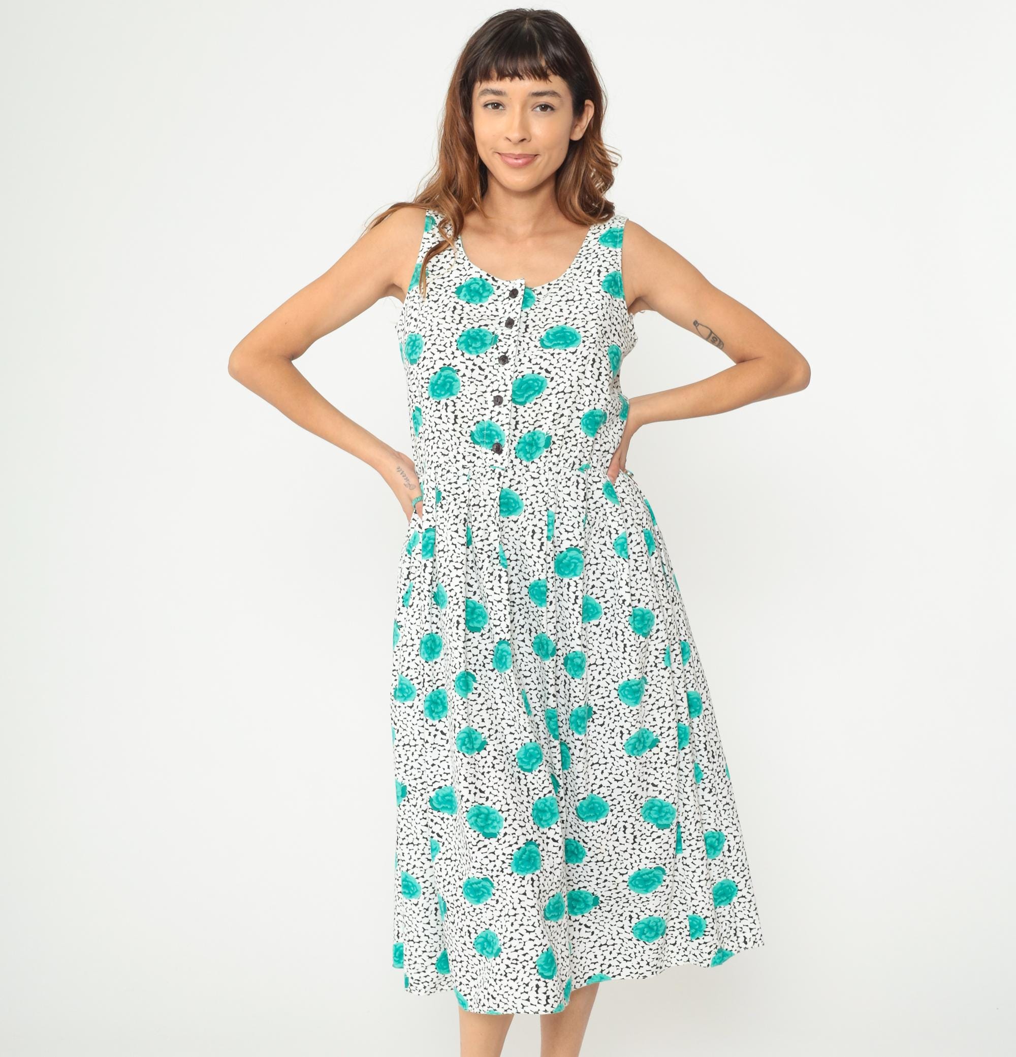 80s white midi dress with black spotted pattern and turquoise floral print throughout. Button front closure with black buttons, sleeveless design with rounded neckline. Relaxed fit through the body with midi length hem.