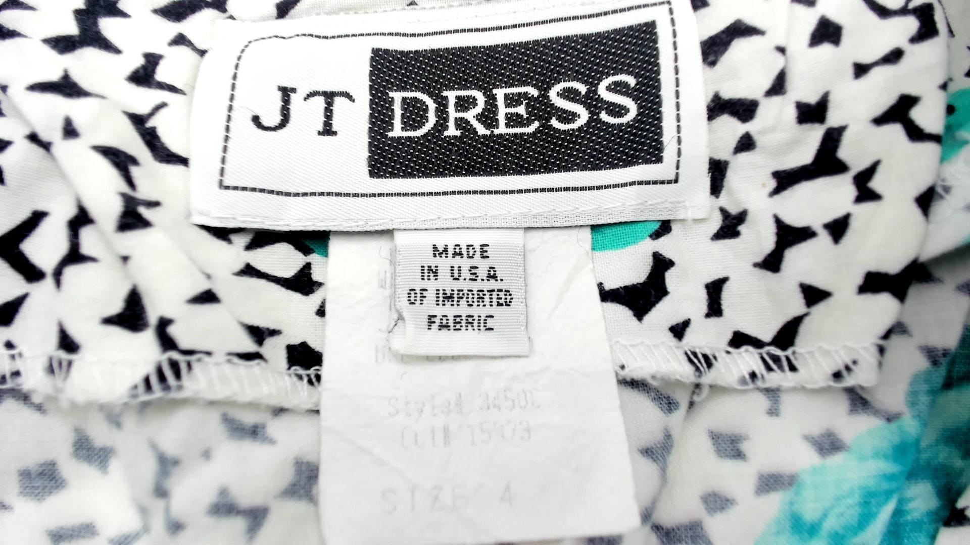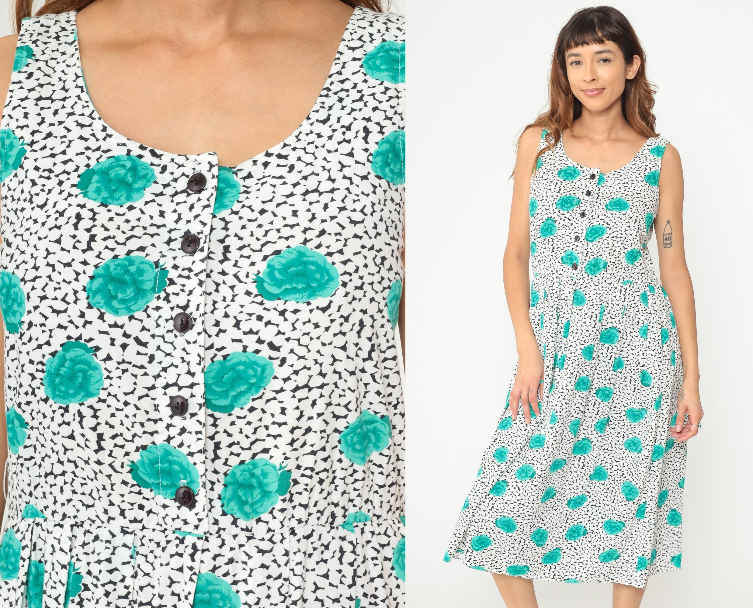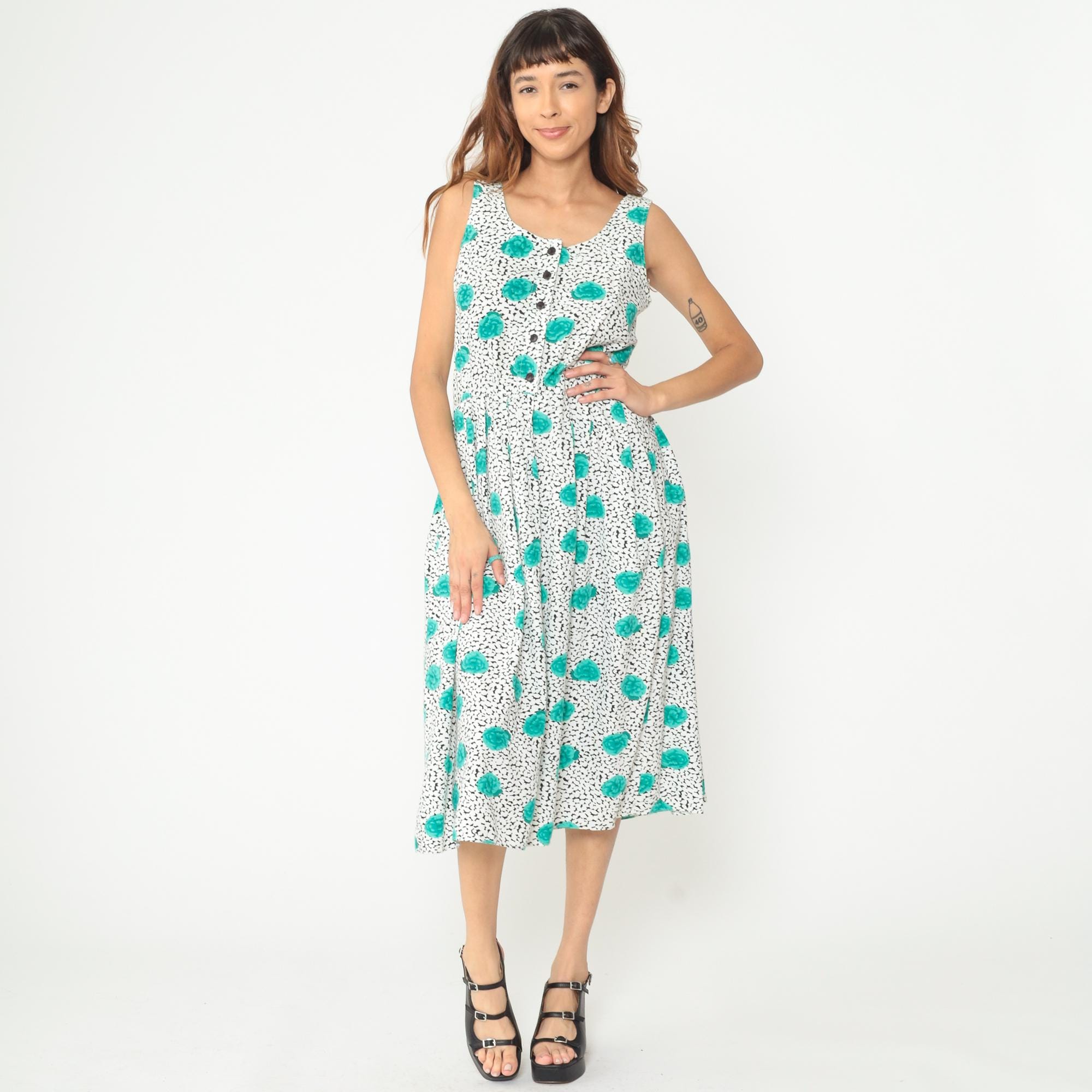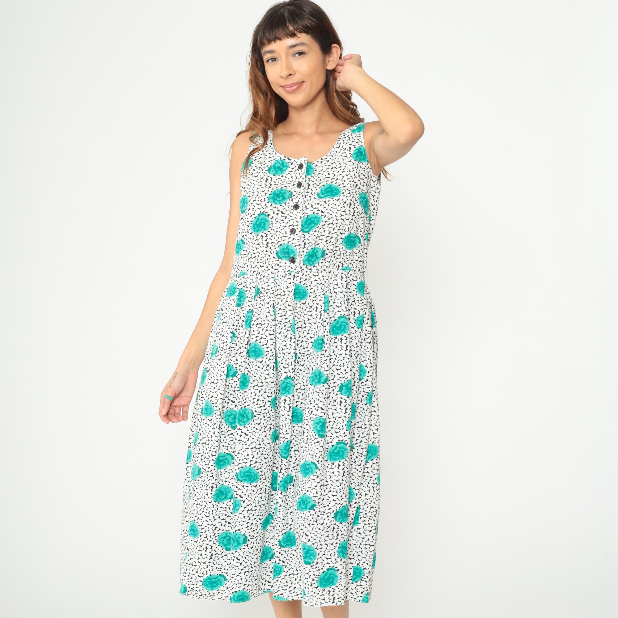 80s white midi dress with black spotted pattern and turquoise floral print throughout. Button front closure with black buttons, sleeveless design with rounded neckline. Relaxed fit through the body with midi length hem.