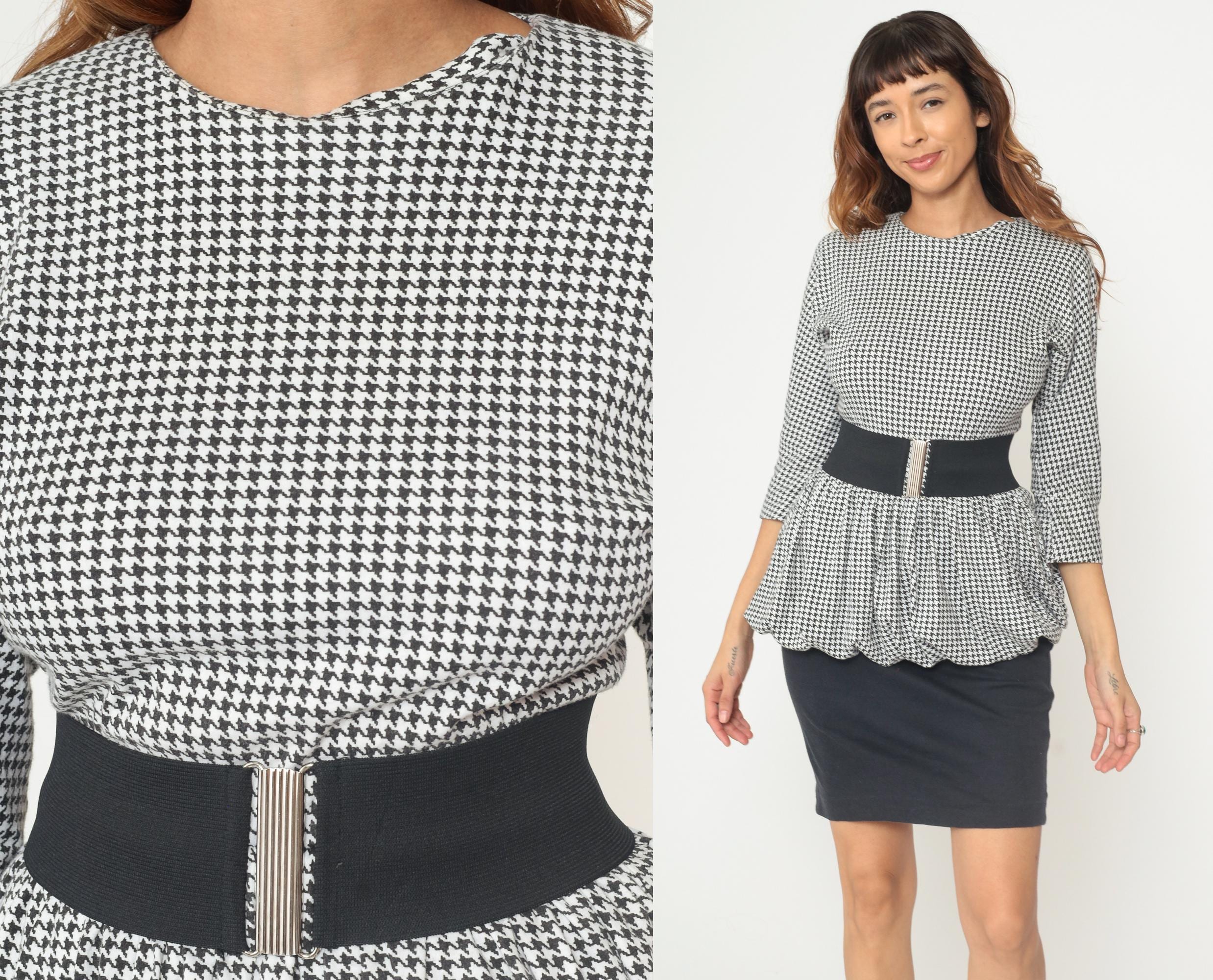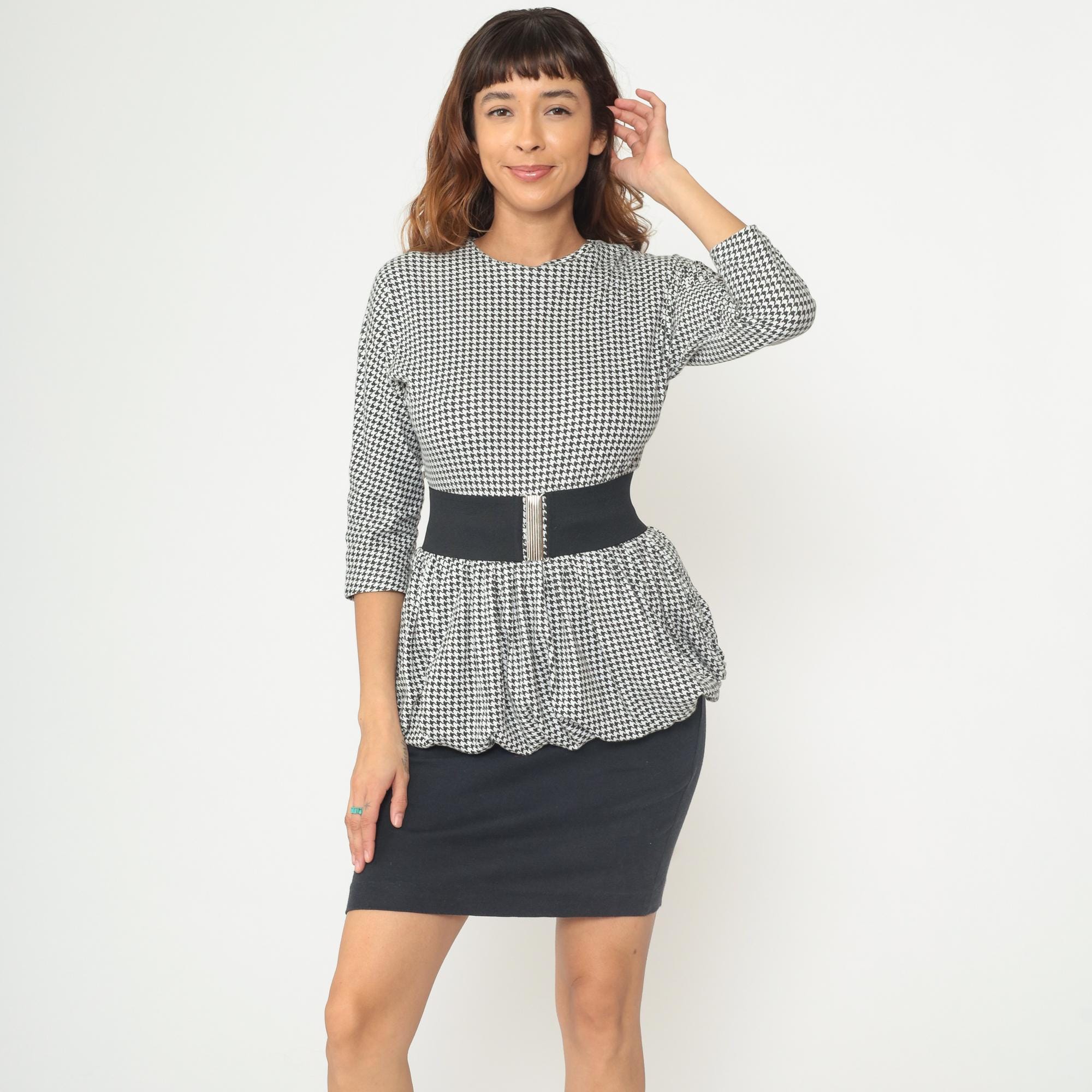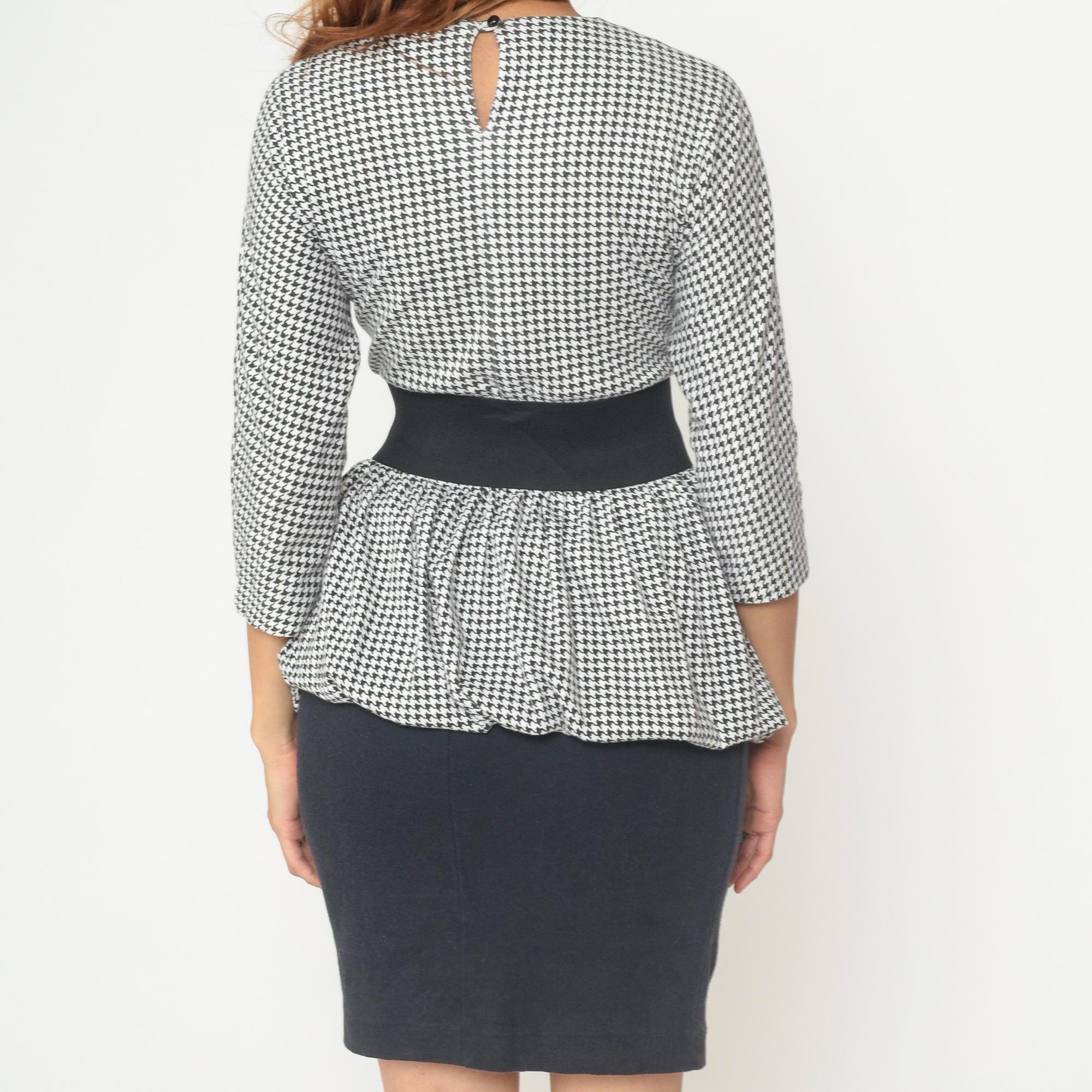 80s black and white houndstooth mini dress with peplum hem detail and detachable elastic belt from dawn joy fashions. Houndstooth pattern on the top portion with three-quarter length sleeves and a small keyhole opening with button closure at the back neckline. Scalloped peplum hem with a fitted black pencil skirt bottom. Comes with a wide black elastic belt with silver-toned metal clasp closure.