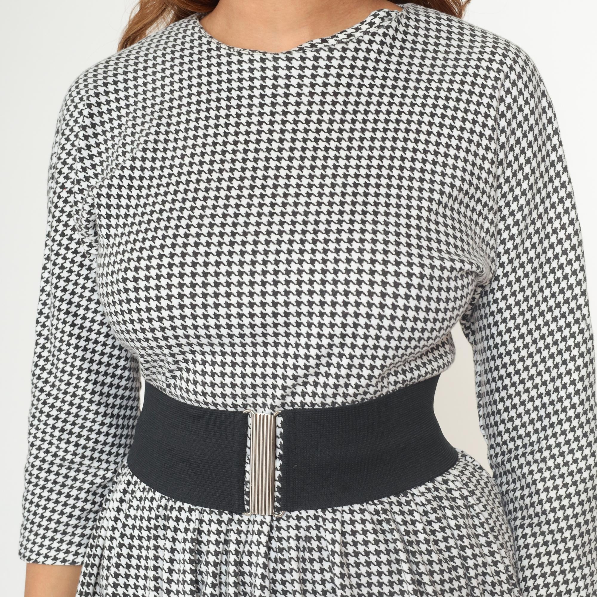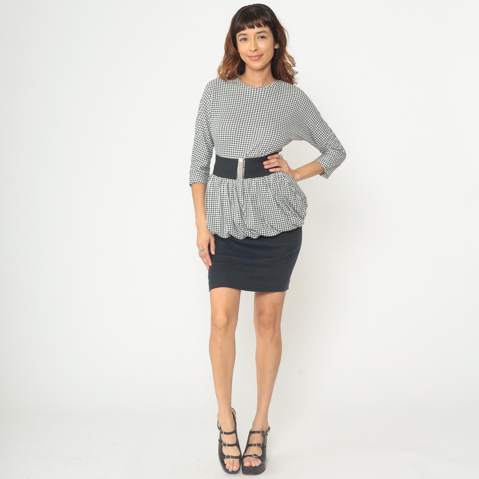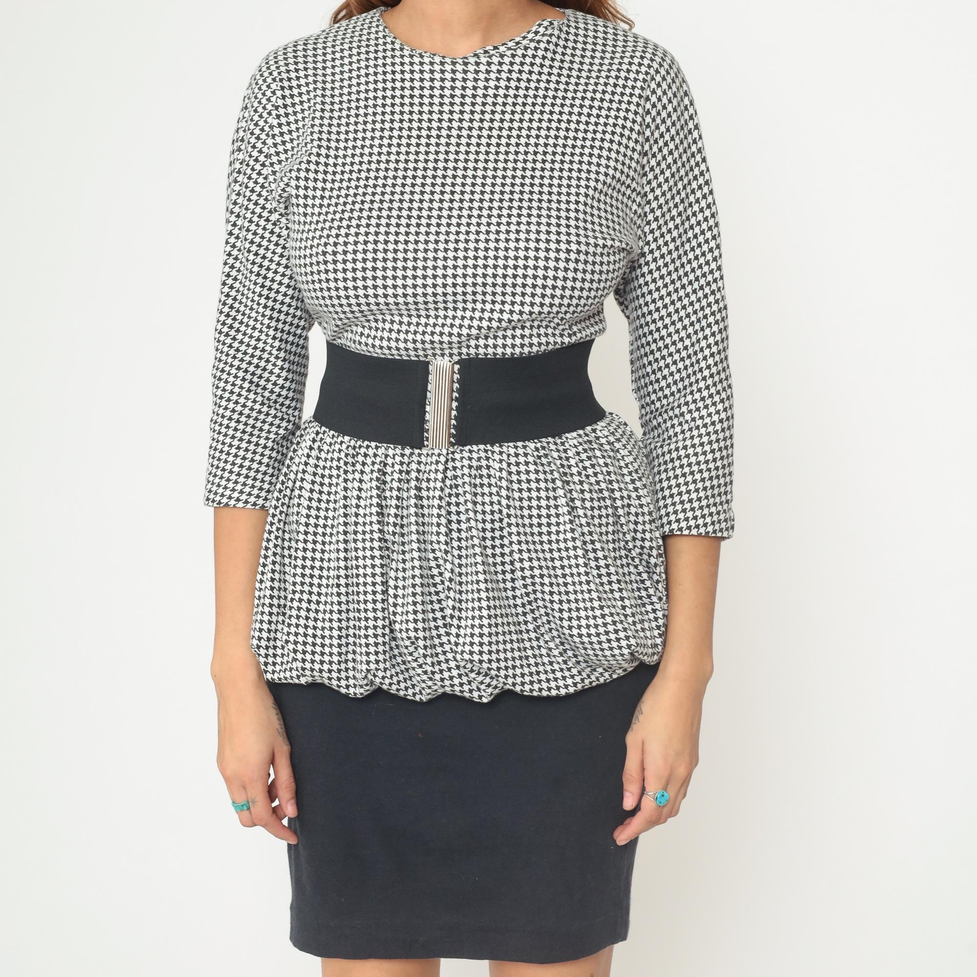 80s black and white houndstooth mini dress with peplum hem detail and detachable elastic belt from dawn joy fashions. Houndstooth pattern on the top portion with three-quarter length sleeves and a small keyhole opening with button closure at the back neckline. Scalloped peplum hem with a fitted black pencil skirt bottom. Comes with a wide black elastic belt with silver-toned metal clasp closure.