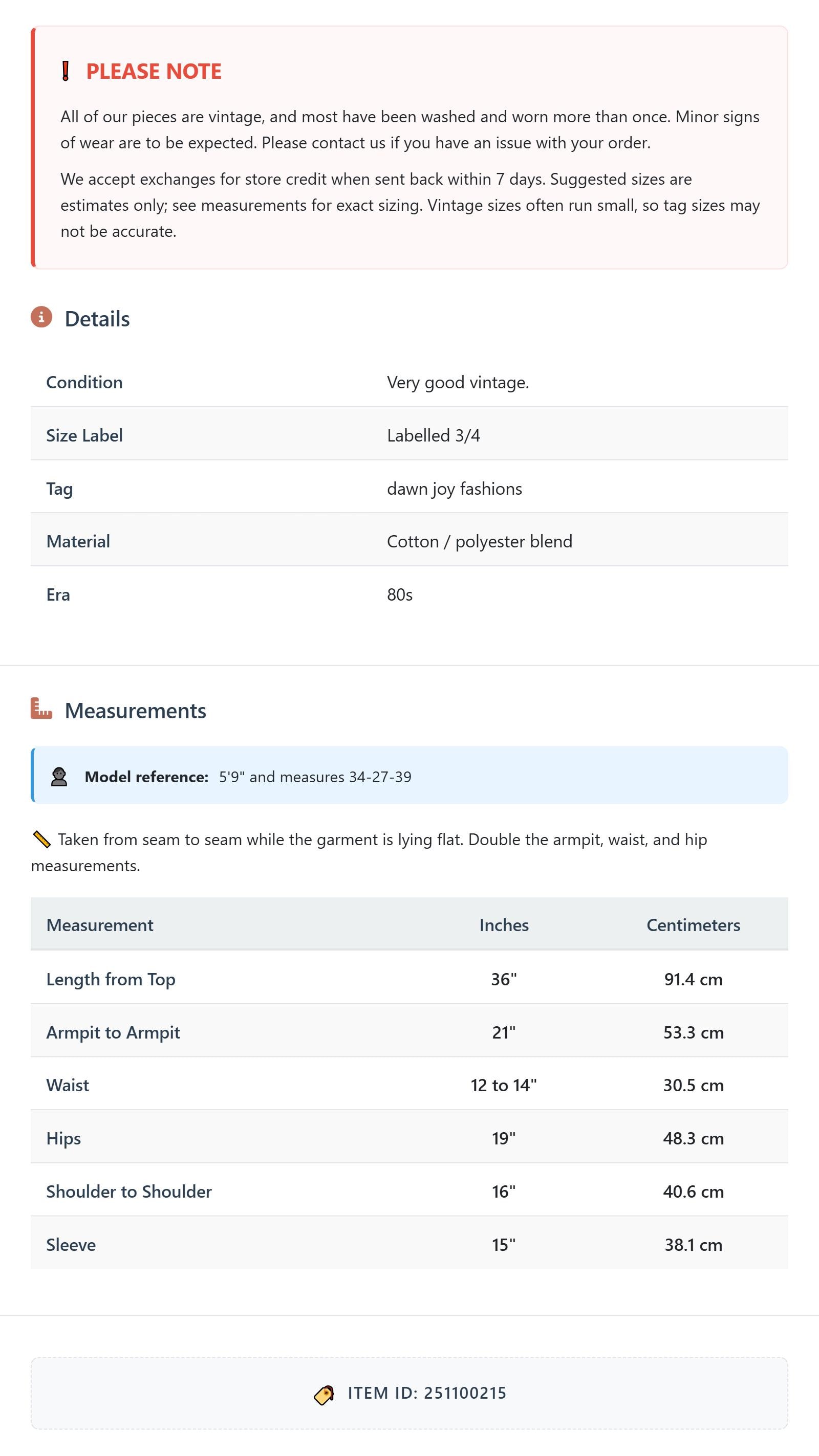 All of our pieces are vintage, and most have been washed and worn more than once. Minor signs of wear are to be expected. Please contact us if you have an issue with your order. We accept exchanges for store credit when sent back within 7 days.