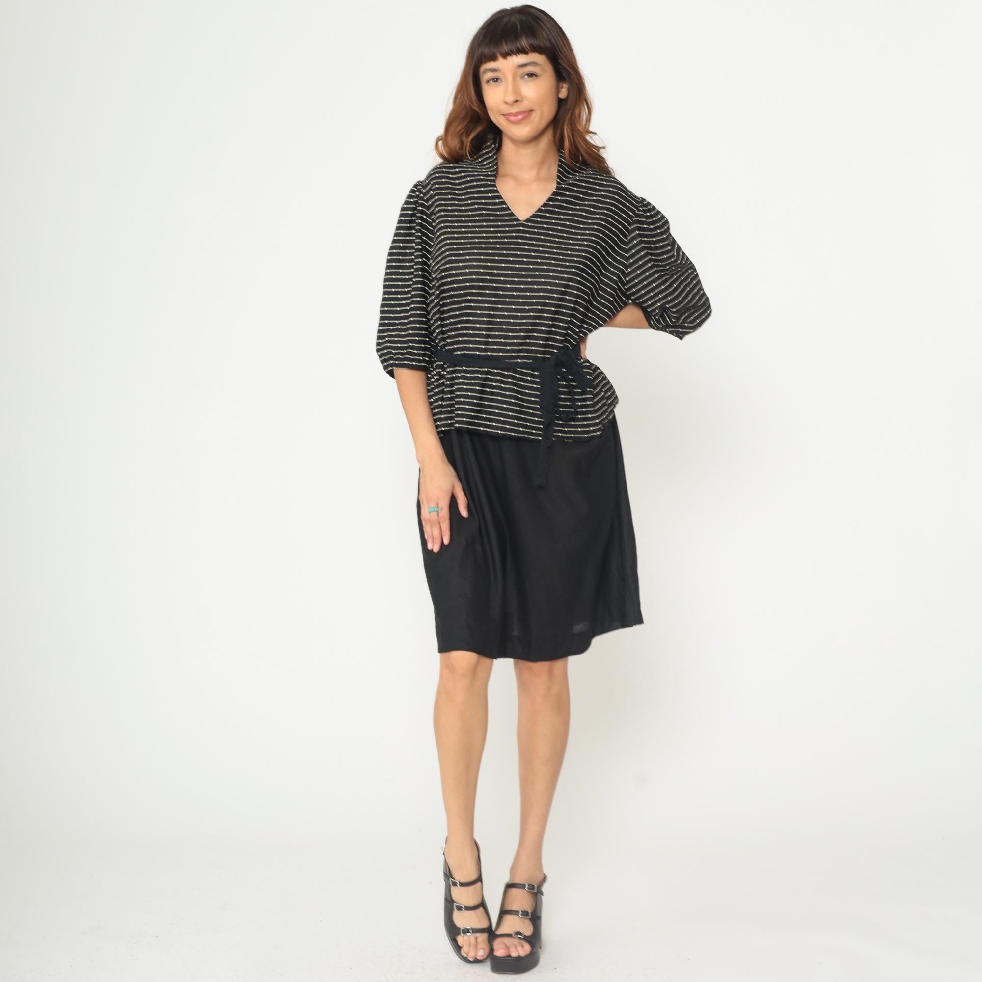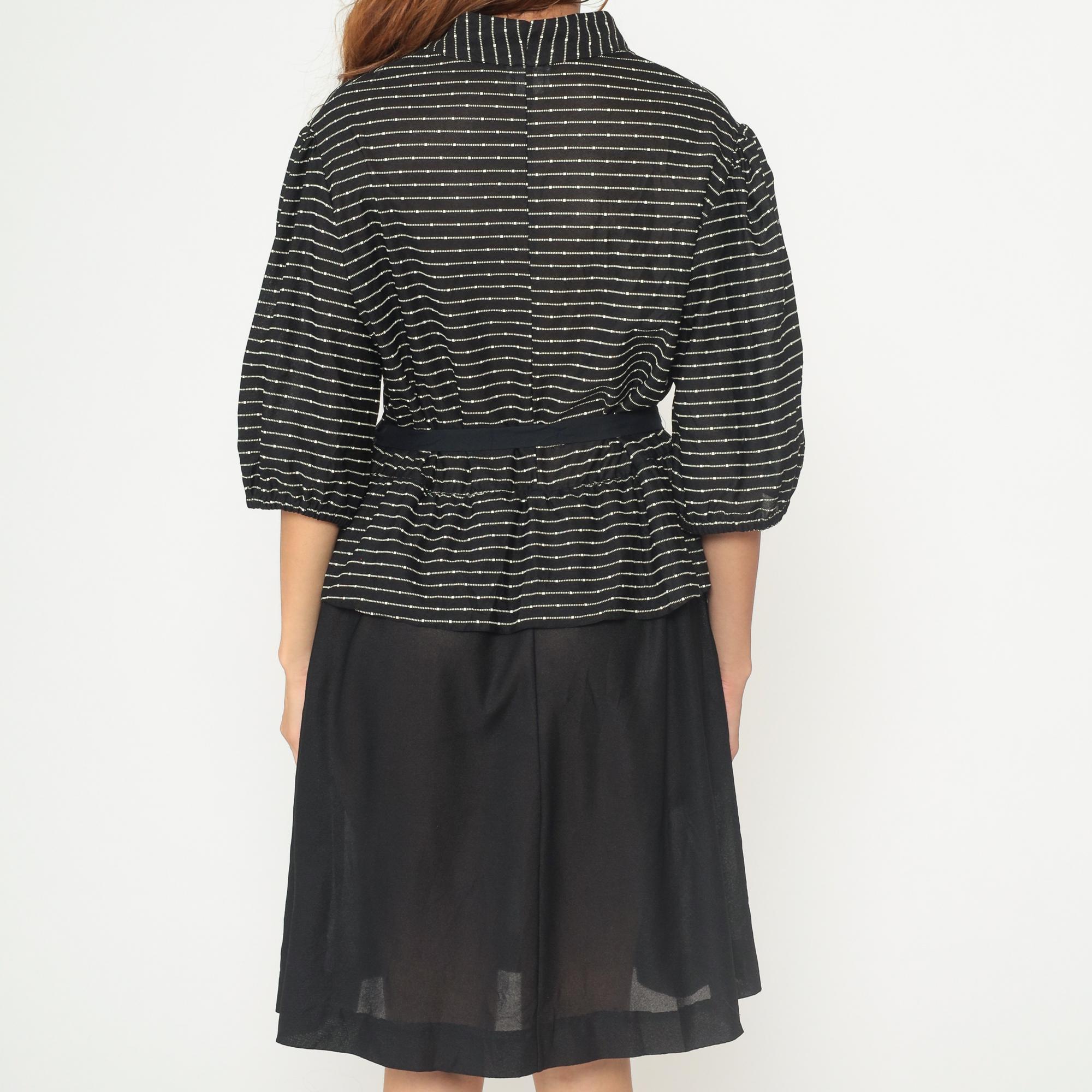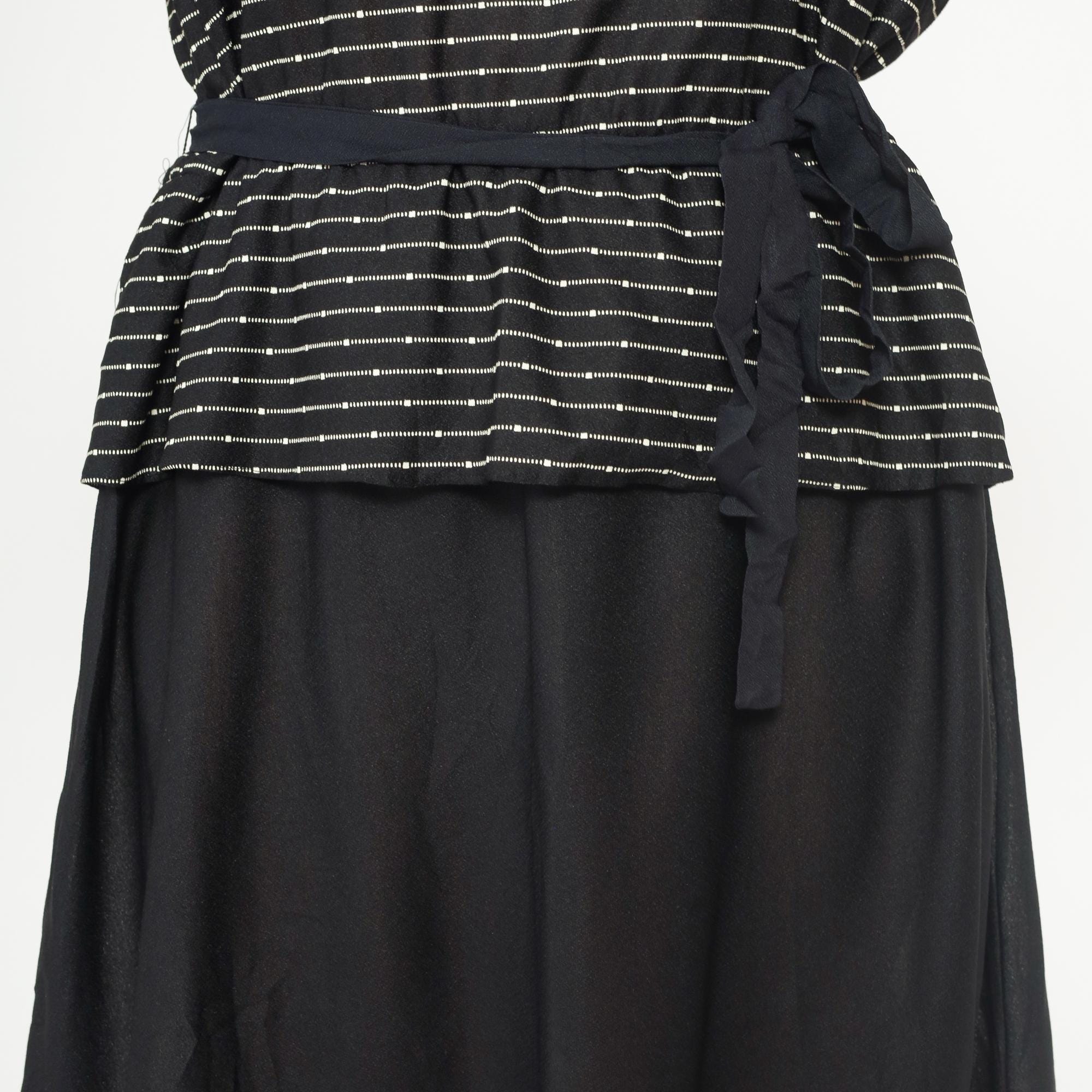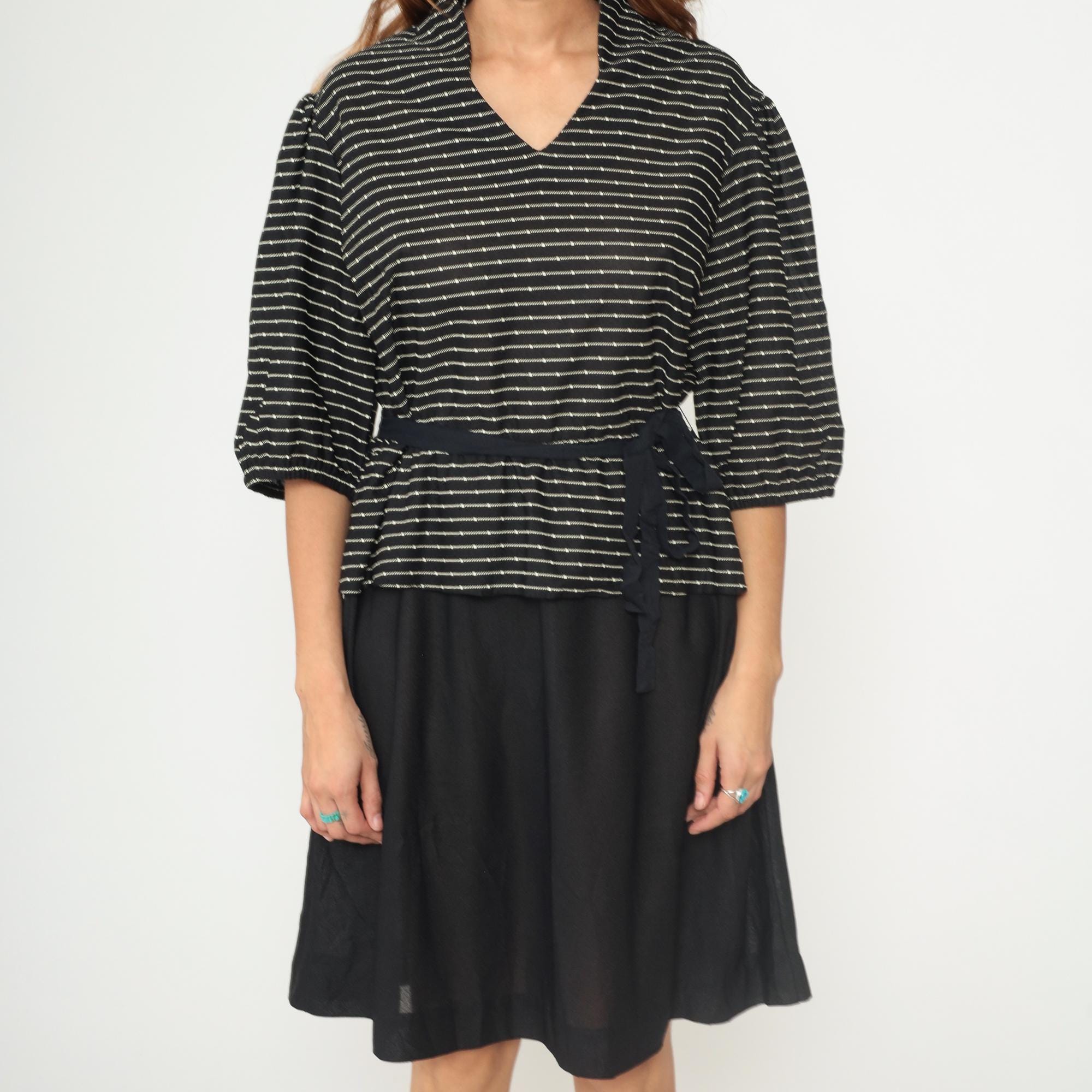 80s striped dress with black skirt and semi-sheer peplum top featuring horizontal white and black stripes. V-neck collar with three-quarter length sleeves. Black tie belt at waist connects the striped bodice to the attached solid black skirt.