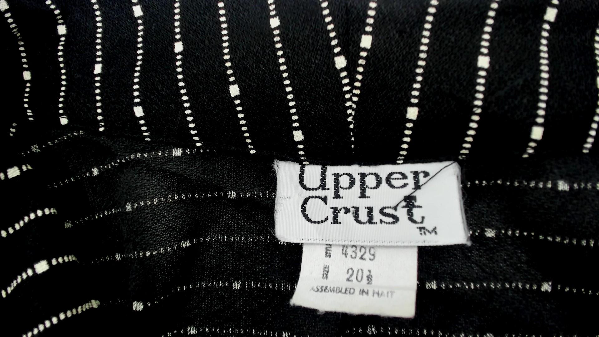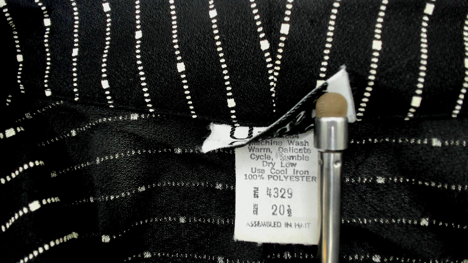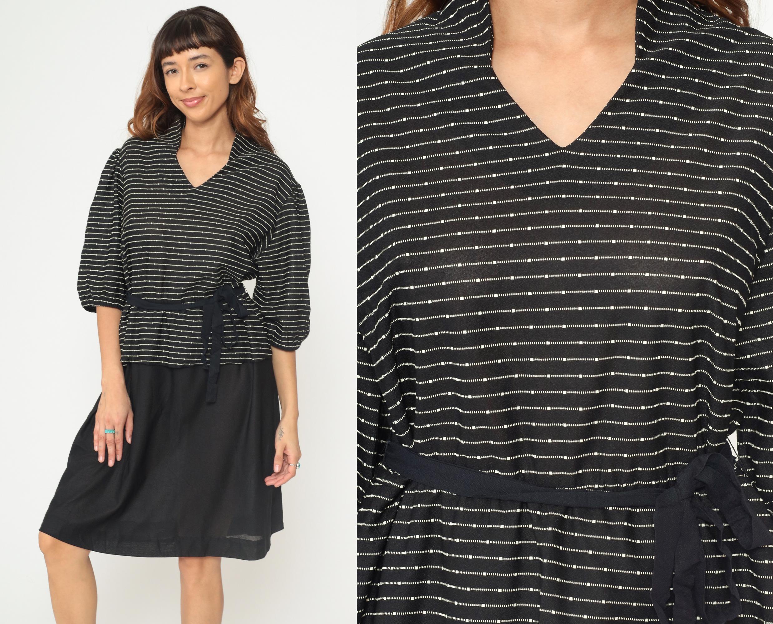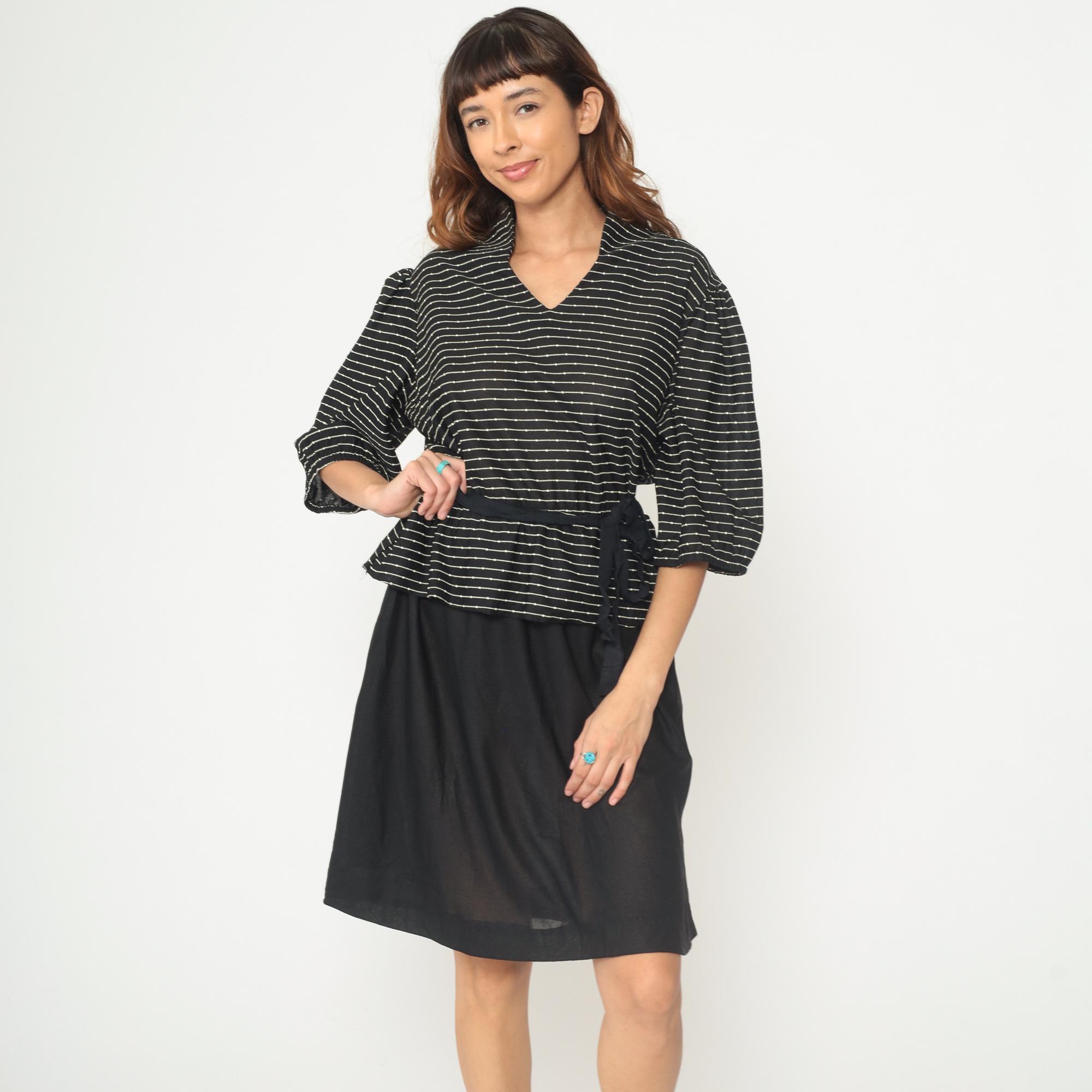 80s striped dress with black skirt and semi-sheer peplum top featuring horizontal white and black stripes. V-neck collar with three-quarter length sleeves. Black tie belt at waist connects the striped bodice to the attached solid black skirt.