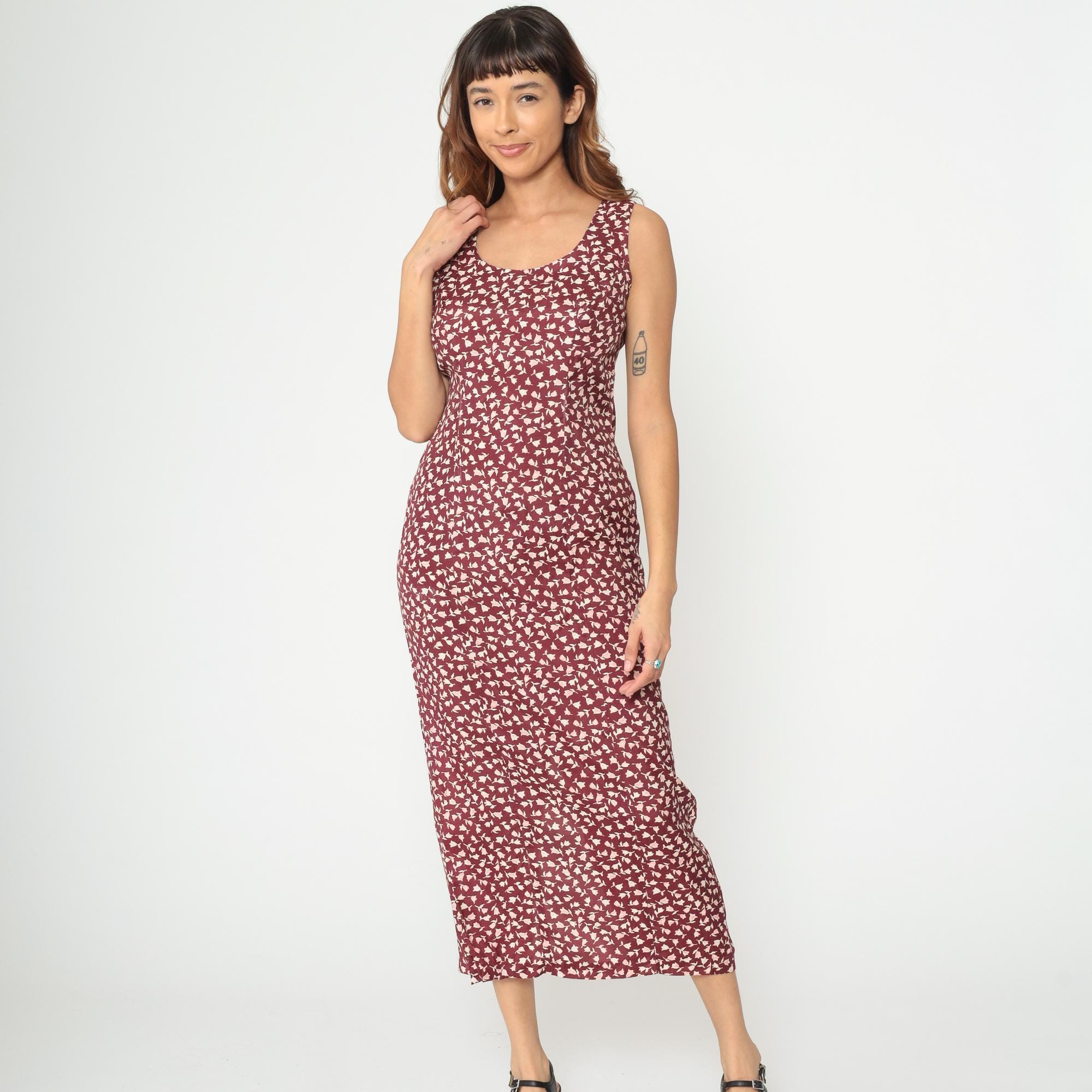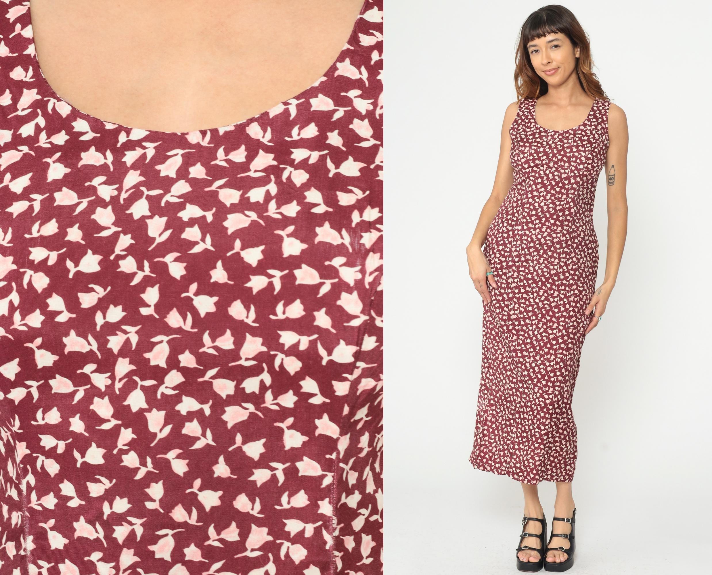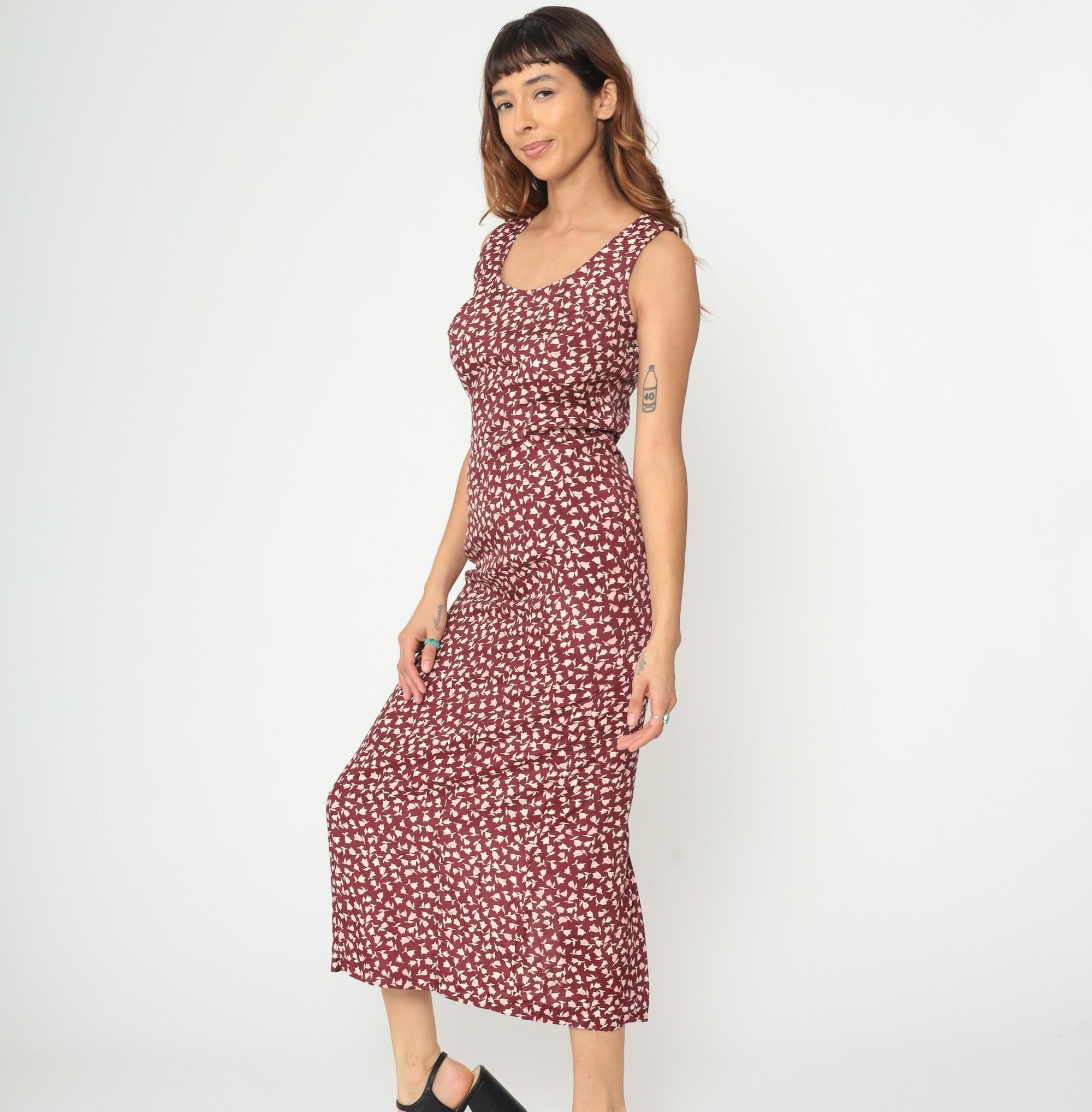 Burgundy floral midi dress from the 90s in rayon. Small cream and burgundy flowers scattered across the deep wine-colored fabric. Sleeveless design with scoop neckline and bias-cut silhouette. Relaxed fit with midi length hemline.