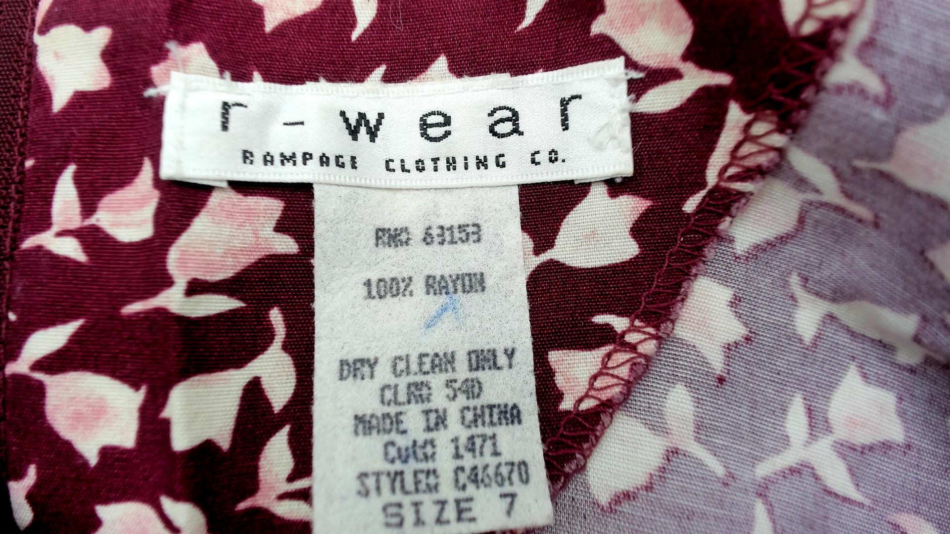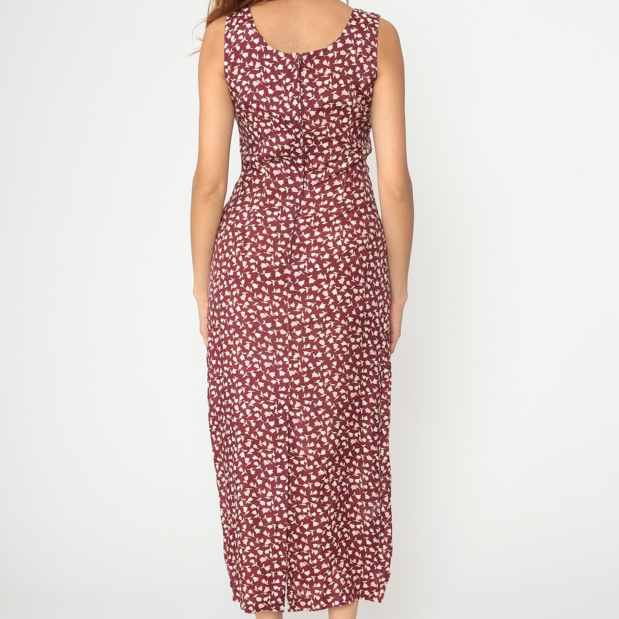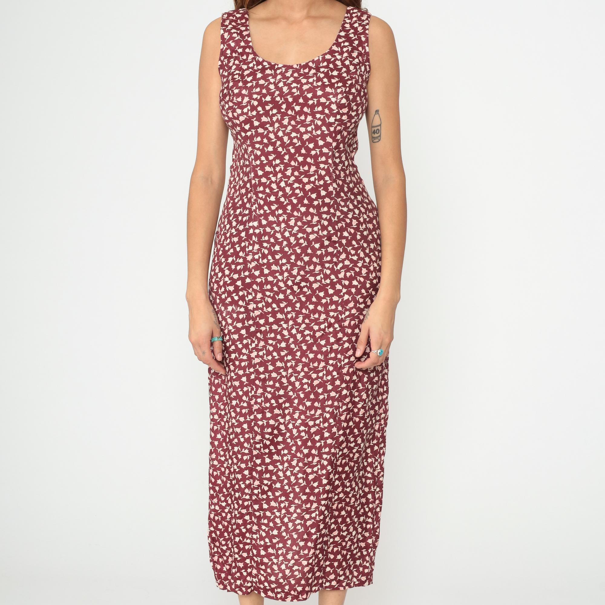 Burgundy floral midi dress from the 90s in rayon. Small cream and burgundy flowers scattered across the deep wine-colored fabric. Sleeveless design with scoop neckline and bias-cut silhouette. Relaxed fit with midi length hemline.