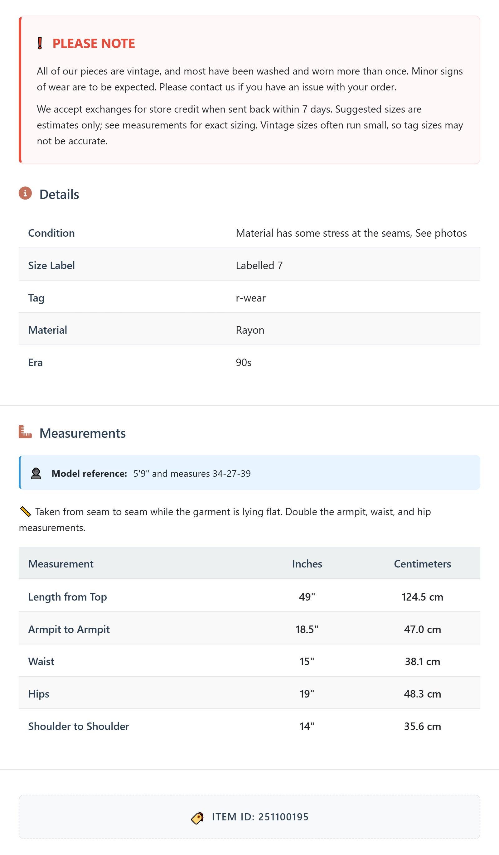 All of our pieces are vintage, and most have been washed and worn more than once. Minor signs of wear are to be expected. Please contact us if you have an issue with your order. We accept exchanges for store credit when sent back within 7 days.