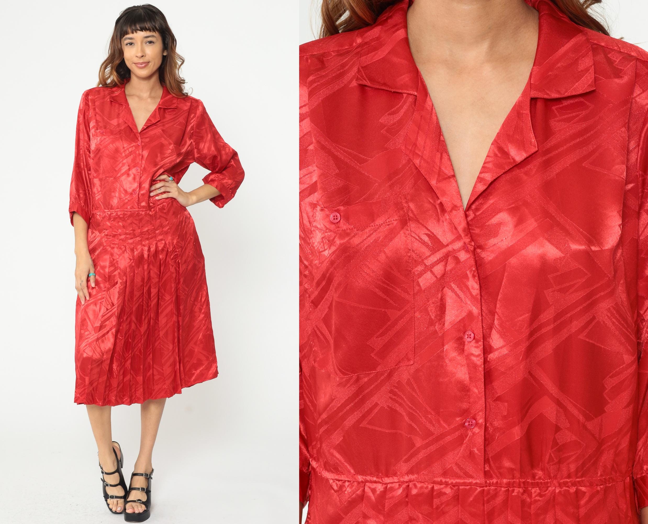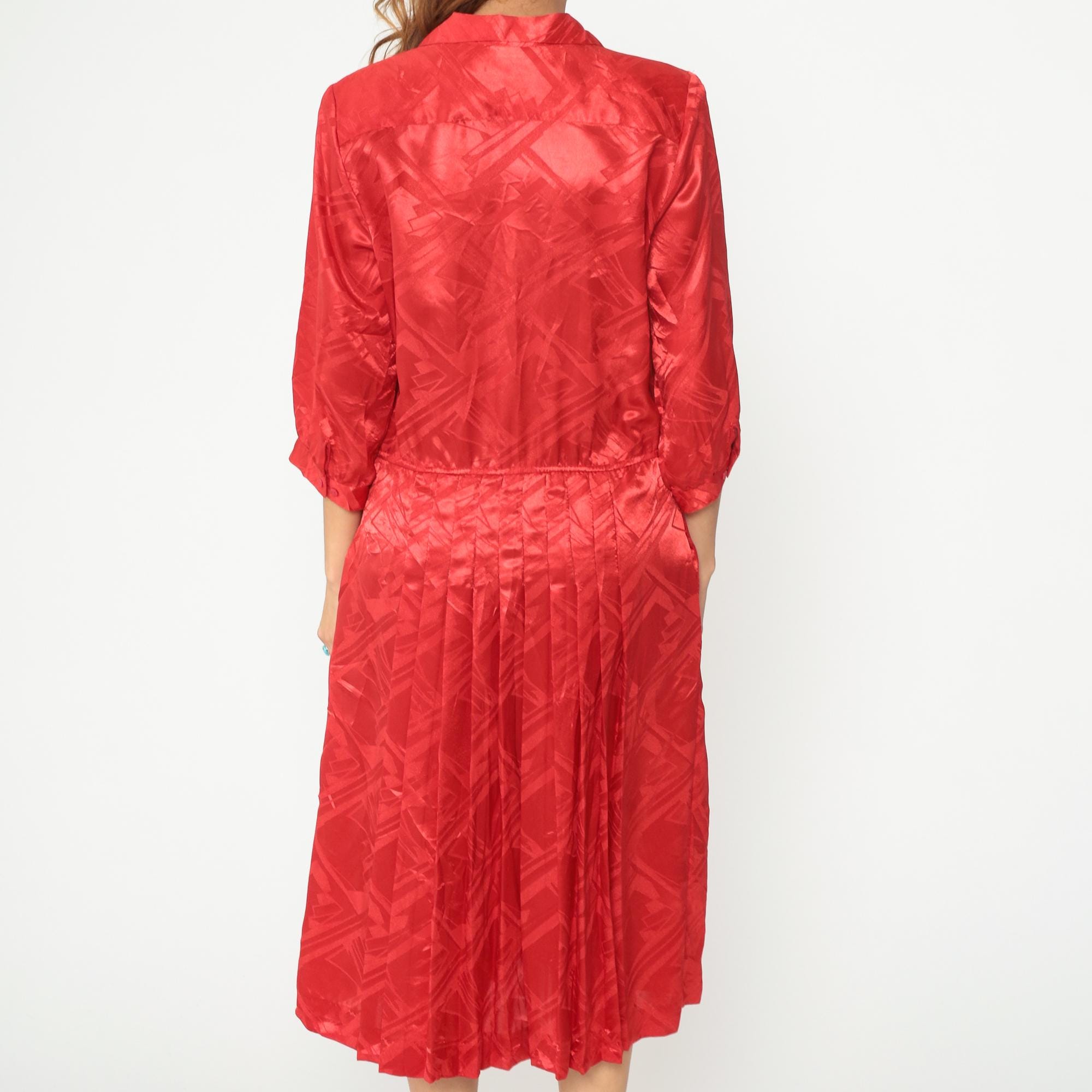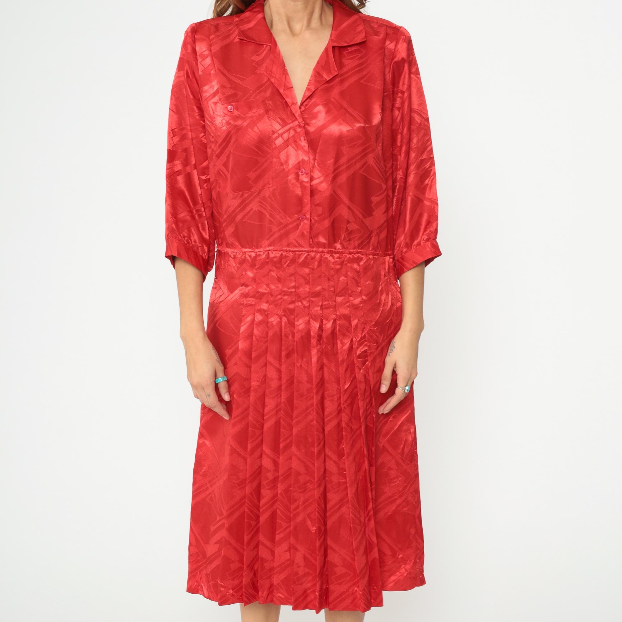 Red polyester dress from the 80s with jacquard texture throughout. Button-front bodice with notched collar and three-quarter length sleeves. Pleated midi skirt. Tonal geometric pattern woven into the fabric.
