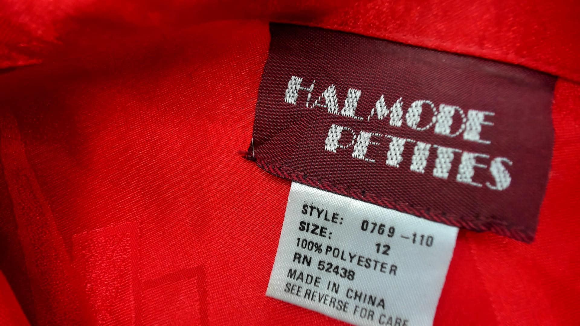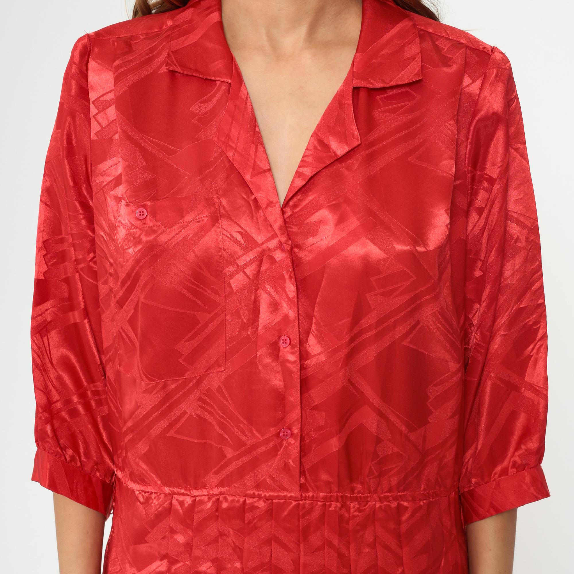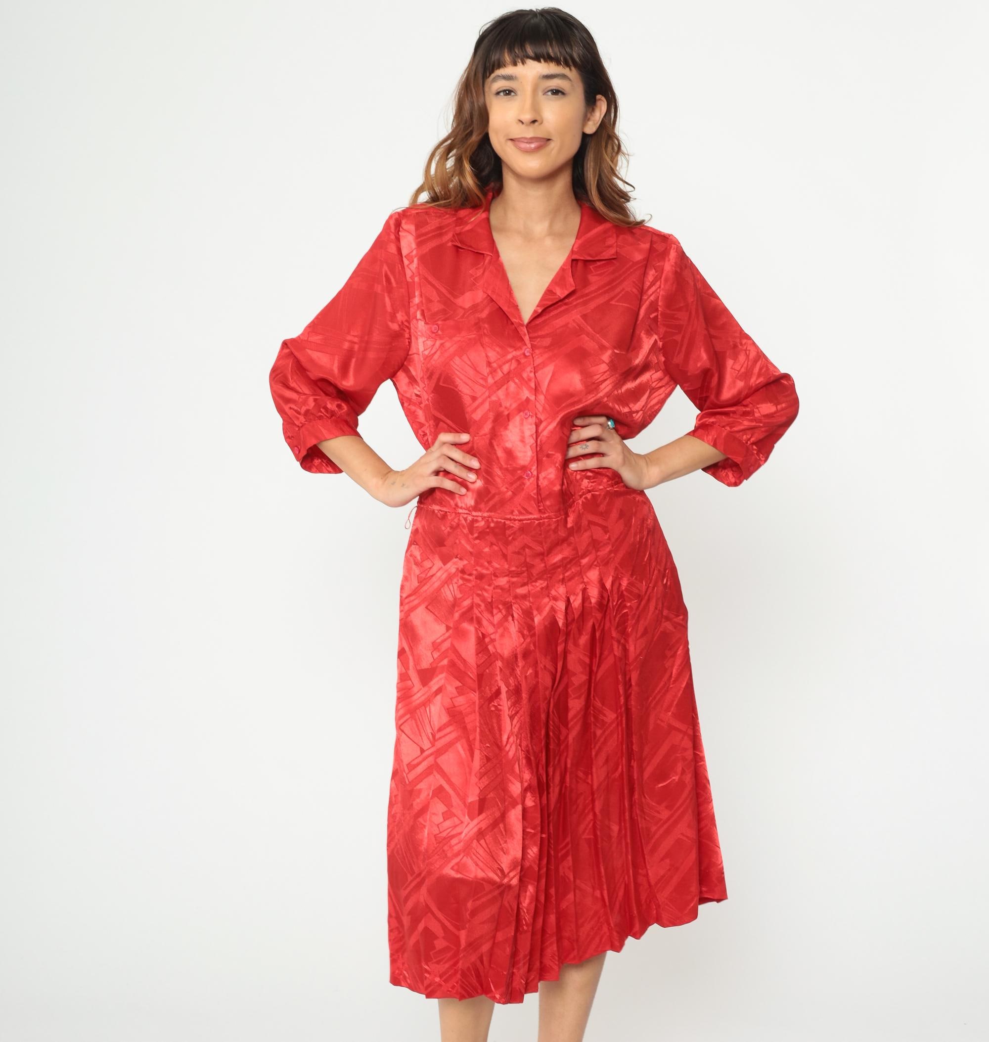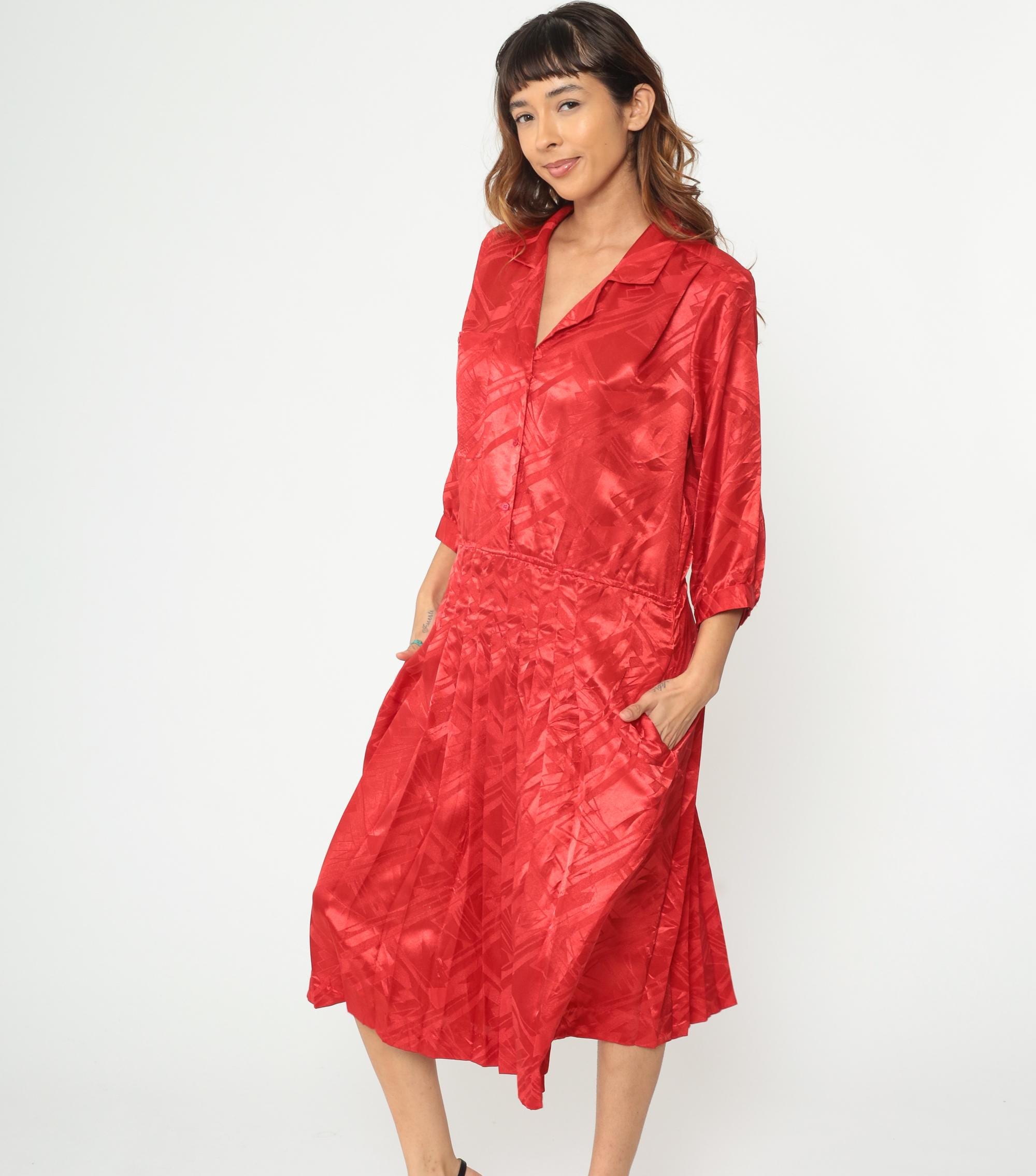 Red polyester dress from the 80s with jacquard texture throughout. Button-front bodice with notched collar and three-quarter length sleeves. Pleated midi skirt. Tonal geometric pattern woven into the fabric.