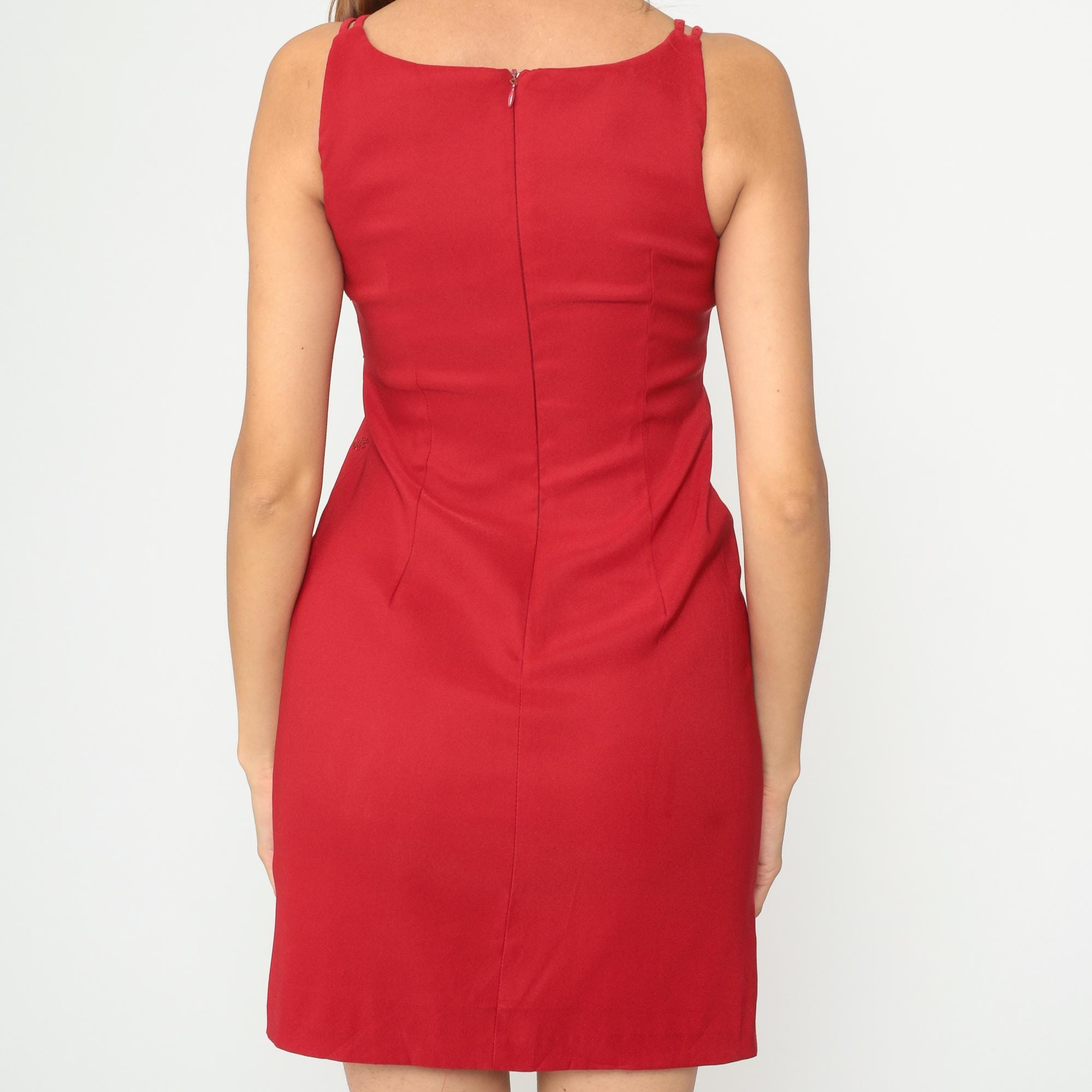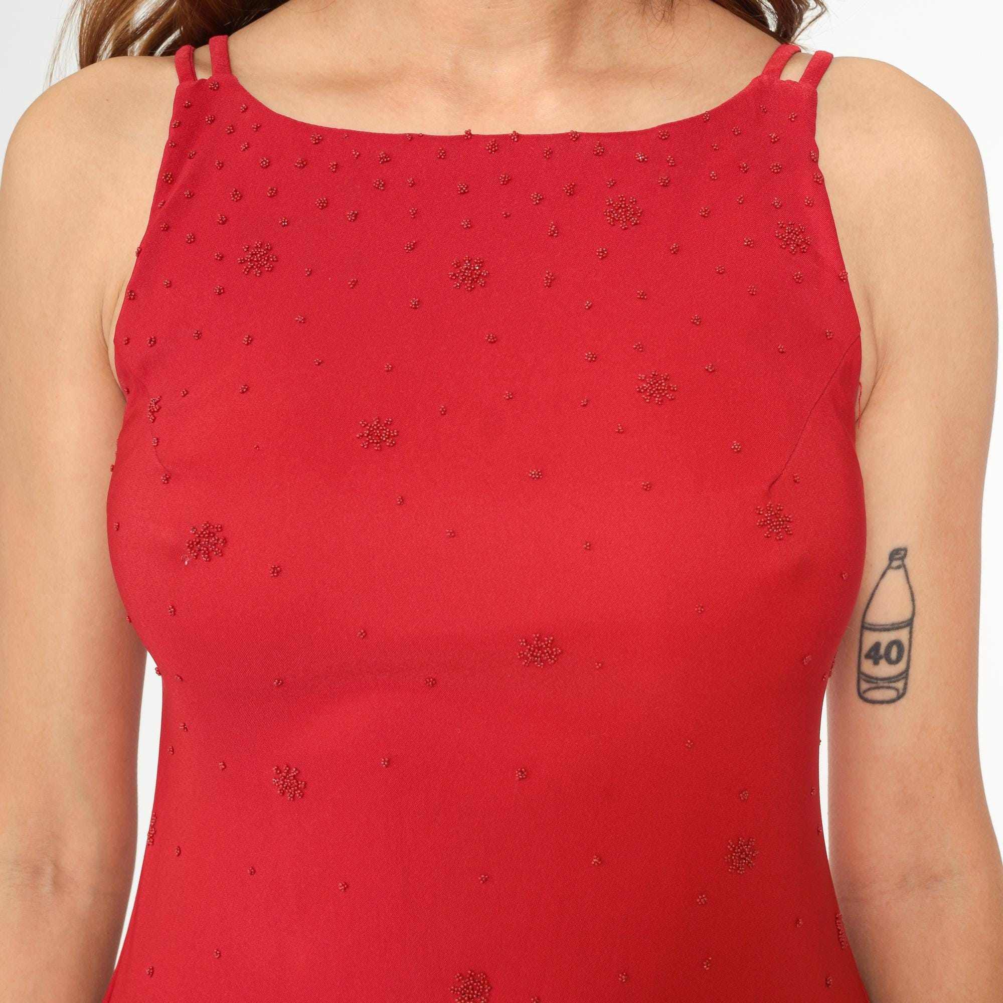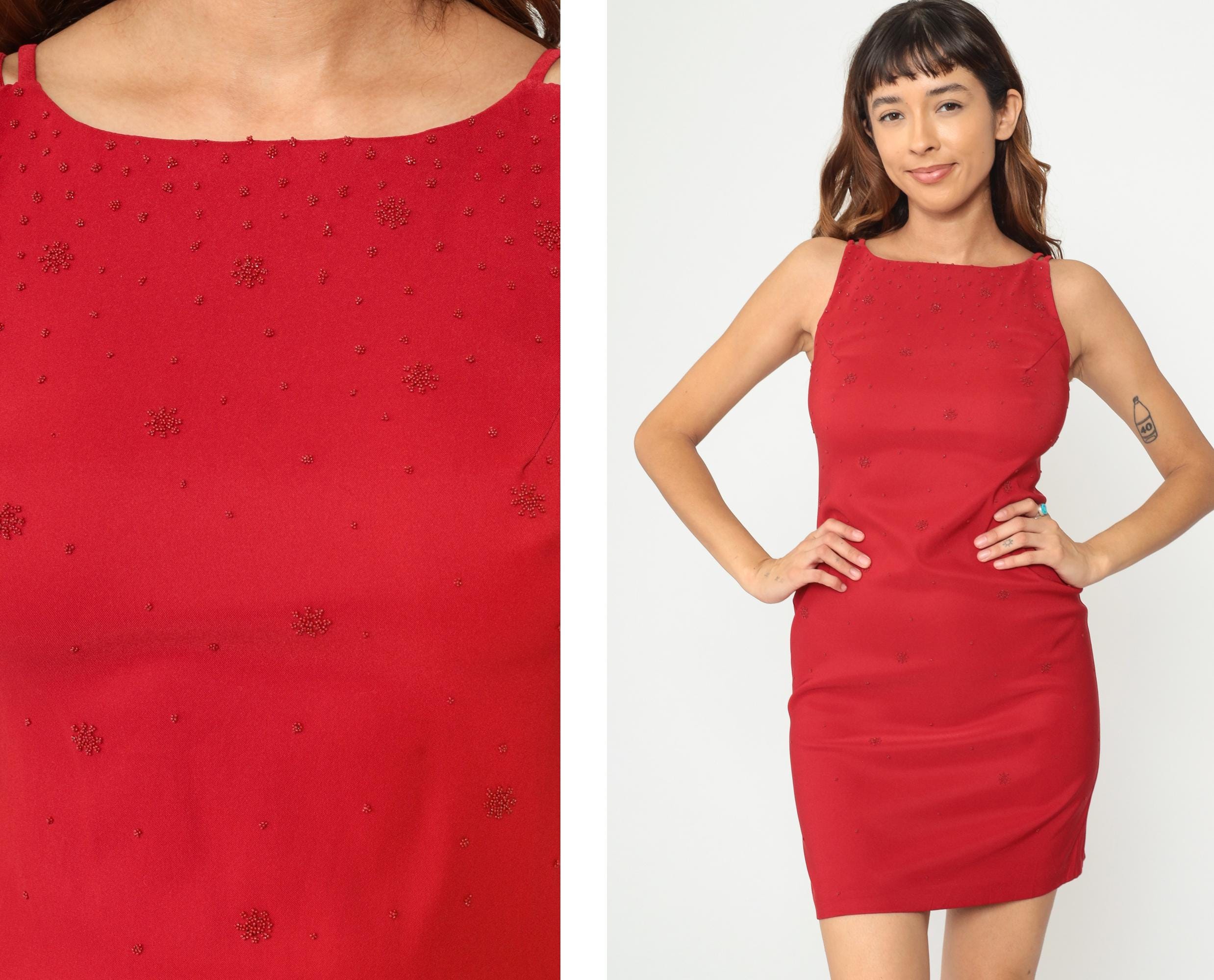 Bright red mini dress from the 90s with small beaded texture across the entire garment creating a subtle sparkle effect throughout. Sleeveless with scoop neckline and fitted bodice, double straps at shoulders, back zipper closure.