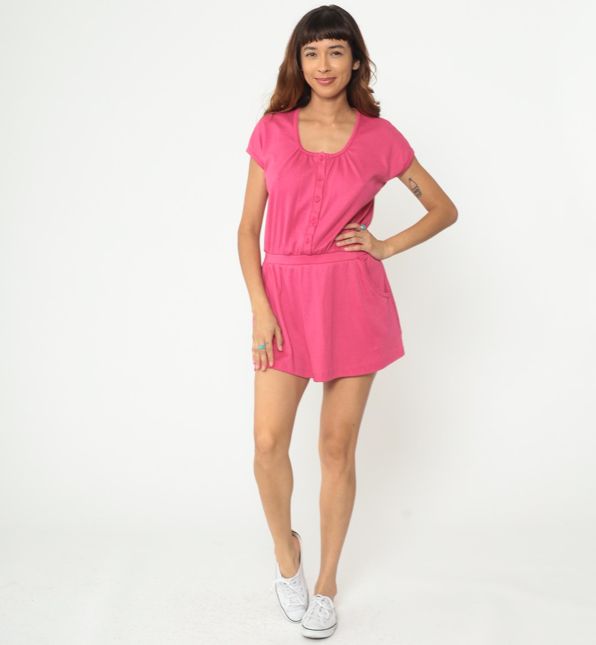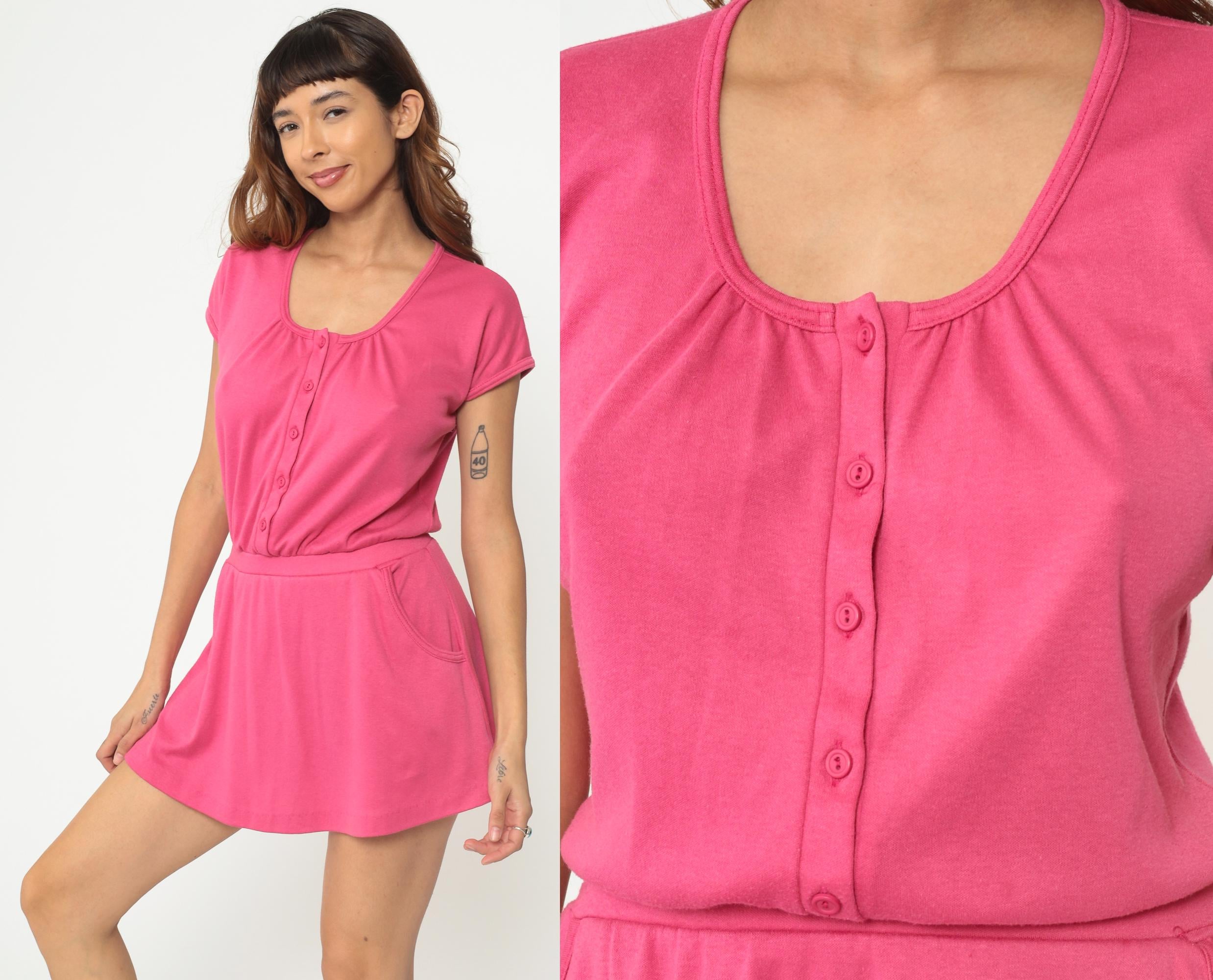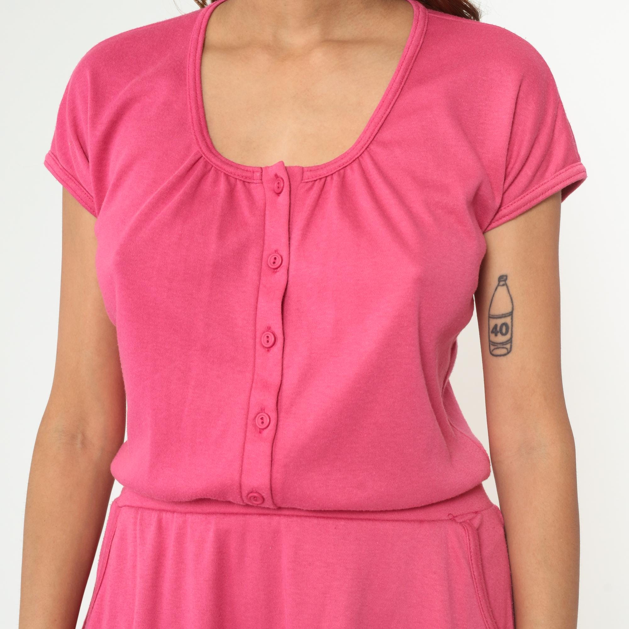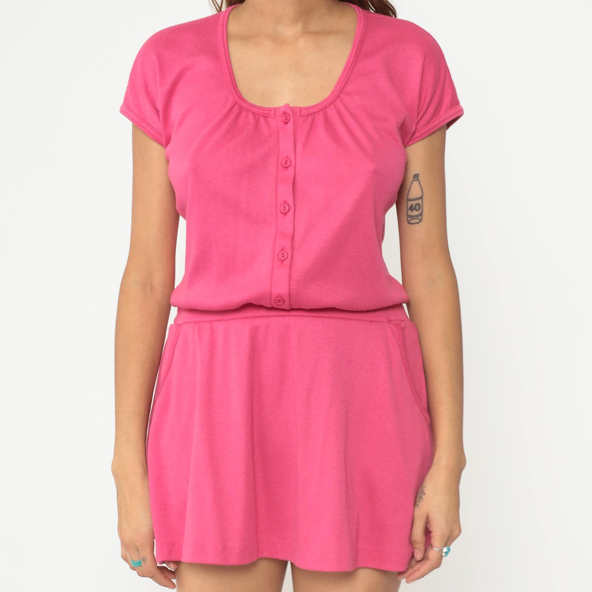 80s hot pink mini dress in cotton blend with banded waist detail and side pockets. Button front bodice with gathered detail at neckline and scoop neck. Short sleeves with turned edge detail. Elastic waist creates gathered band at natural waist. A-line mini skirt with side seam pockets.