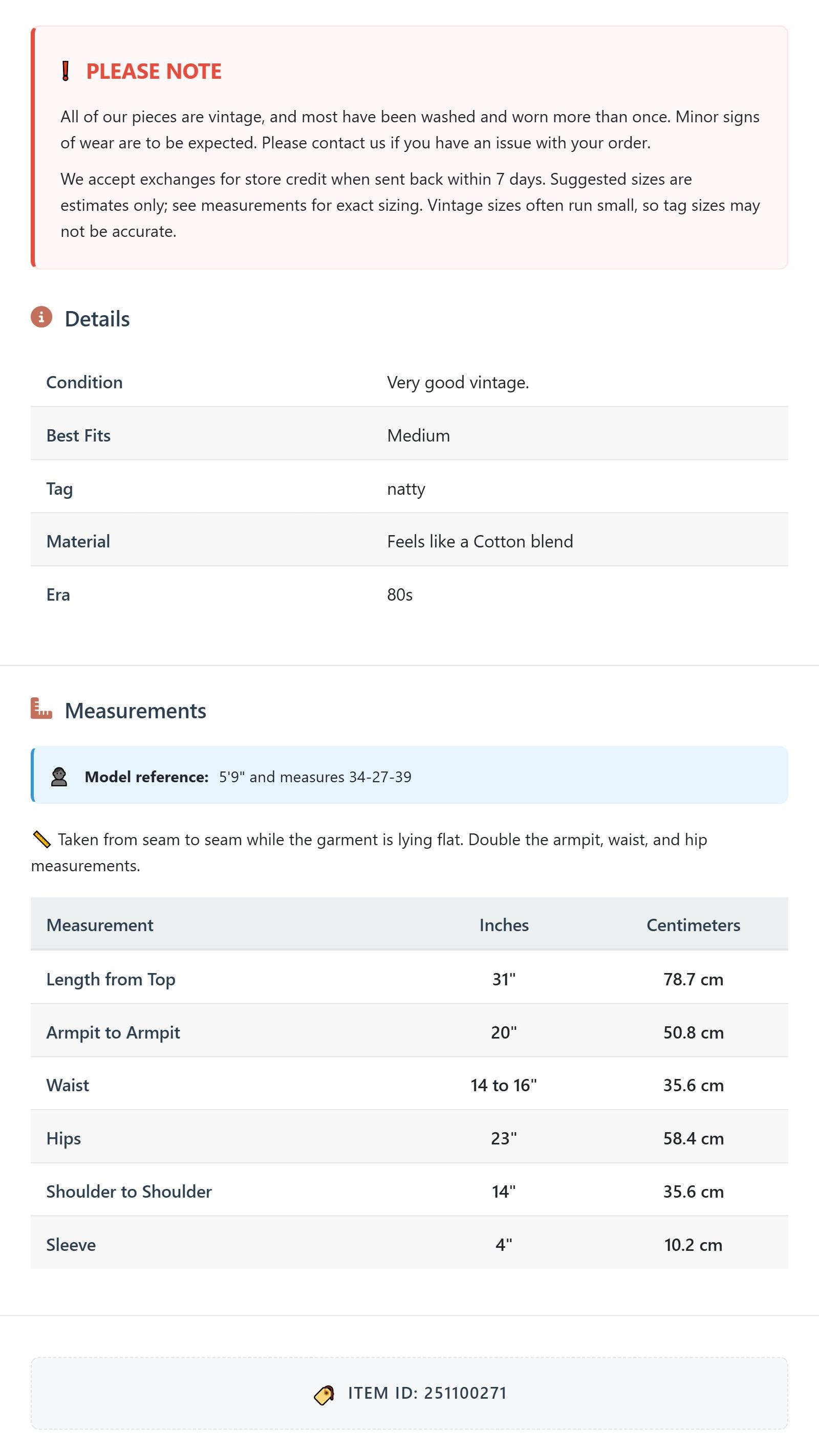 All of our pieces are vintage, and most have been washed and worn more than once. Minor signs of wear are to be expected. Please contact us if you have an issue with your order. We accept exchanges for store credit when sent back within 7 days.