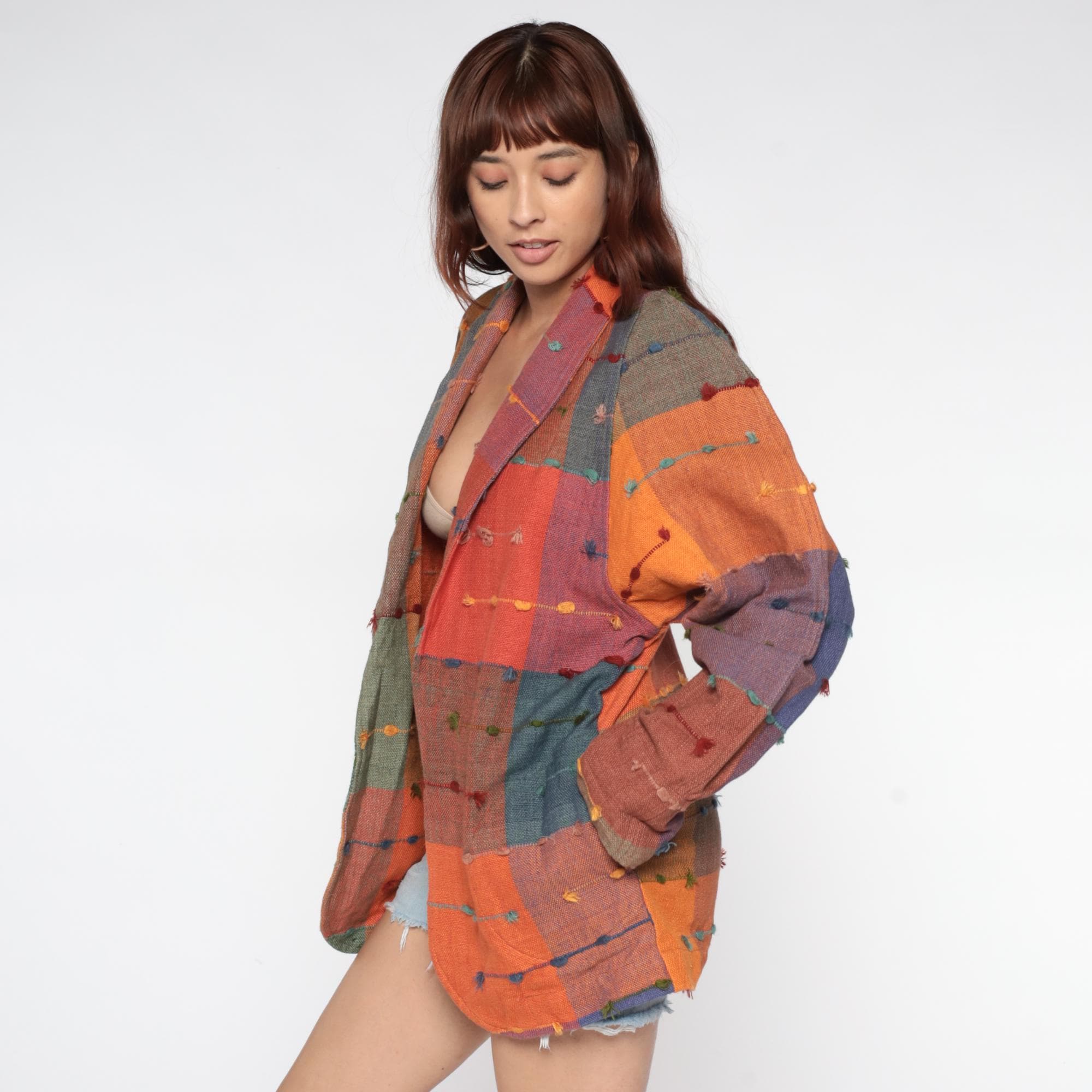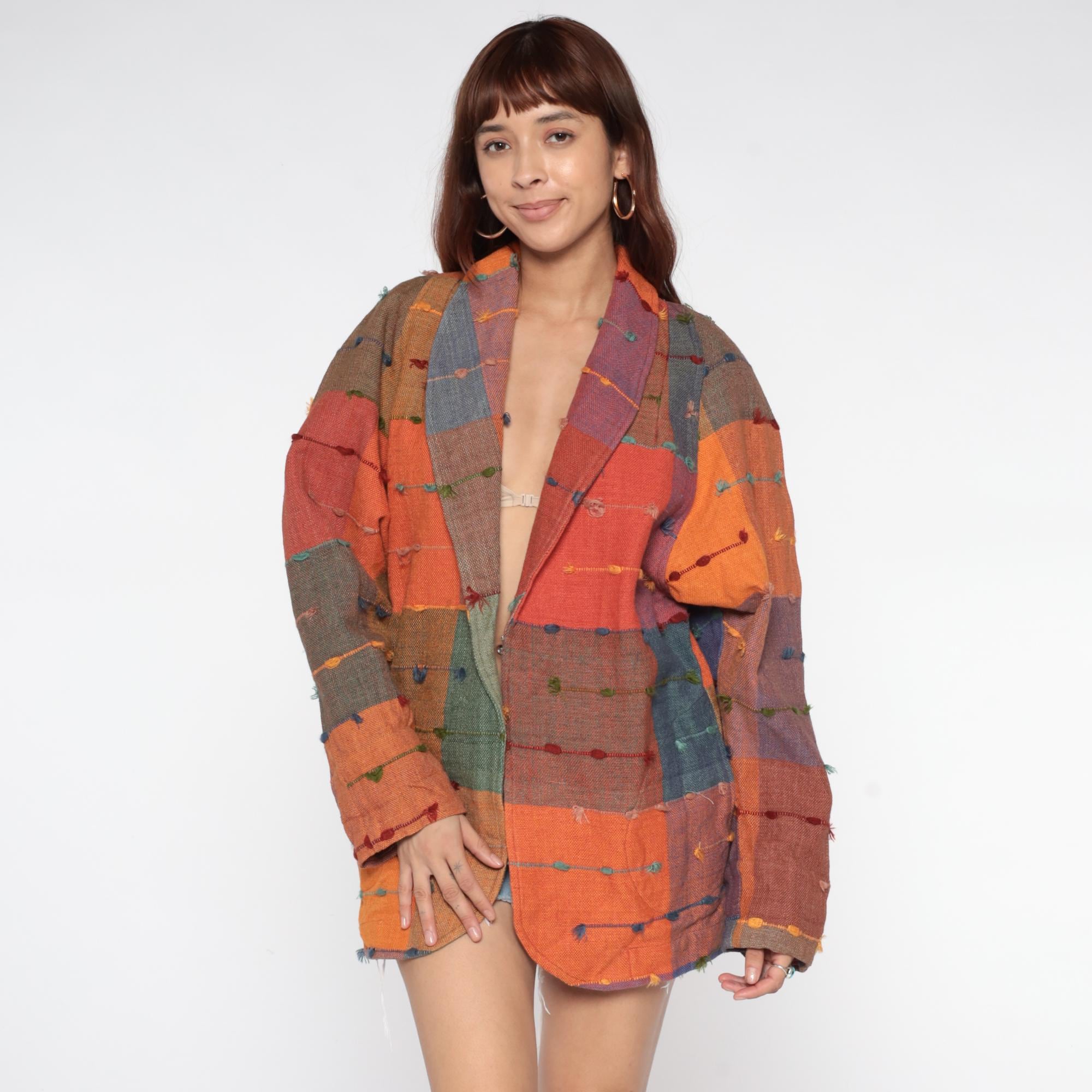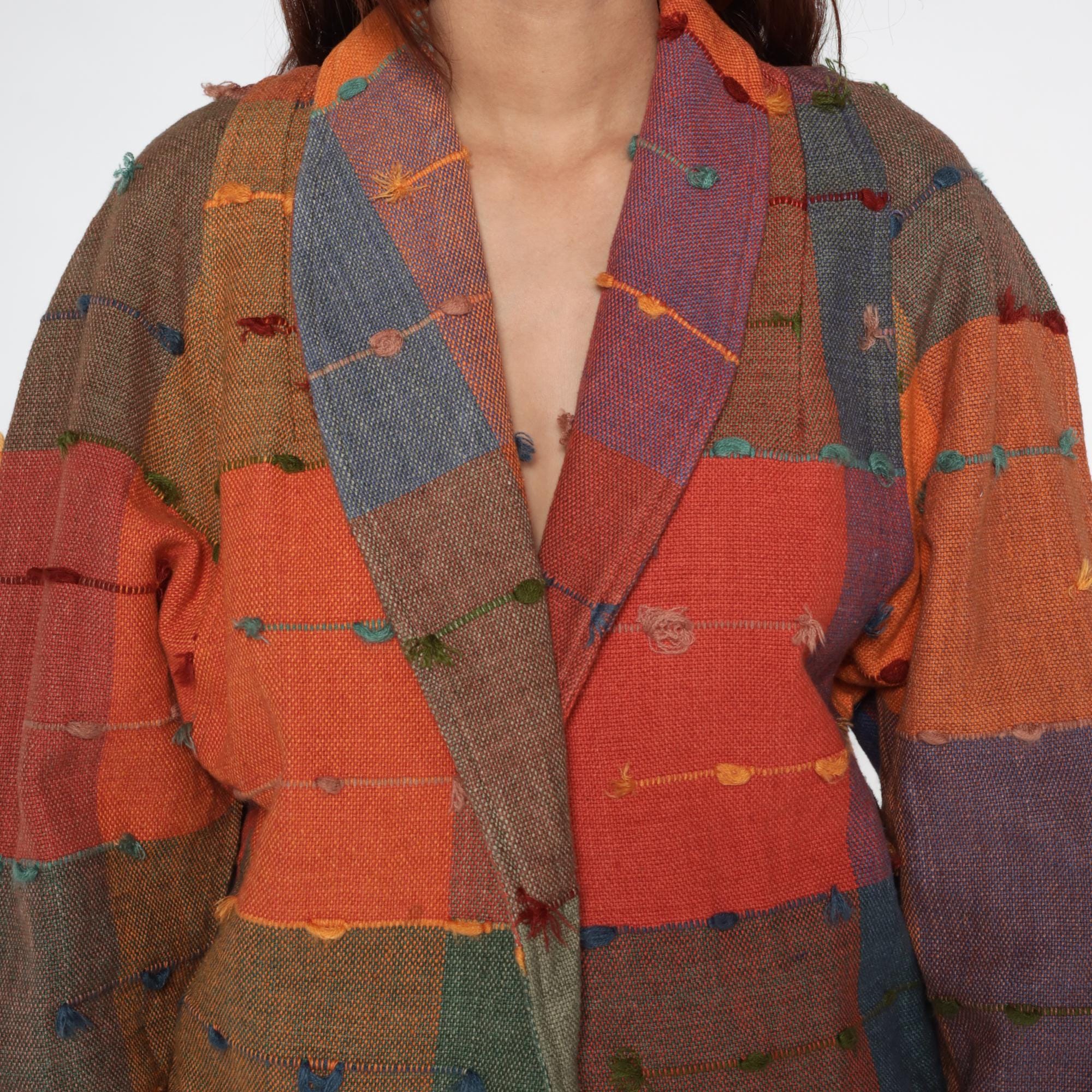 90s patchwork jacket in multicolor cotton with hand-stitched construction. Each panel features a different color in a geometric block pattern: burnt orange, burgundy, forest green, navy, teal, dusty rose, chocolate brown, and ochre. Visible contrast stitching in multiple colors along seam lines and decorative embroidered details scattered across panels. Notched collar, button front closure, long sleeves.