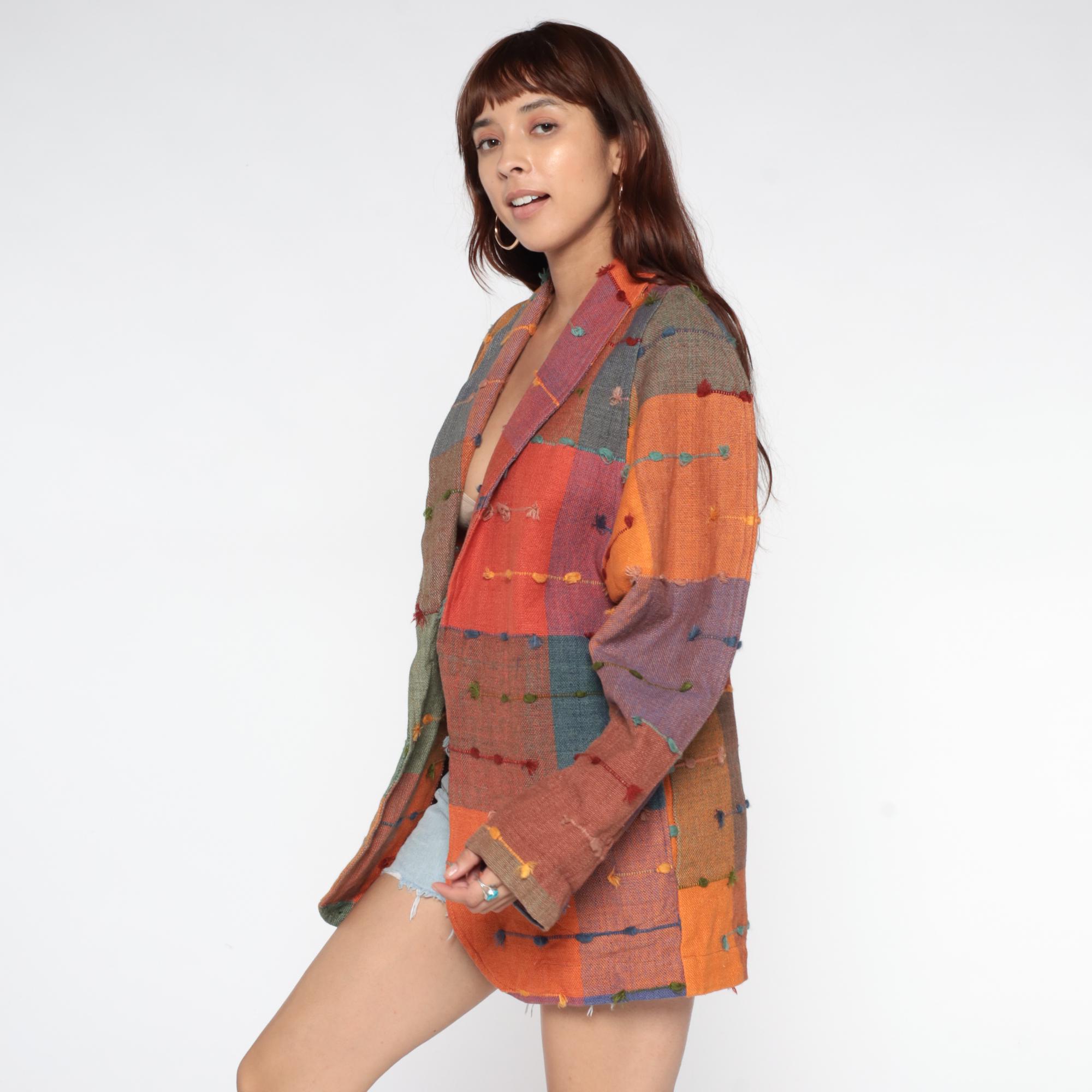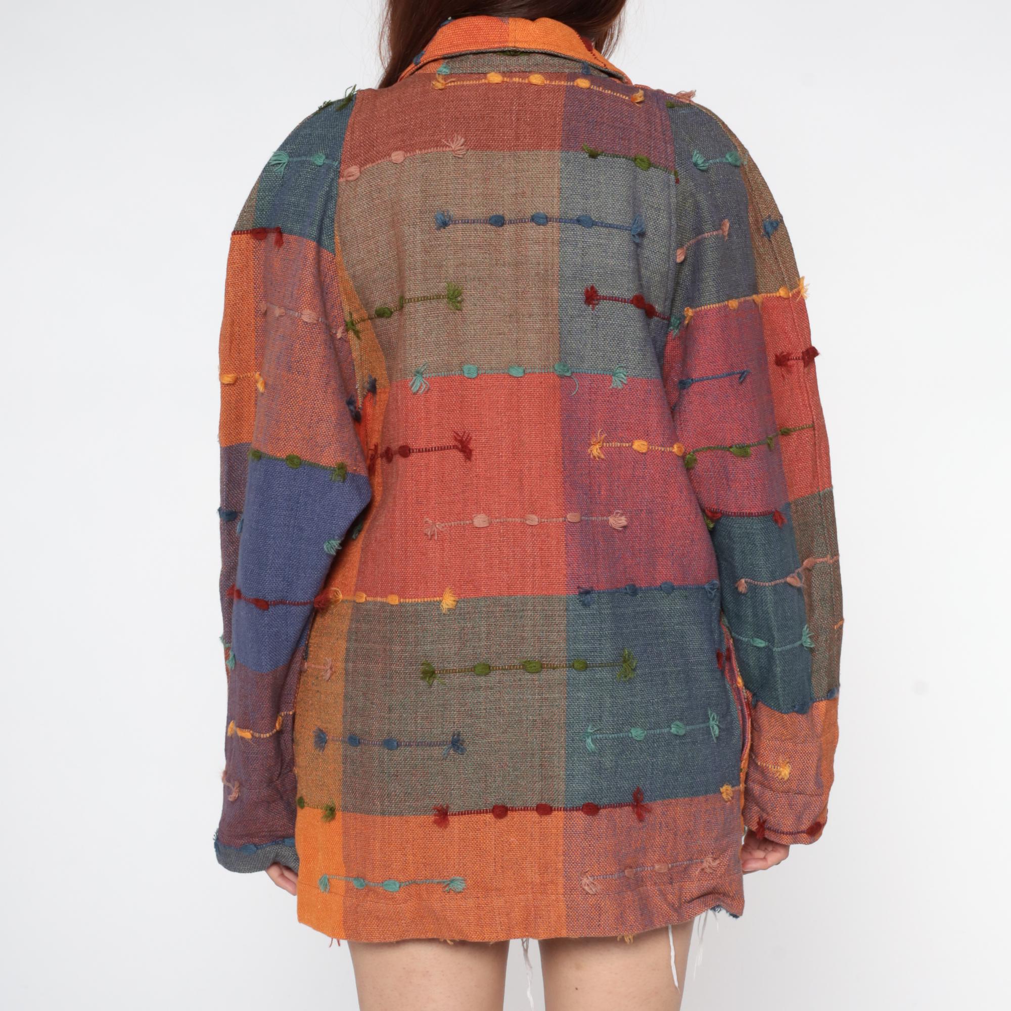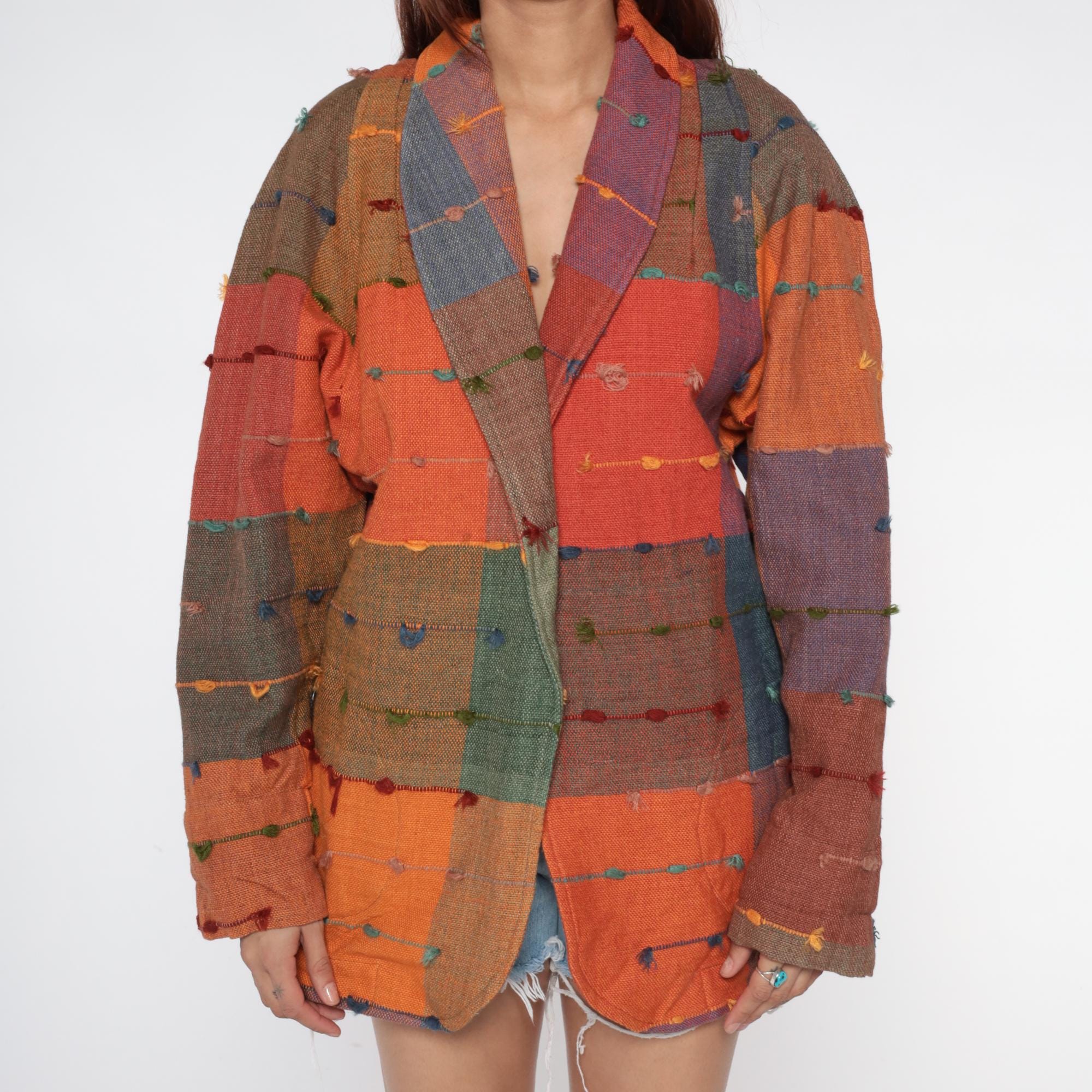 90s patchwork jacket in multicolor cotton with hand-stitched construction. Each panel features a different color in a geometric block pattern: burnt orange, burgundy, forest green, navy, teal, dusty rose, chocolate brown, and ochre. Visible contrast stitching in multiple colors along seam lines and decorative embroidered details scattered across panels. Notched collar, button front closure, long sleeves.
