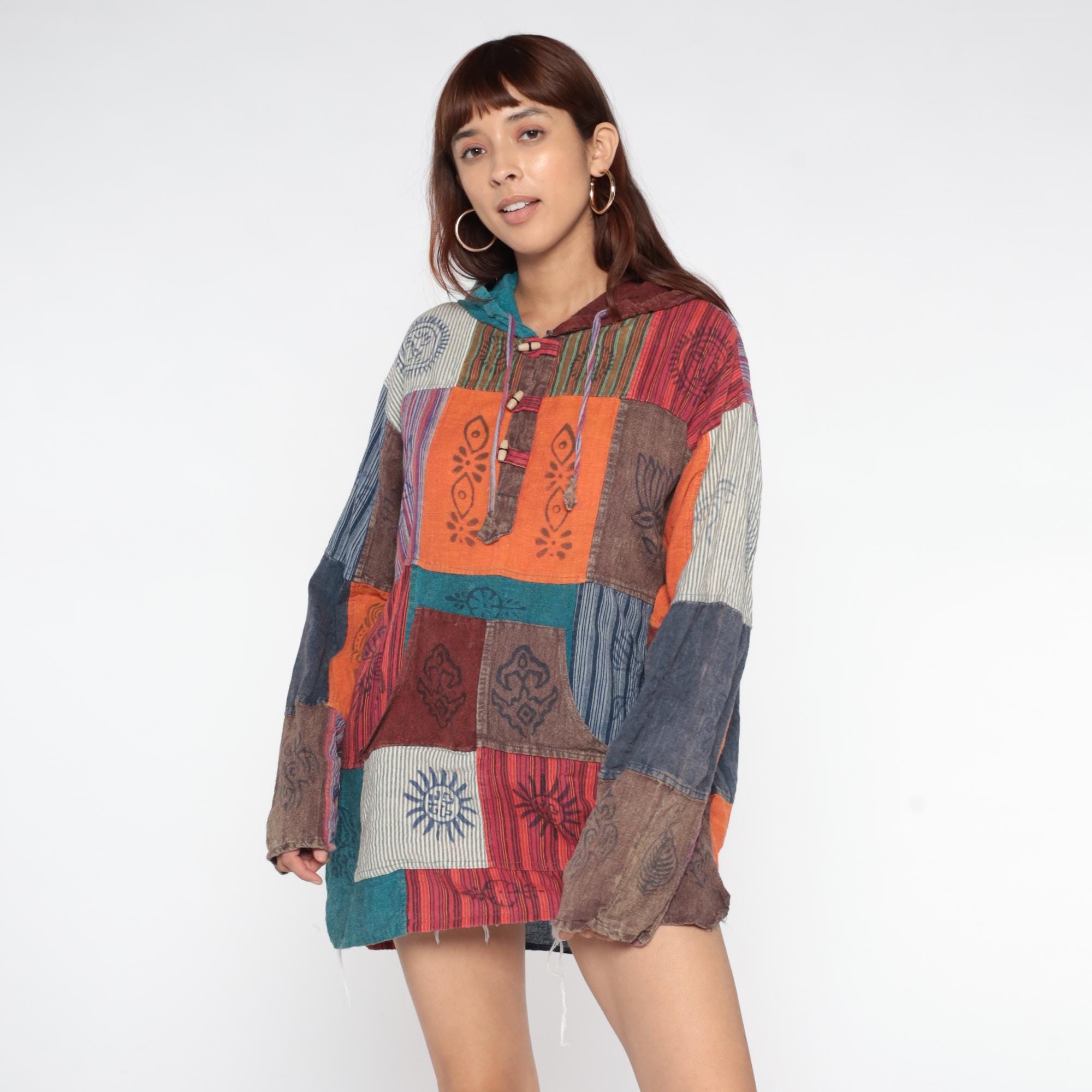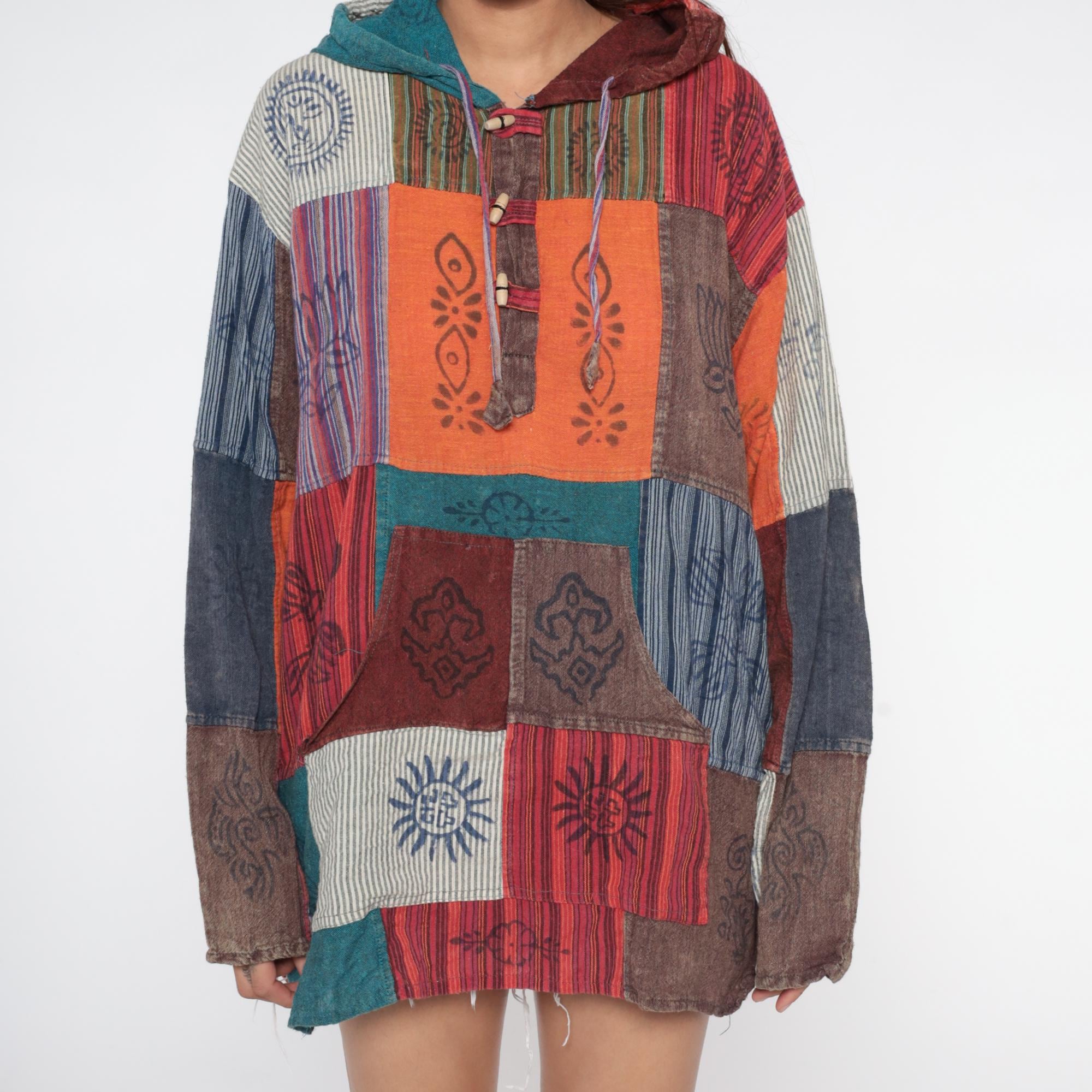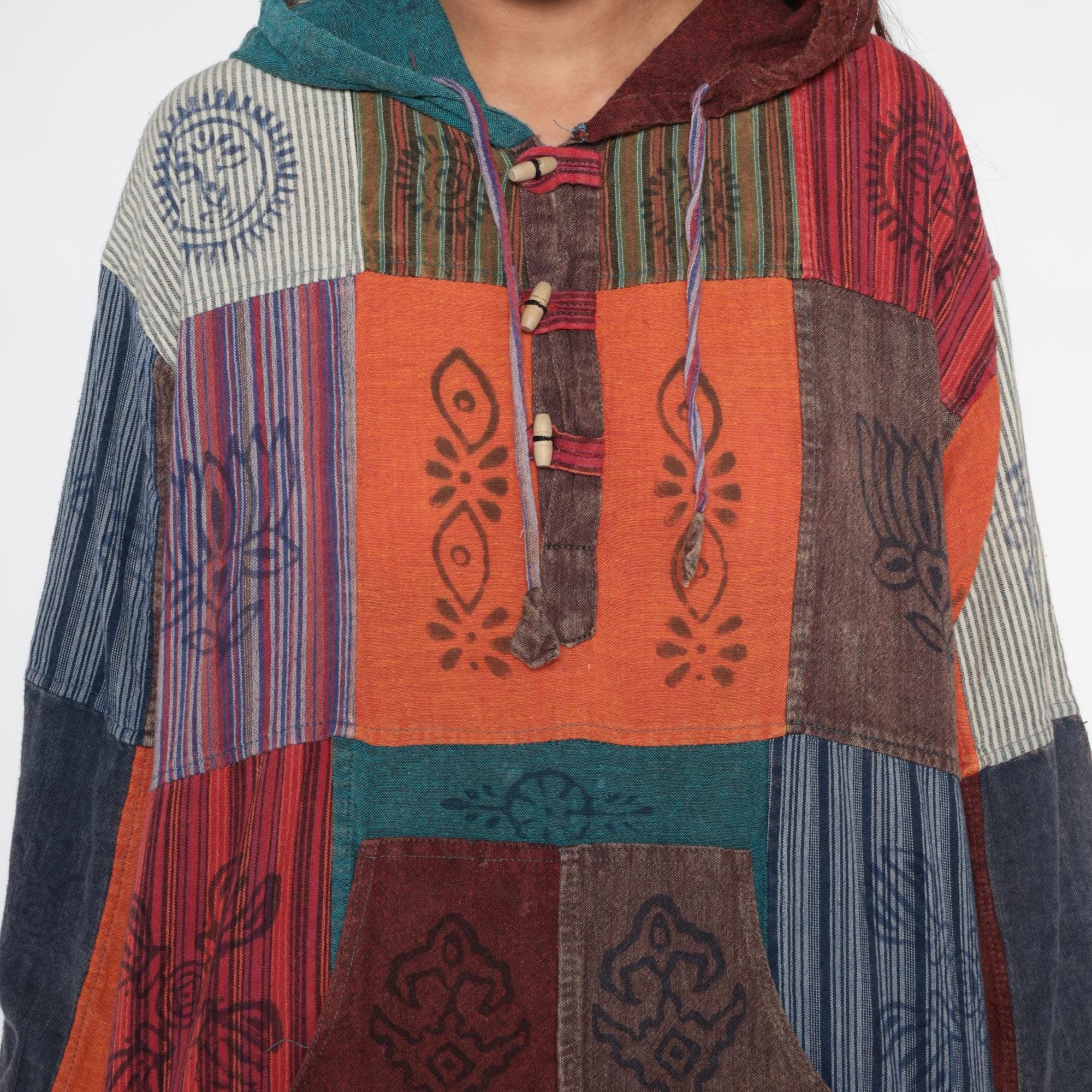Y2k patchwork hoodie with block-printed cultural motifs and varied striped patterns in earthy tones of orange, burgundy, navy, teal, brown, and cream. Each patchwork square contains different hand-printed designs including lotus flowers, sun motifs, geometric symbols, and intricate line work. Hooded neckline with drawstring closure and button placket at the chest with decorative wooden beads. Kangaroo-style front pocket.