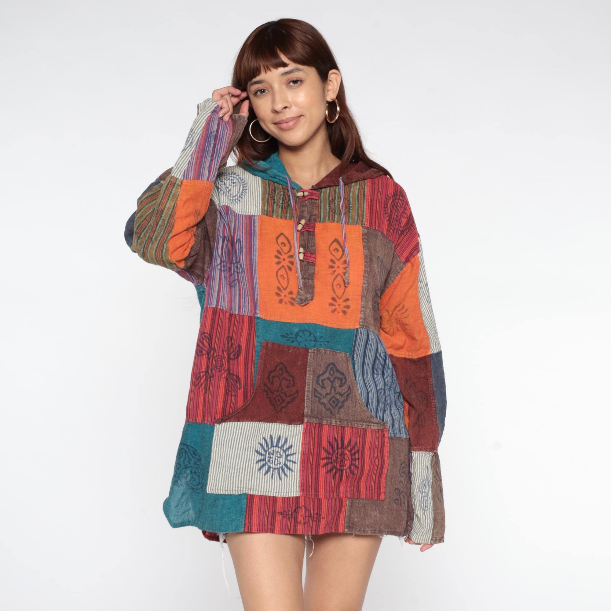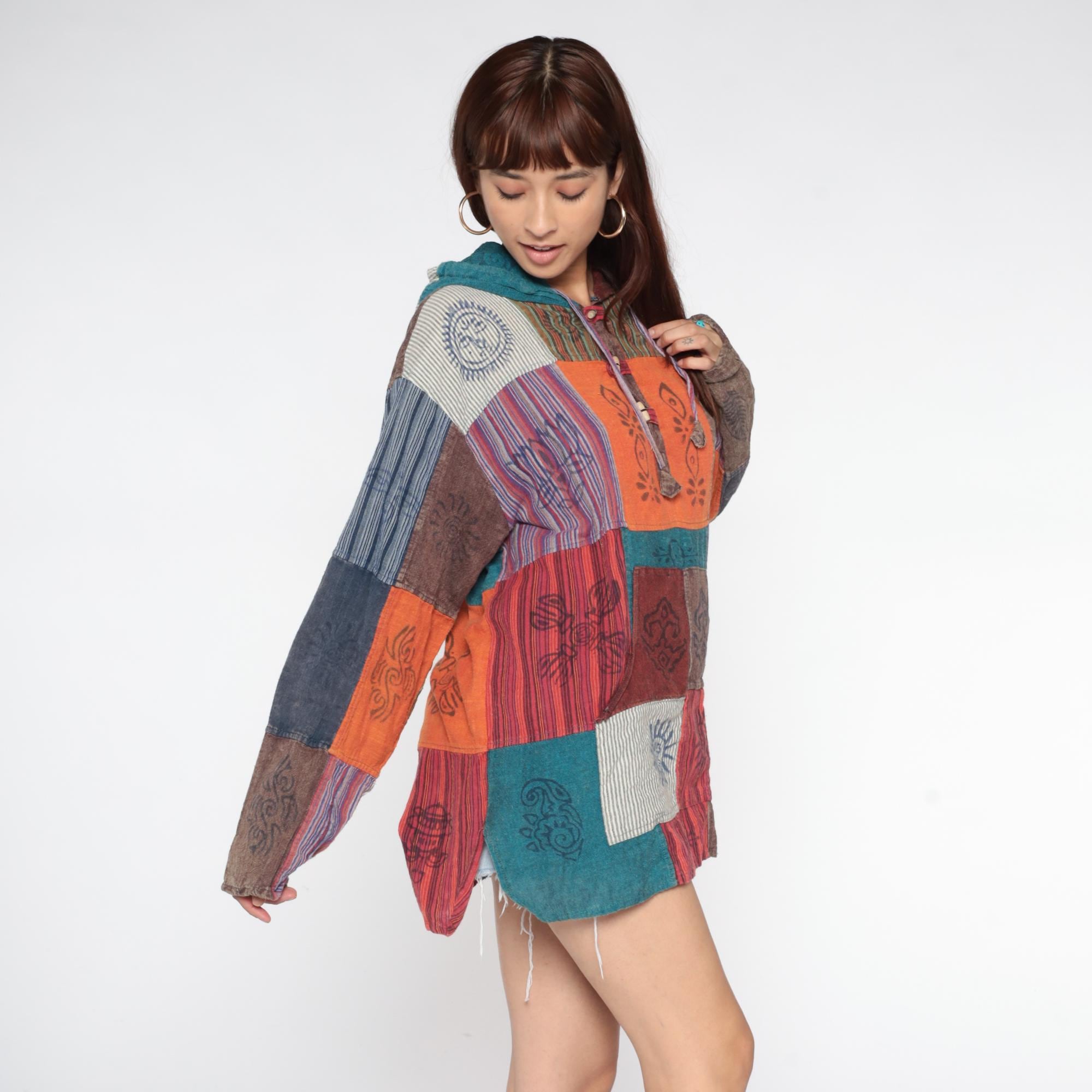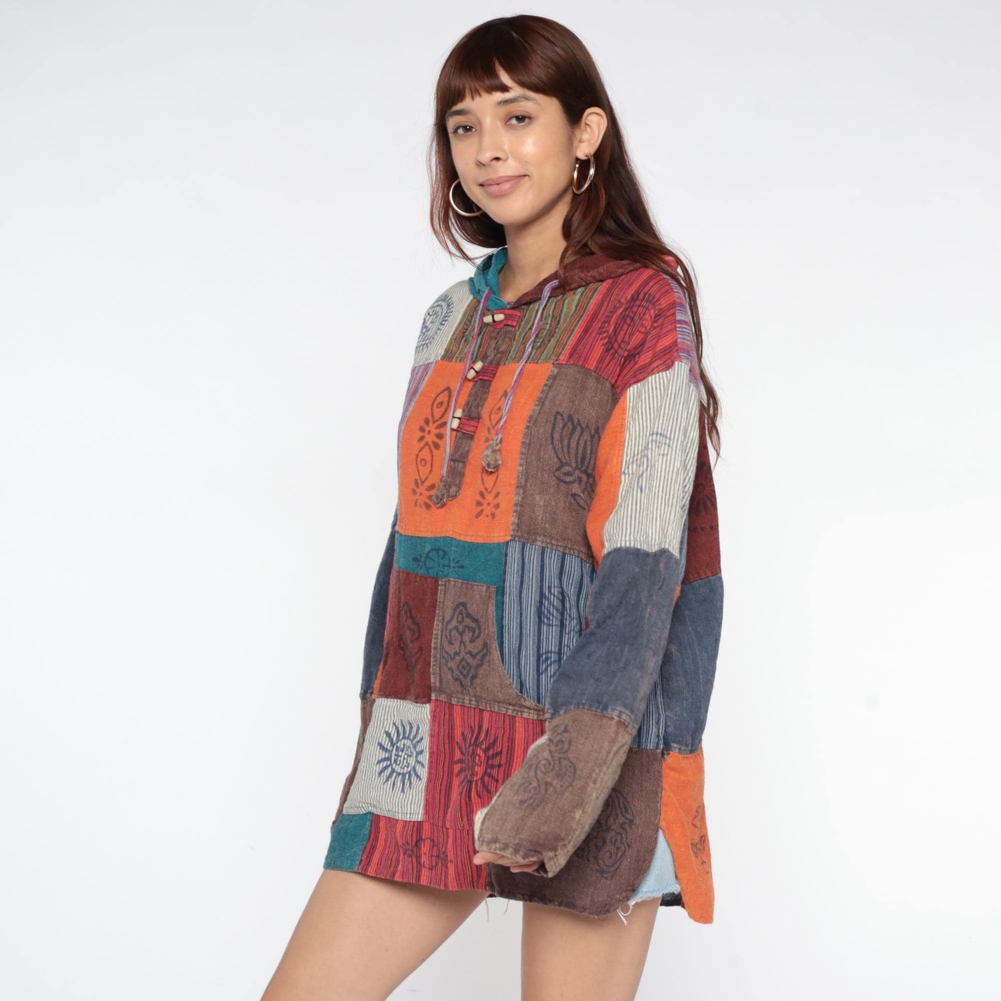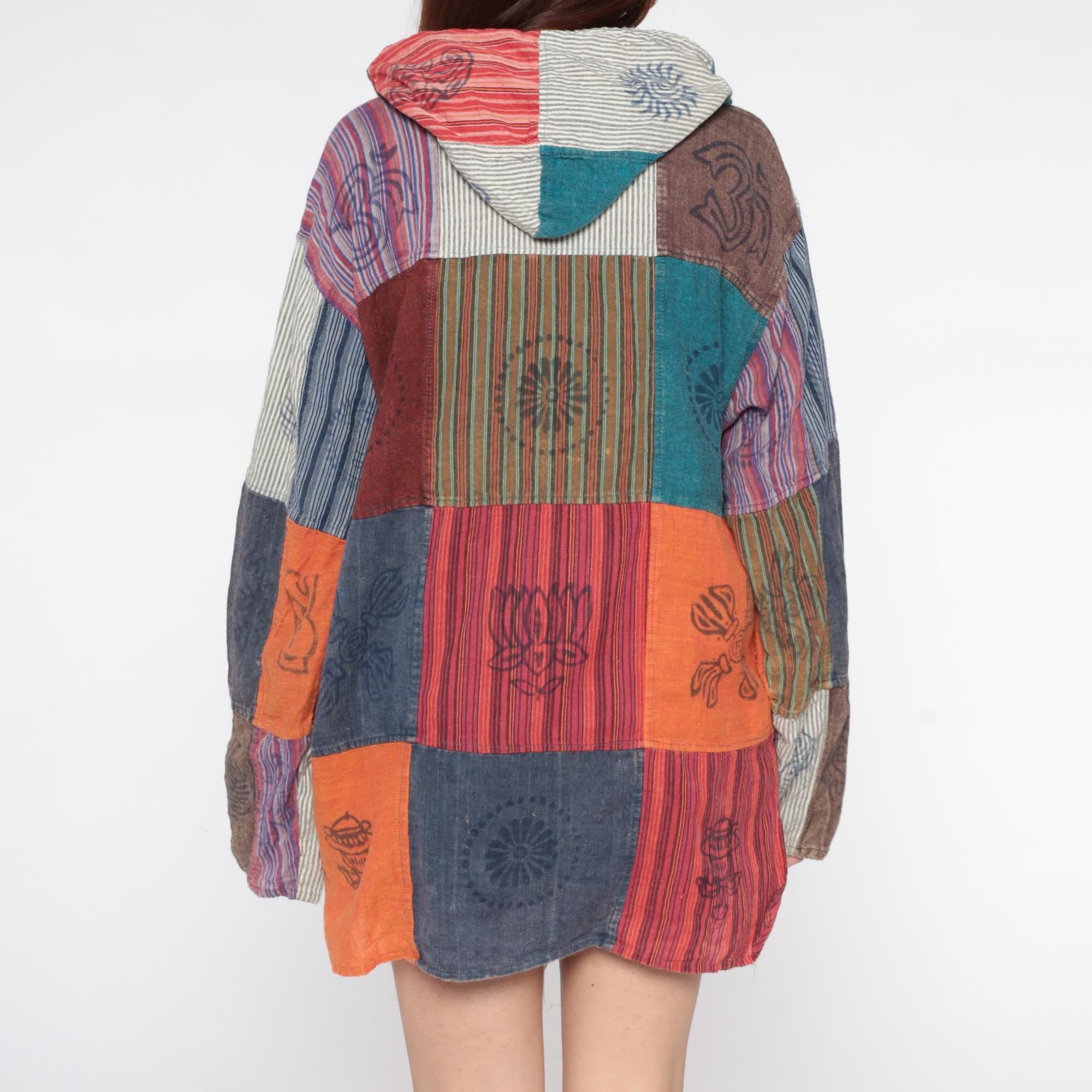 Y2k patchwork hoodie with block-printed cultural motifs and varied striped patterns in earthy tones of orange, burgundy, navy, teal, brown, and cream. Each patchwork square contains different hand-printed designs including lotus flowers, sun motifs, geometric symbols, and intricate line work. Hooded neckline with drawstring closure and button placket at the chest with decorative wooden beads. Kangaroo-style front pocket.