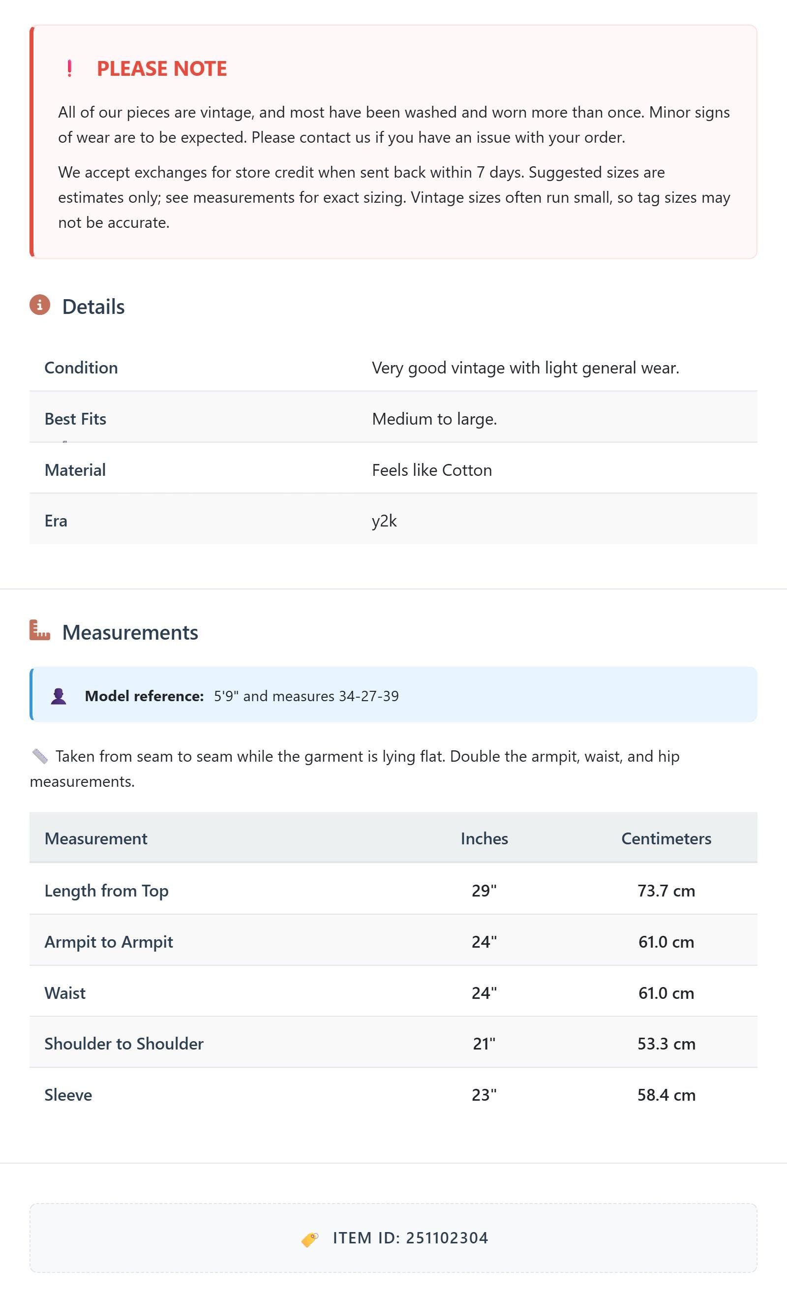 All of our pieces are vintage, and most have been washed and worn more than once. Minor signs of wear are to be expected. Please contact us if you have an issue with your order. We accept exchanges for store credit when sent back within 7 days.