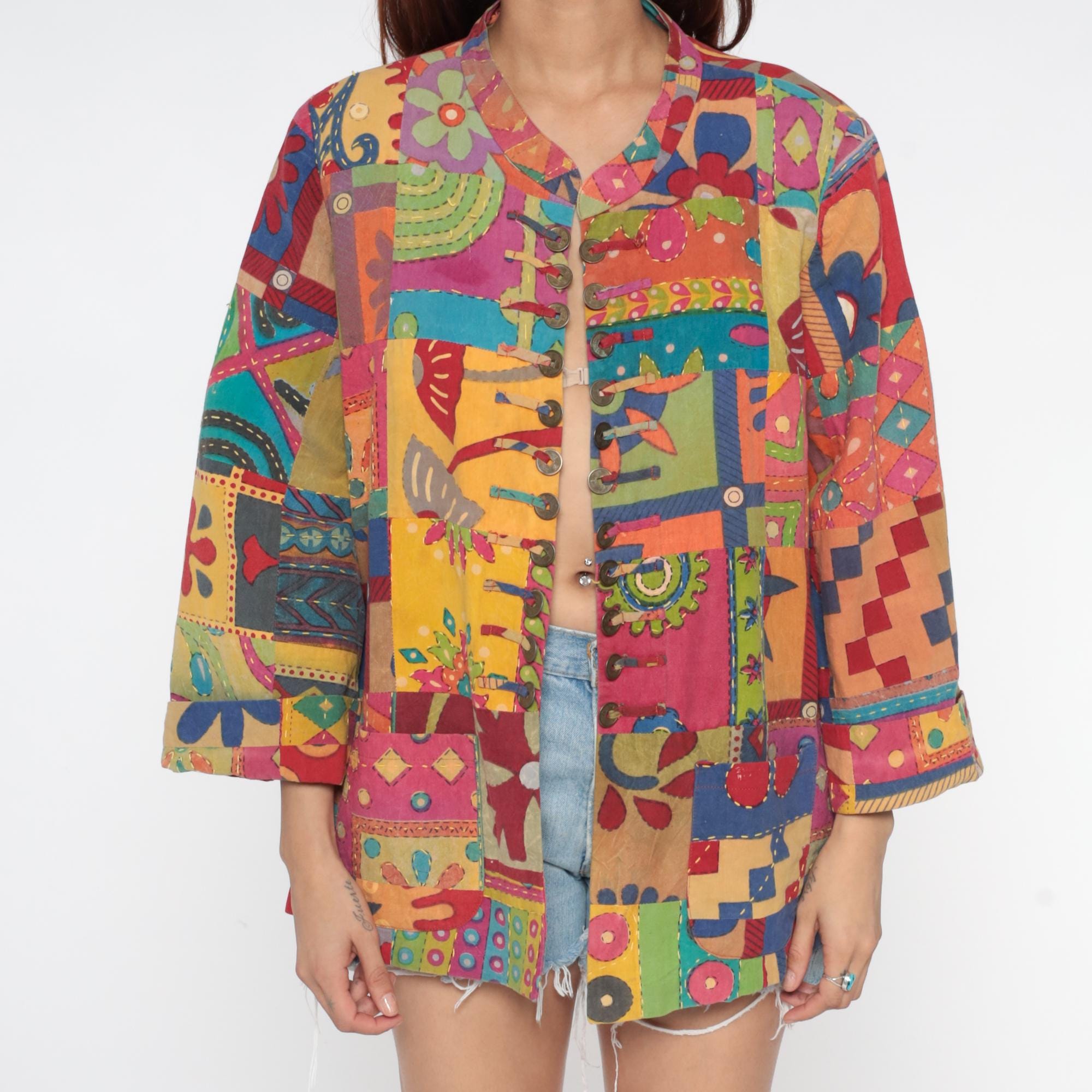 Y2K colorful patchwork jacket in cotton blend with multicolored geometric blocks, floral designs, and embroidered details across the entire piece. Collared neckline with button front closure using decorative mixed buttons, long sleeves with button cuffs. Relaxed fit with hip-length hem. Features rainbow of colors including pink, orange, yellow, green, blue, red, purple, and brown in various patchwork squares and rectangles with handstitched details, appliqued flowers, and decorative embroidery throughout.