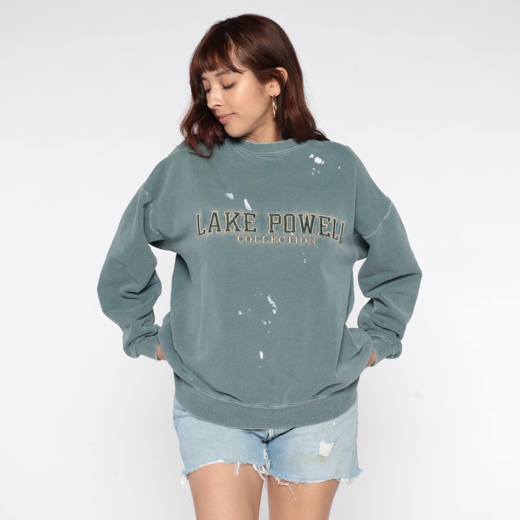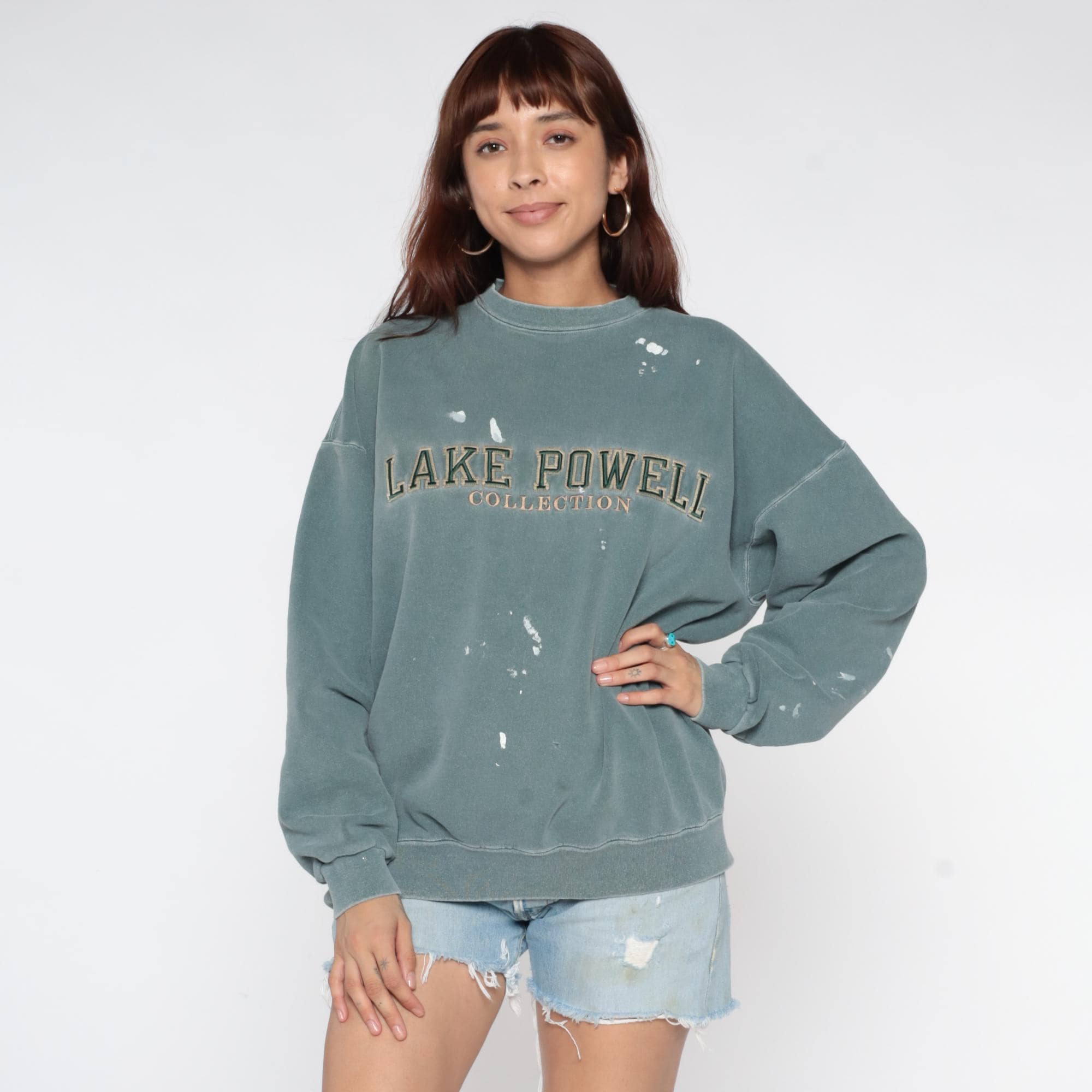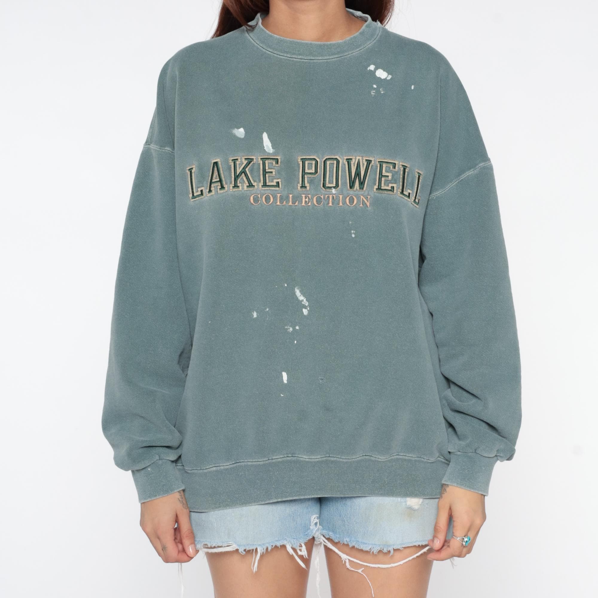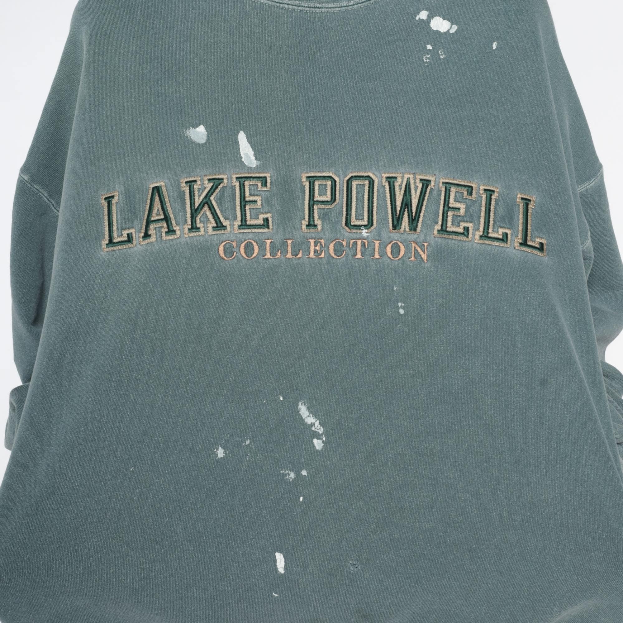 90s sweatshirt in sage blue-green with "LAKE POWELL COLLECTION" embroidered text across the chest in tan and white. Distressed throughout with faint fading and bleach spots on the back, white paint splatters, and a small hole. Crewneck with ribbed collar, cuffs, and hem.