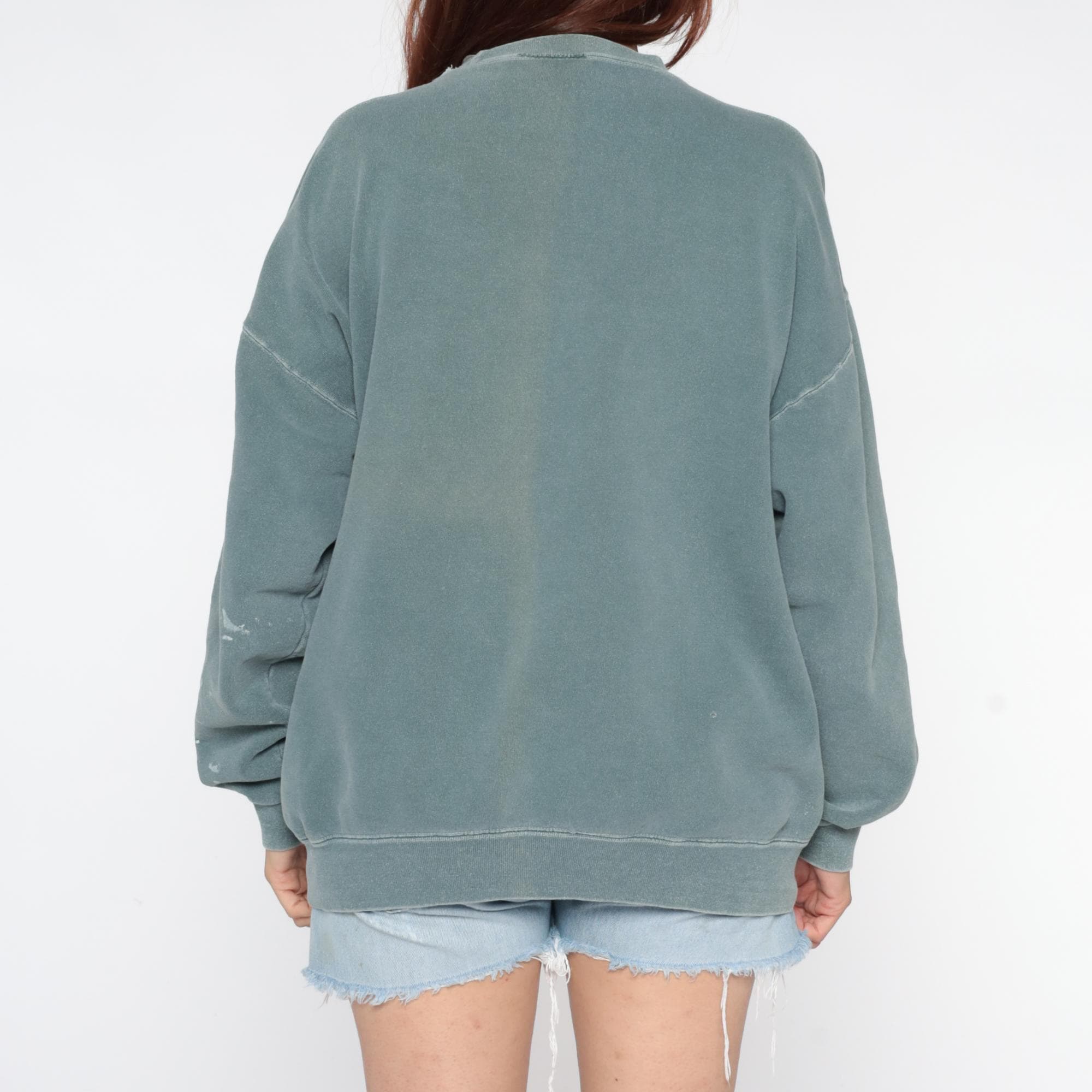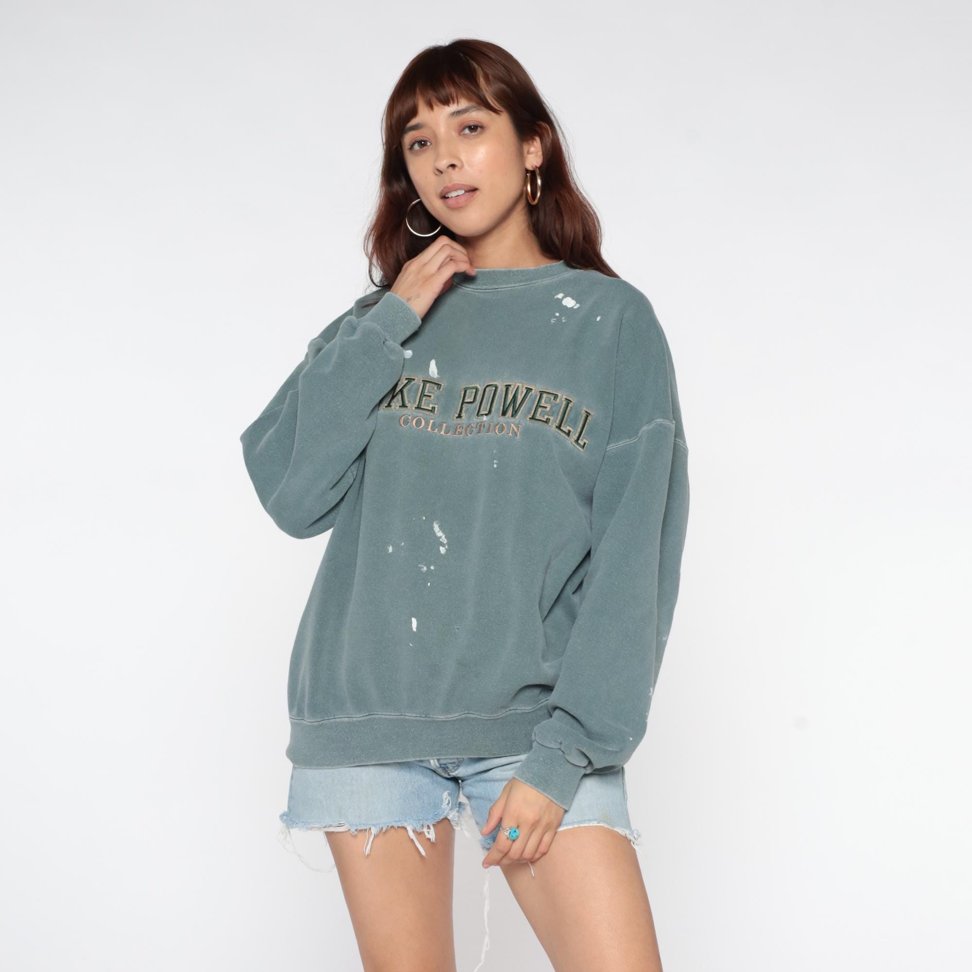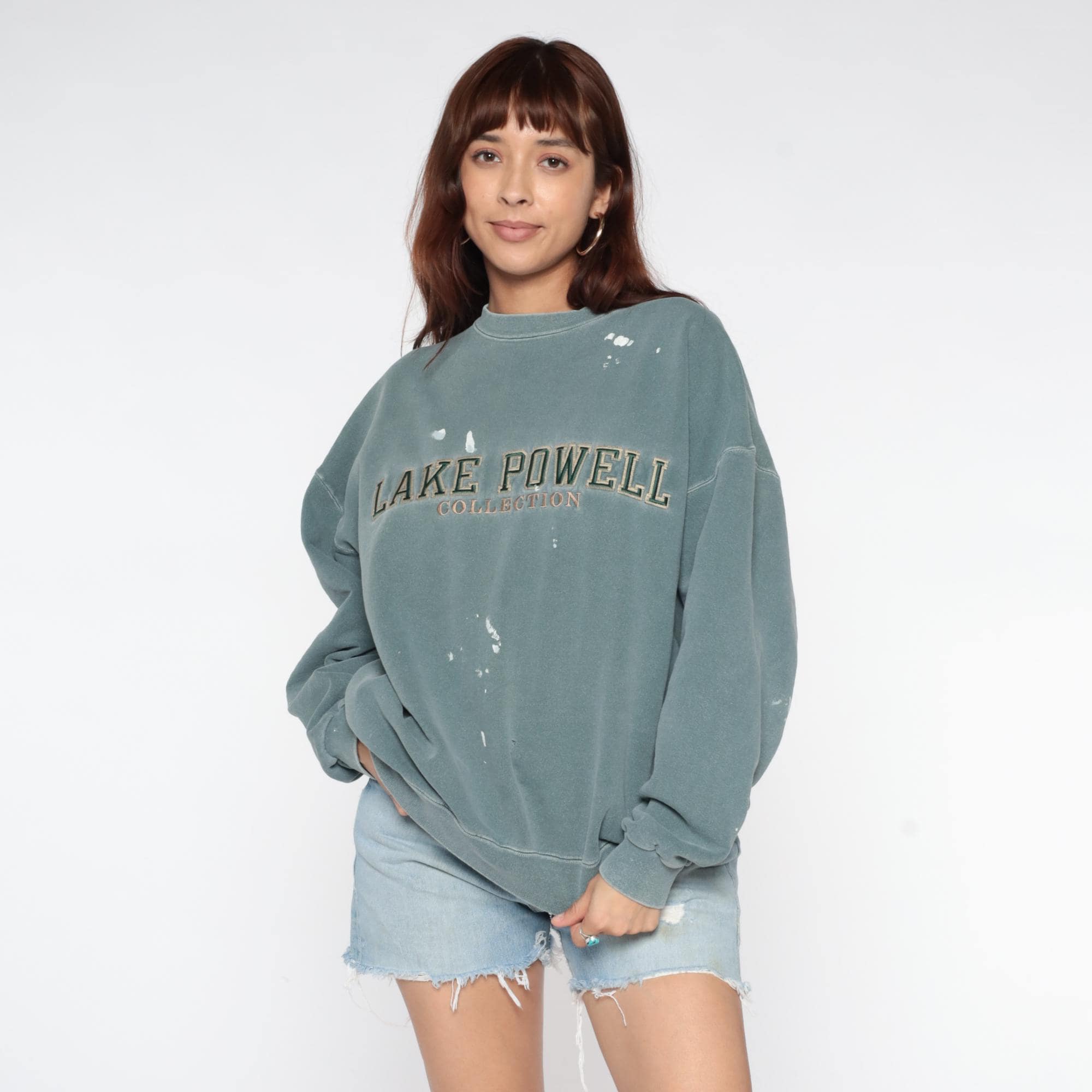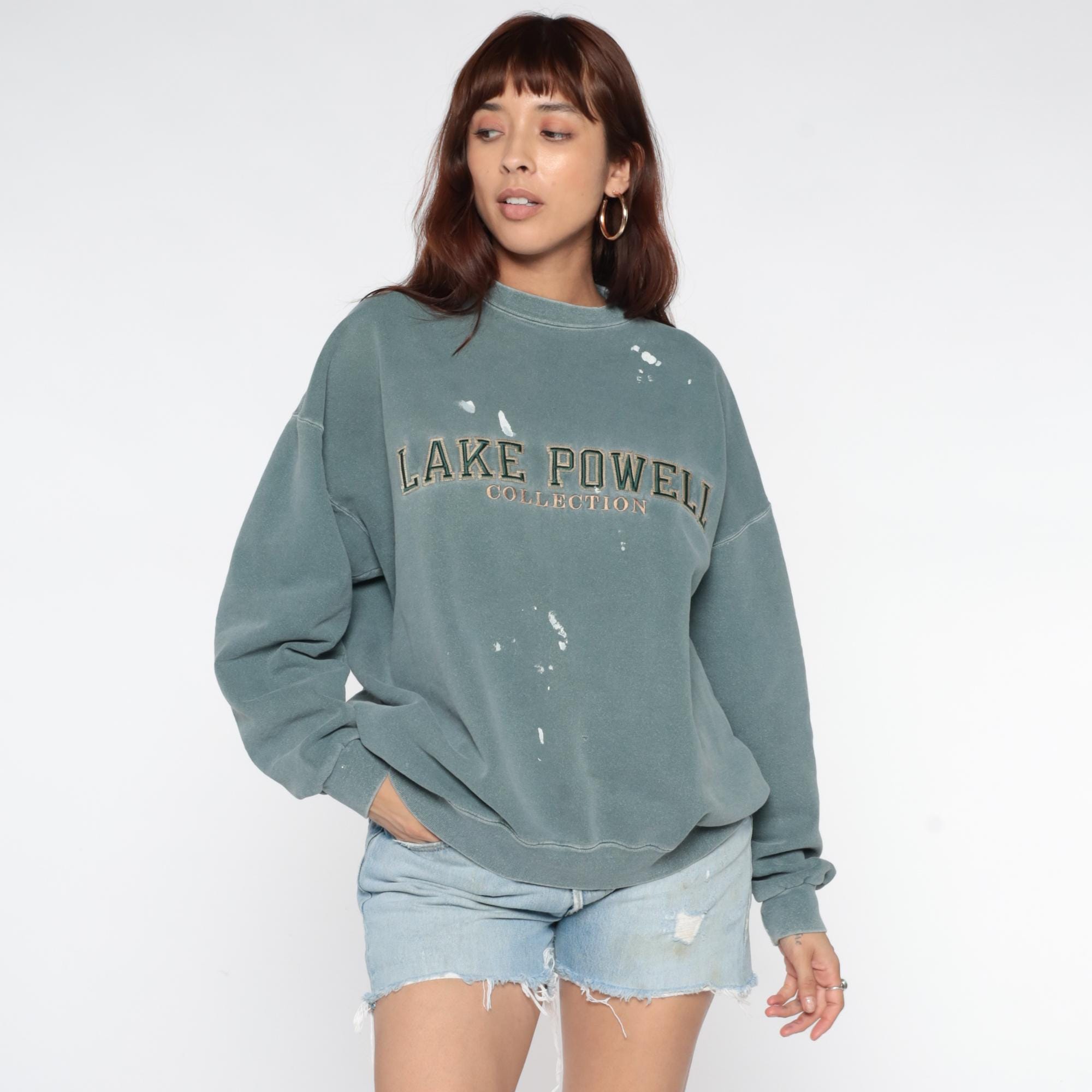 90s sweatshirt in sage blue-green with "LAKE POWELL COLLECTION" embroidered text across the chest in tan and white. Distressed throughout with faint fading and bleach spots on the back, white paint splatters, and a small hole. Crewneck with ribbed collar, cuffs, and hem.