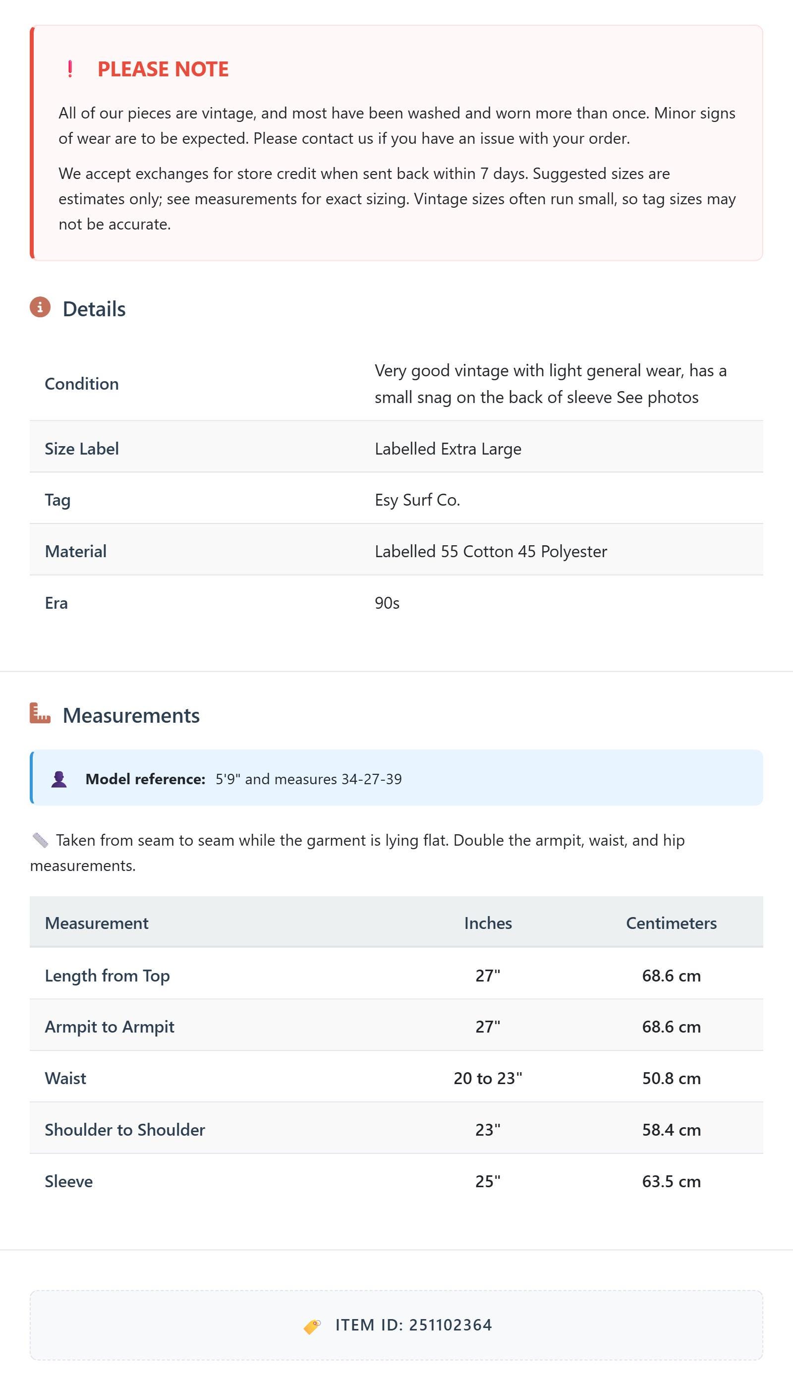All of our pieces are vintage, and most have been washed and worn more than once. Minor signs of wear are to be expected. Please contact us if you have an issue with your order. We accept exchanges for store credit when sent back within 7 days.