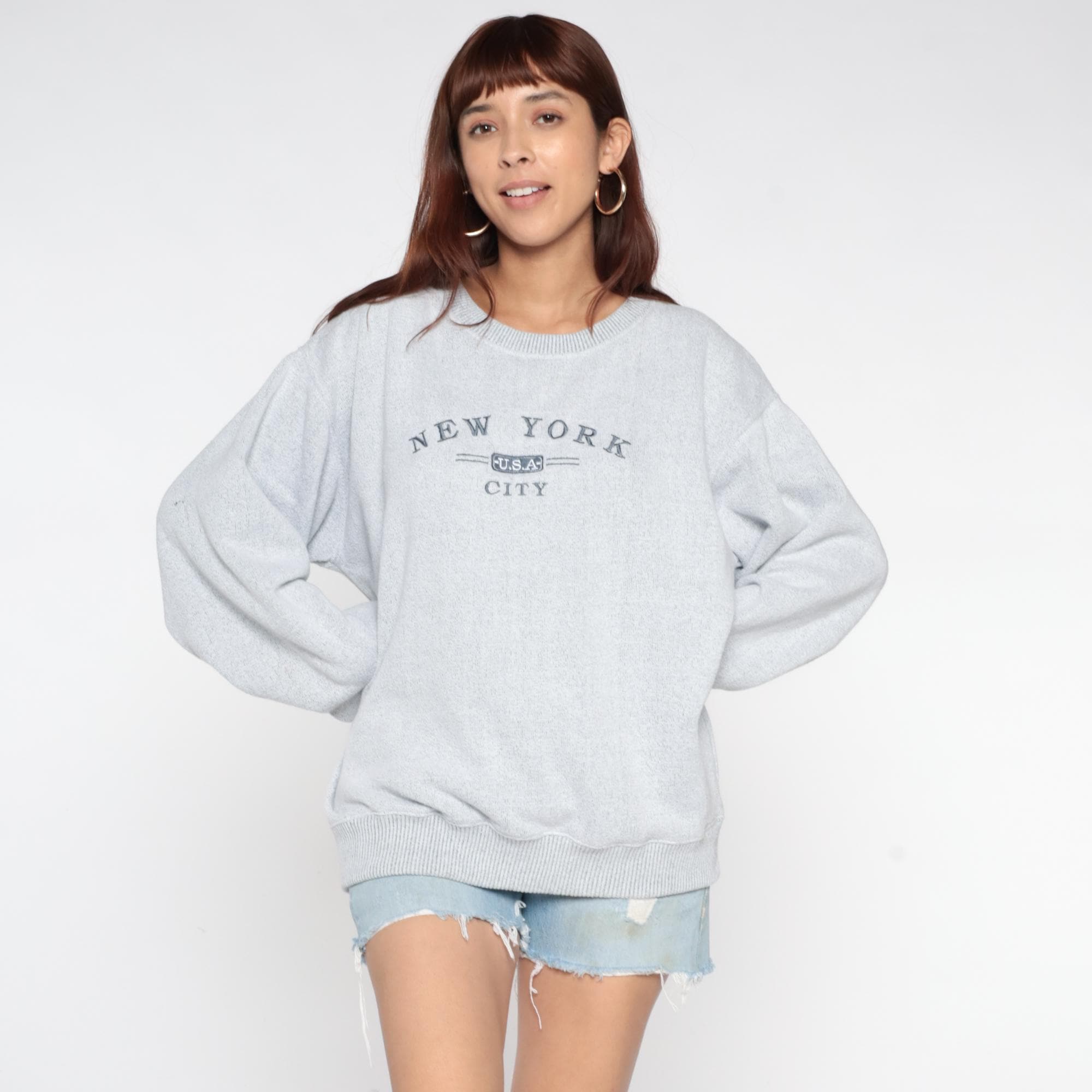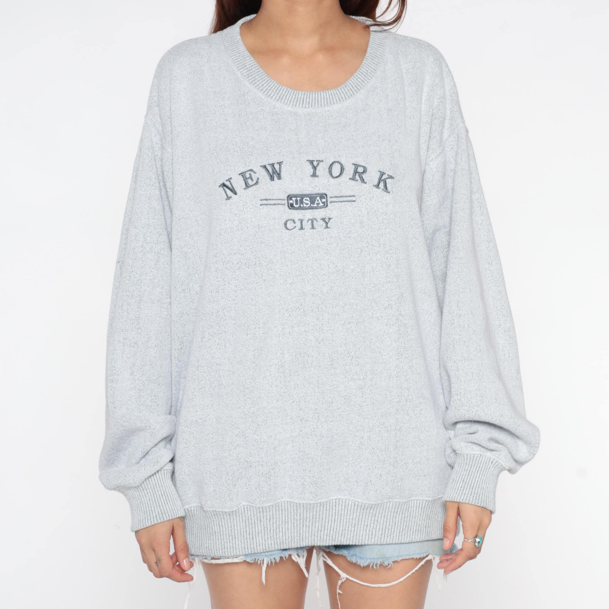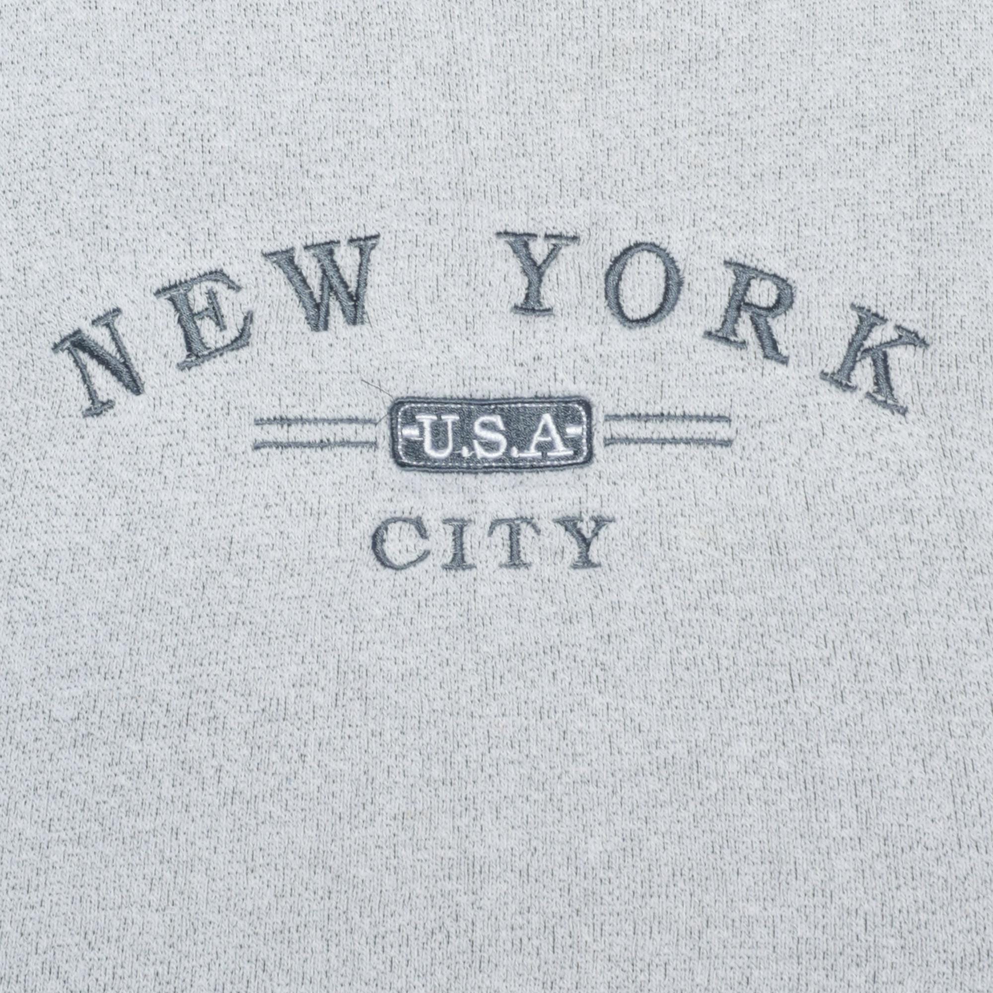 90s light gray sweatshirt from Esy Surf Co. with New York City U.S.A. graphic printed across the chest in gray lettering. Crew neck with ribbed trim at neckline, cuffs, and hem.