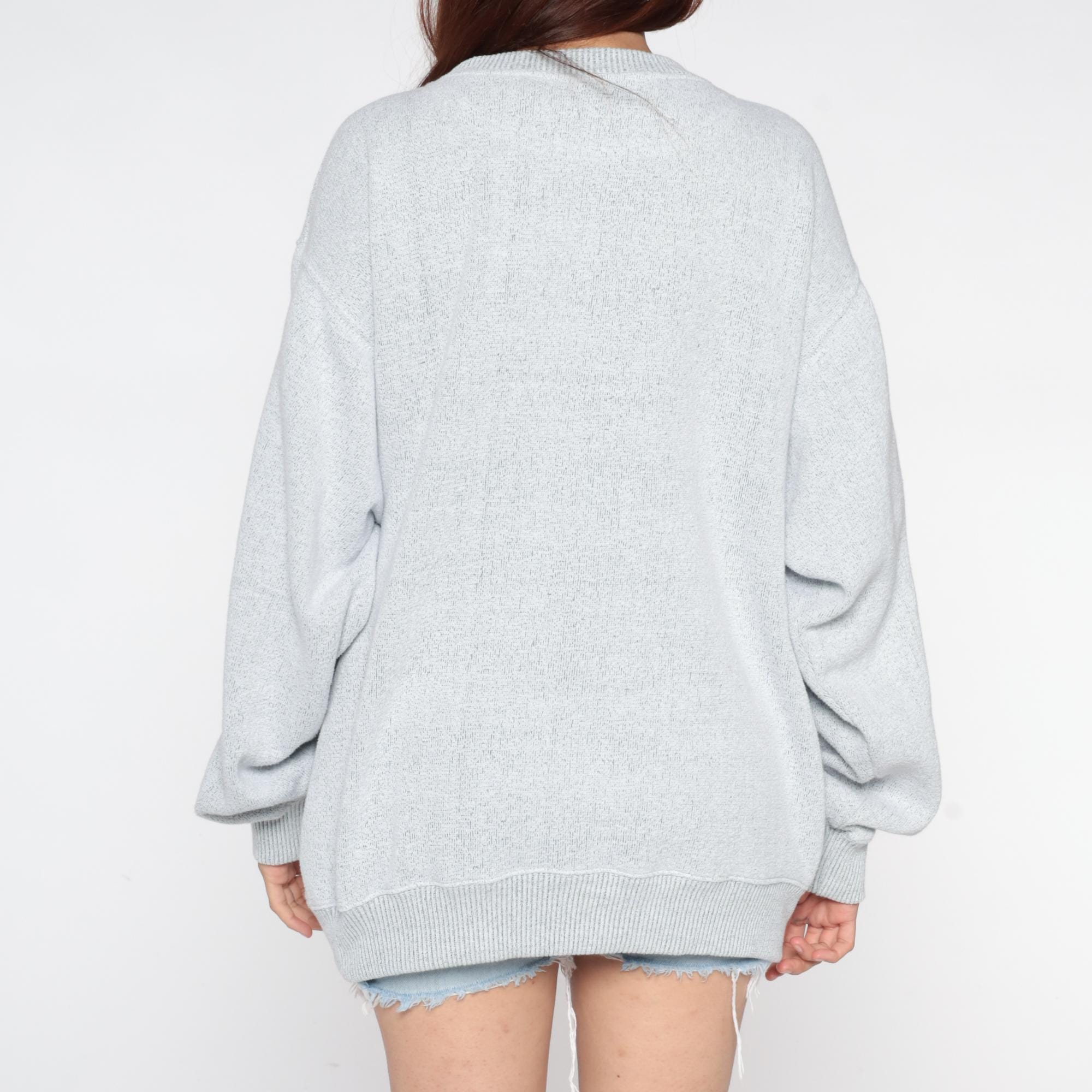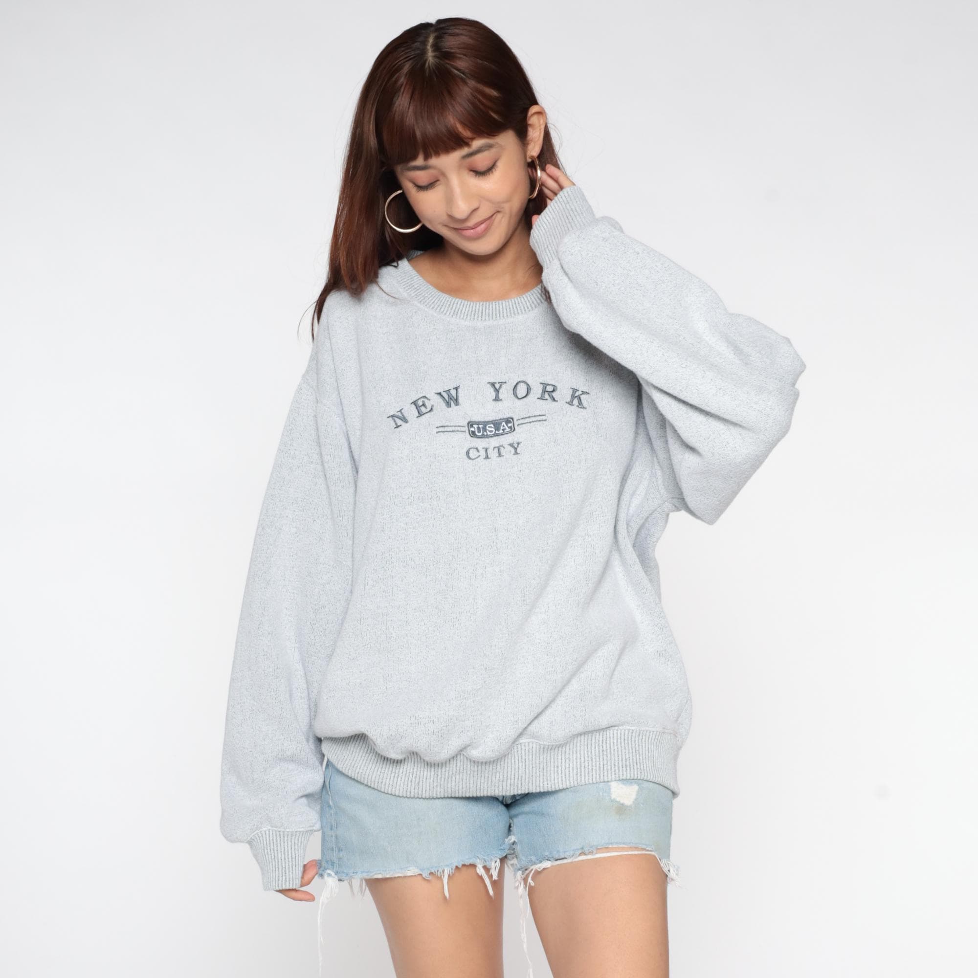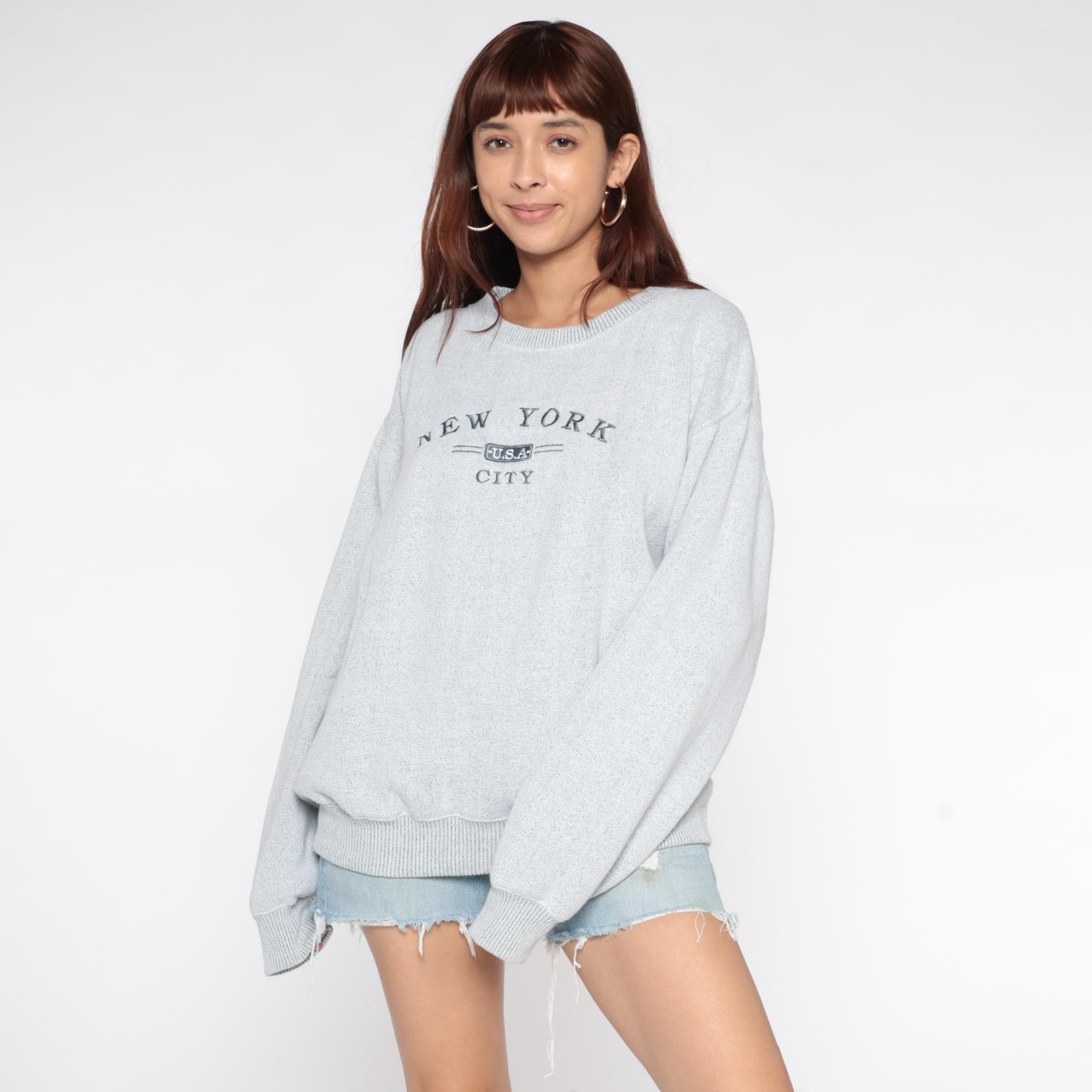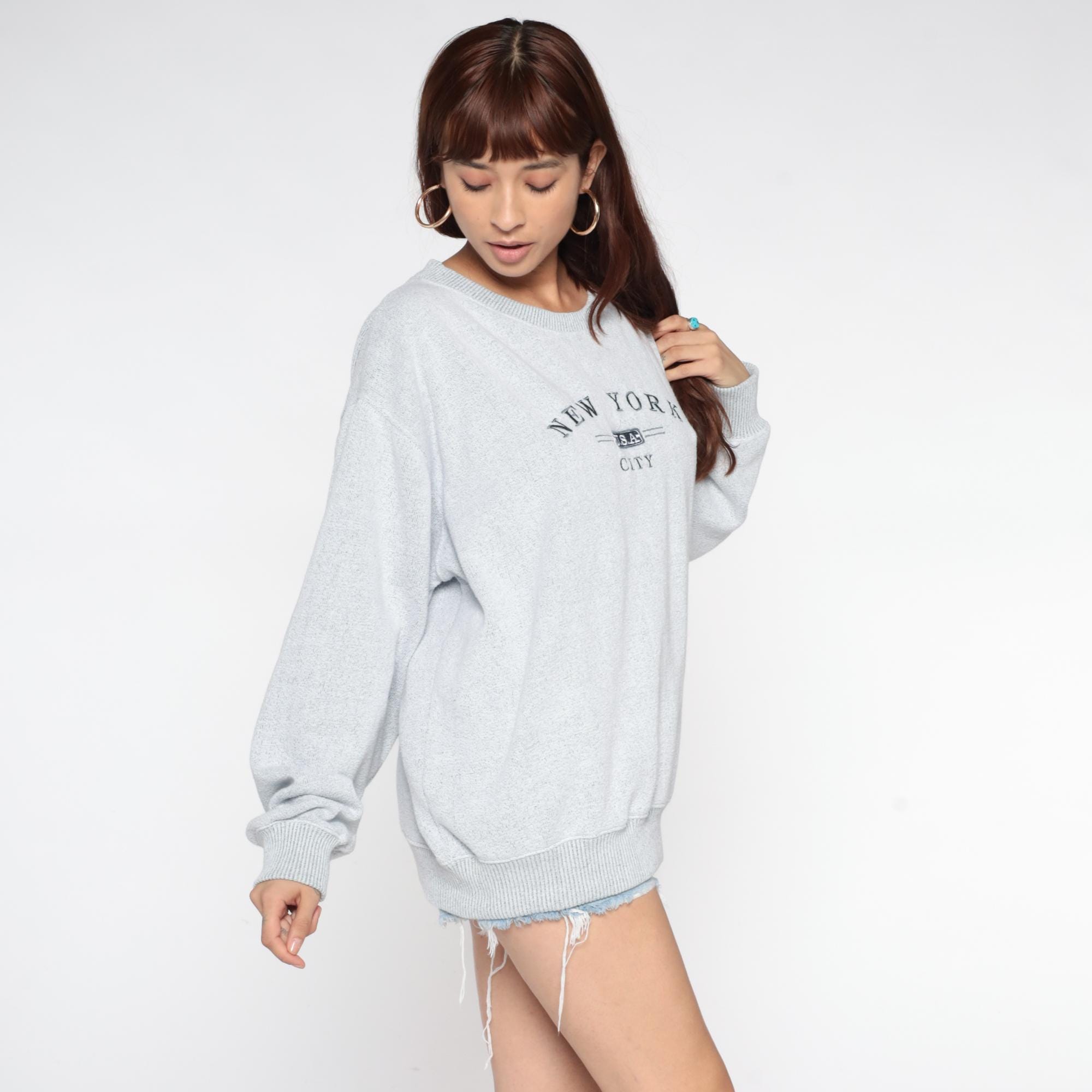 90s light gray sweatshirt from Esy Surf Co. with New York City U.S.A. graphic printed across the chest in gray lettering. Crew neck with ribbed trim at neckline, cuffs, and hem.