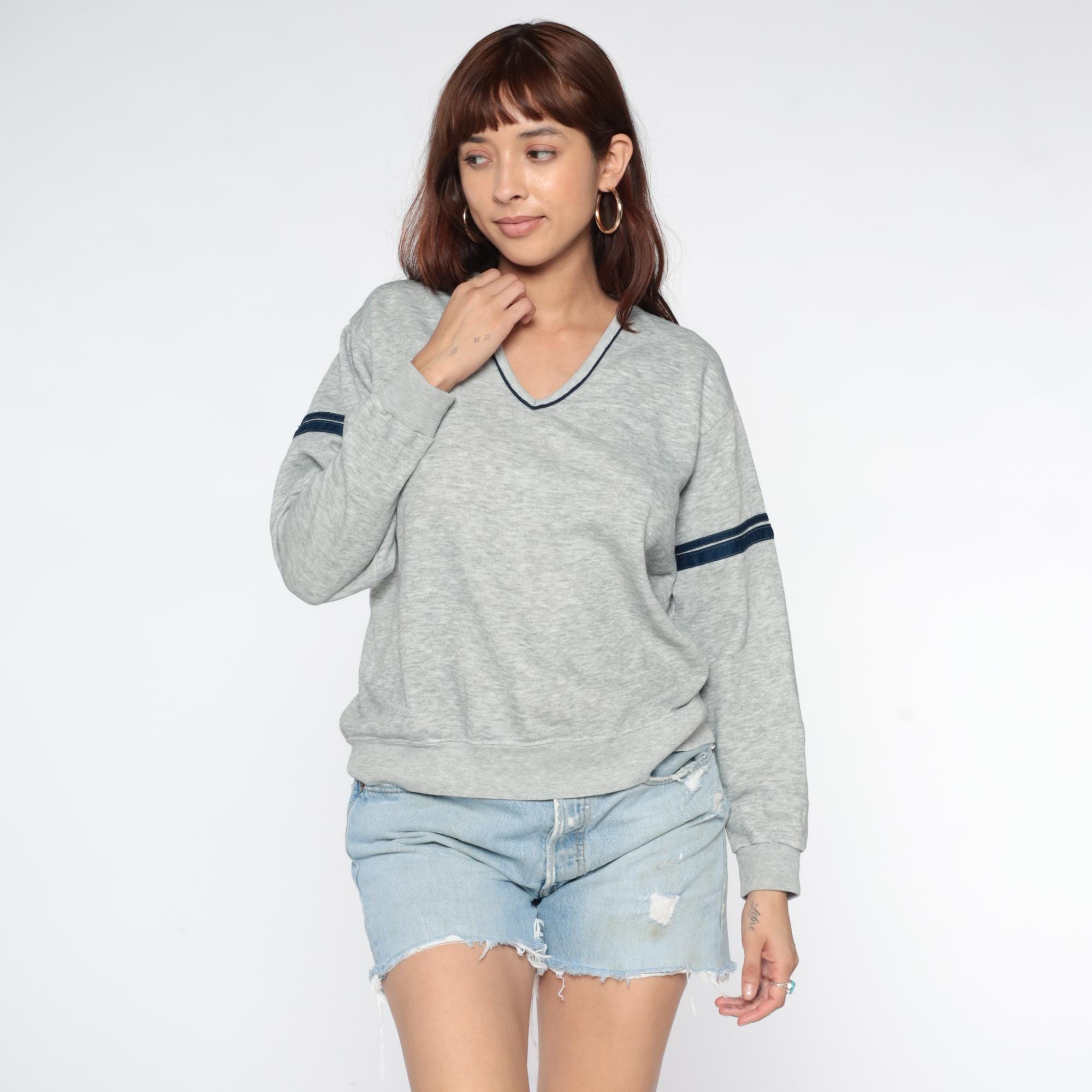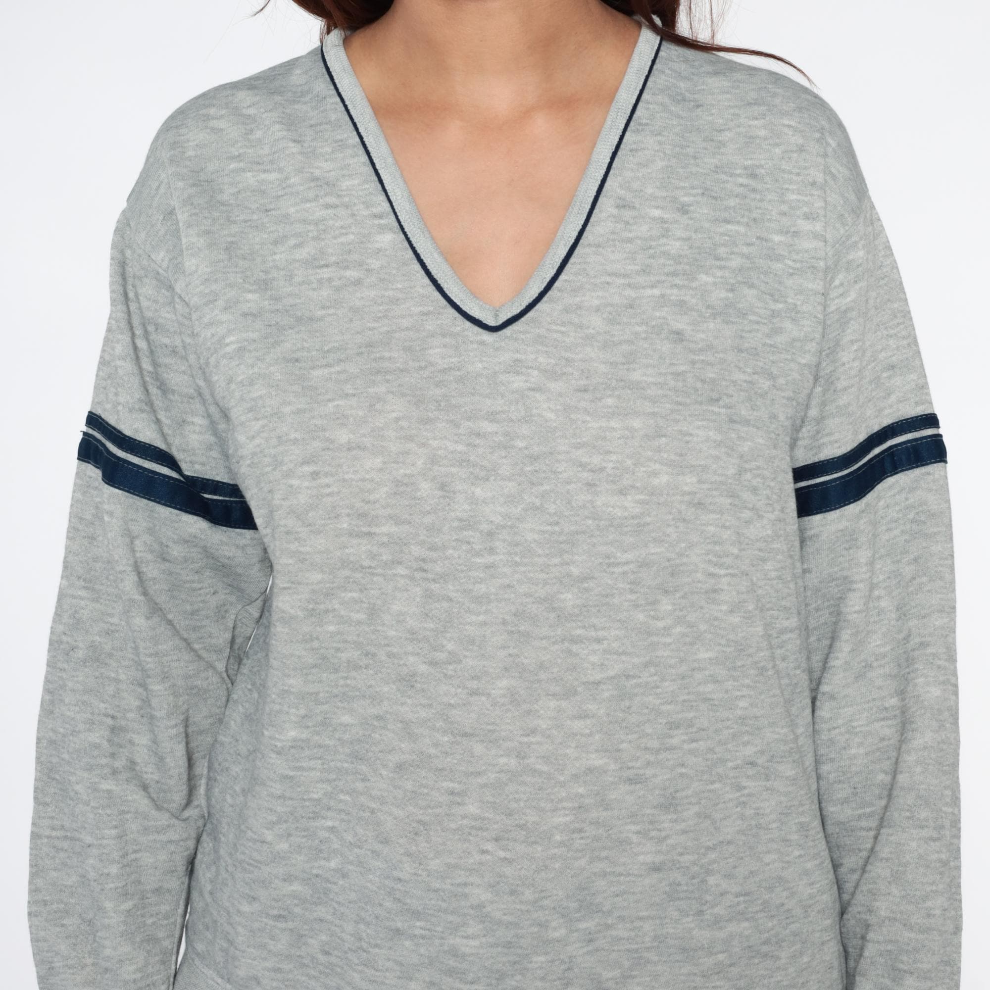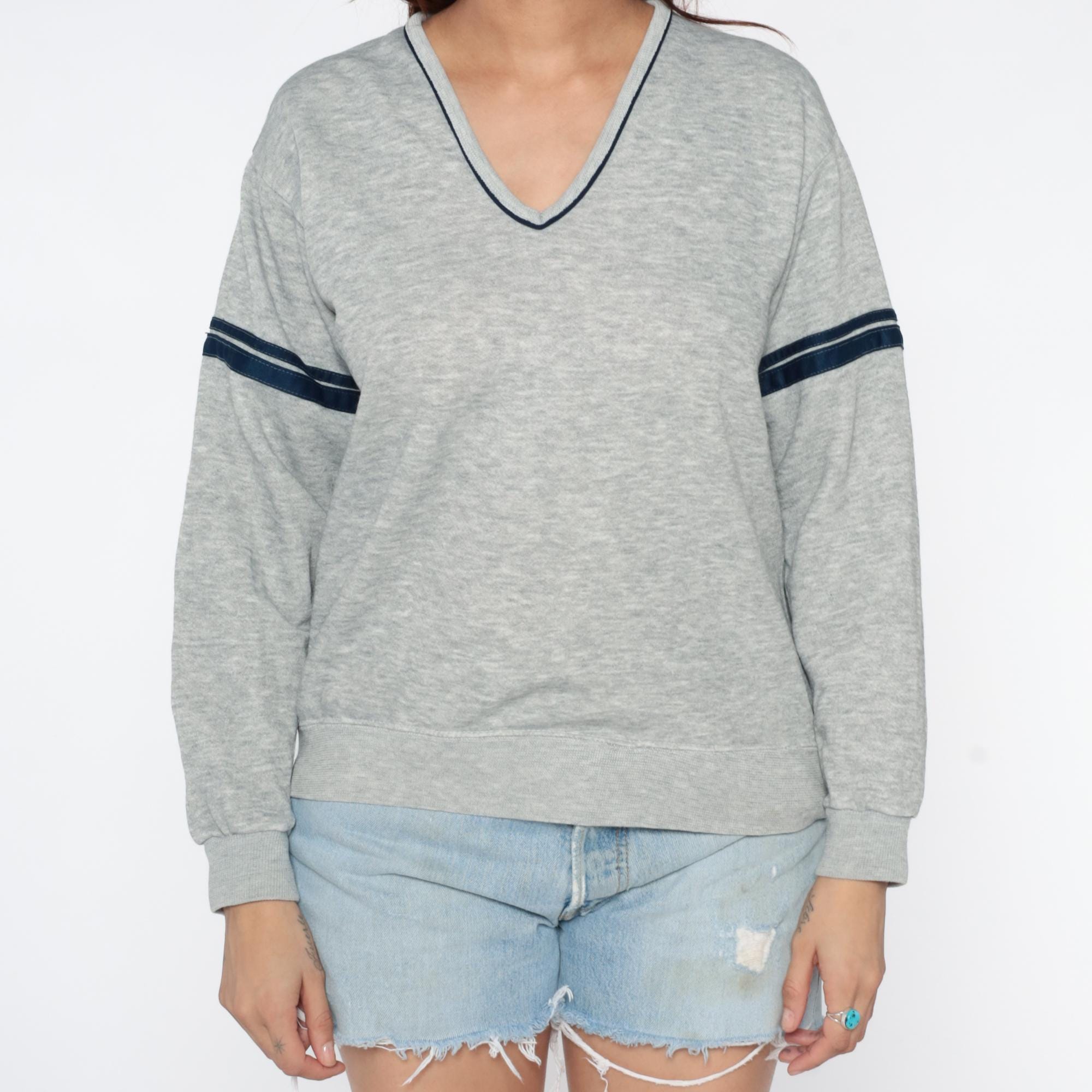 Gray heather sweatshirt from the 80s with navy contrast trim at V-neckline and dual navy and white stripes on each sleeve. Relaxed fit through body with ribbed cuffs and hem.