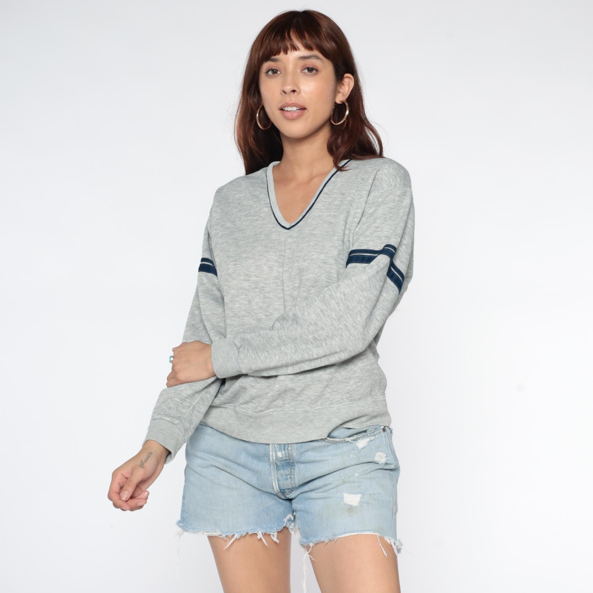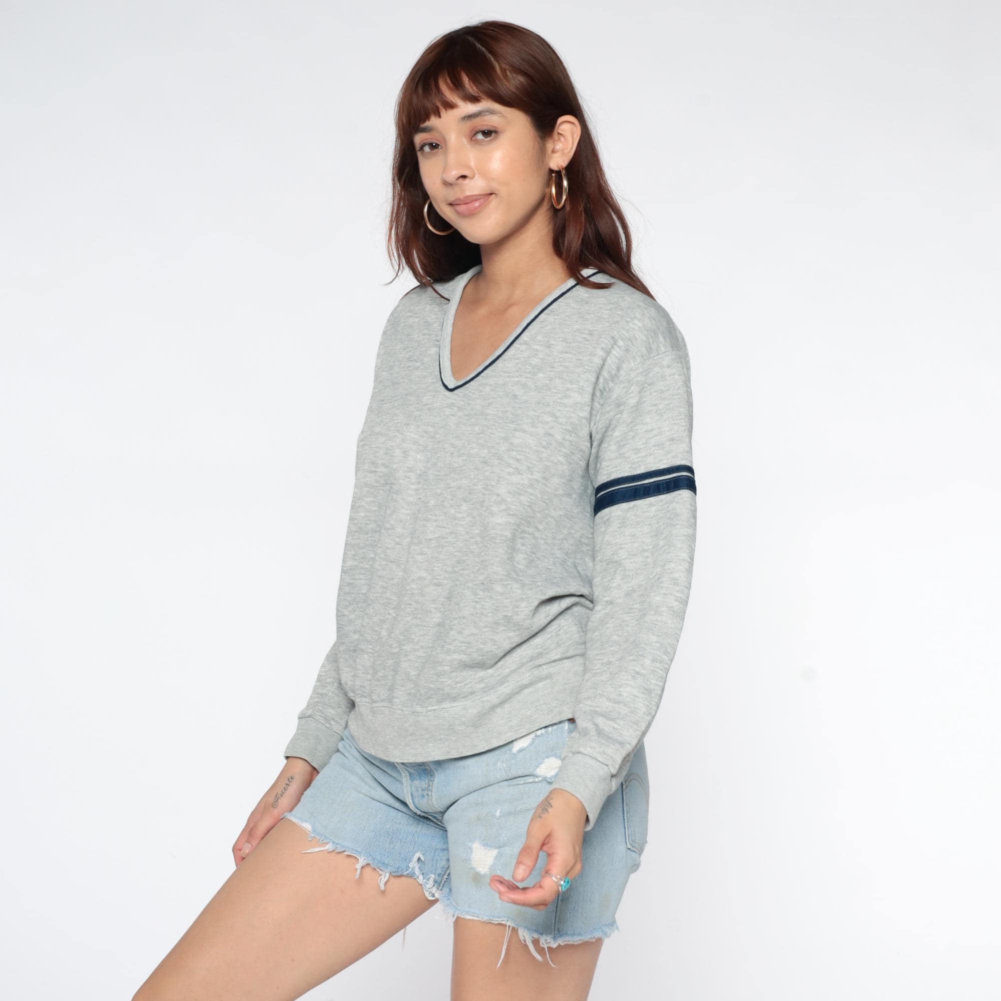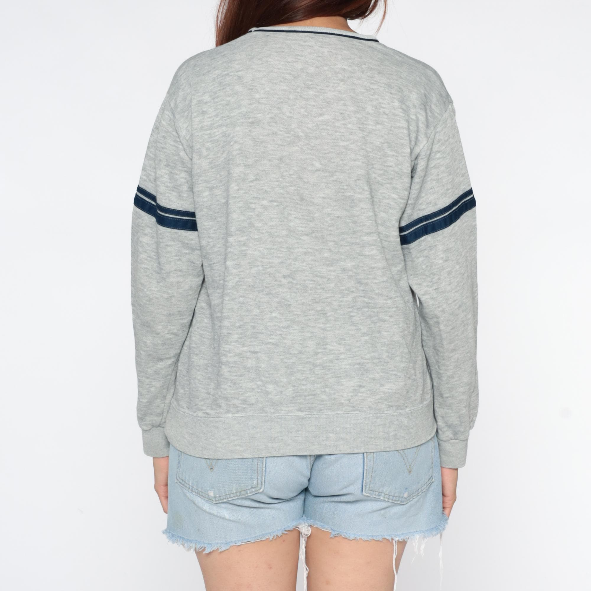 Gray heather sweatshirt from the 80s with navy contrast trim at V-neckline and dual navy and white stripes on each sleeve. Relaxed fit through body with ribbed cuffs and hem.