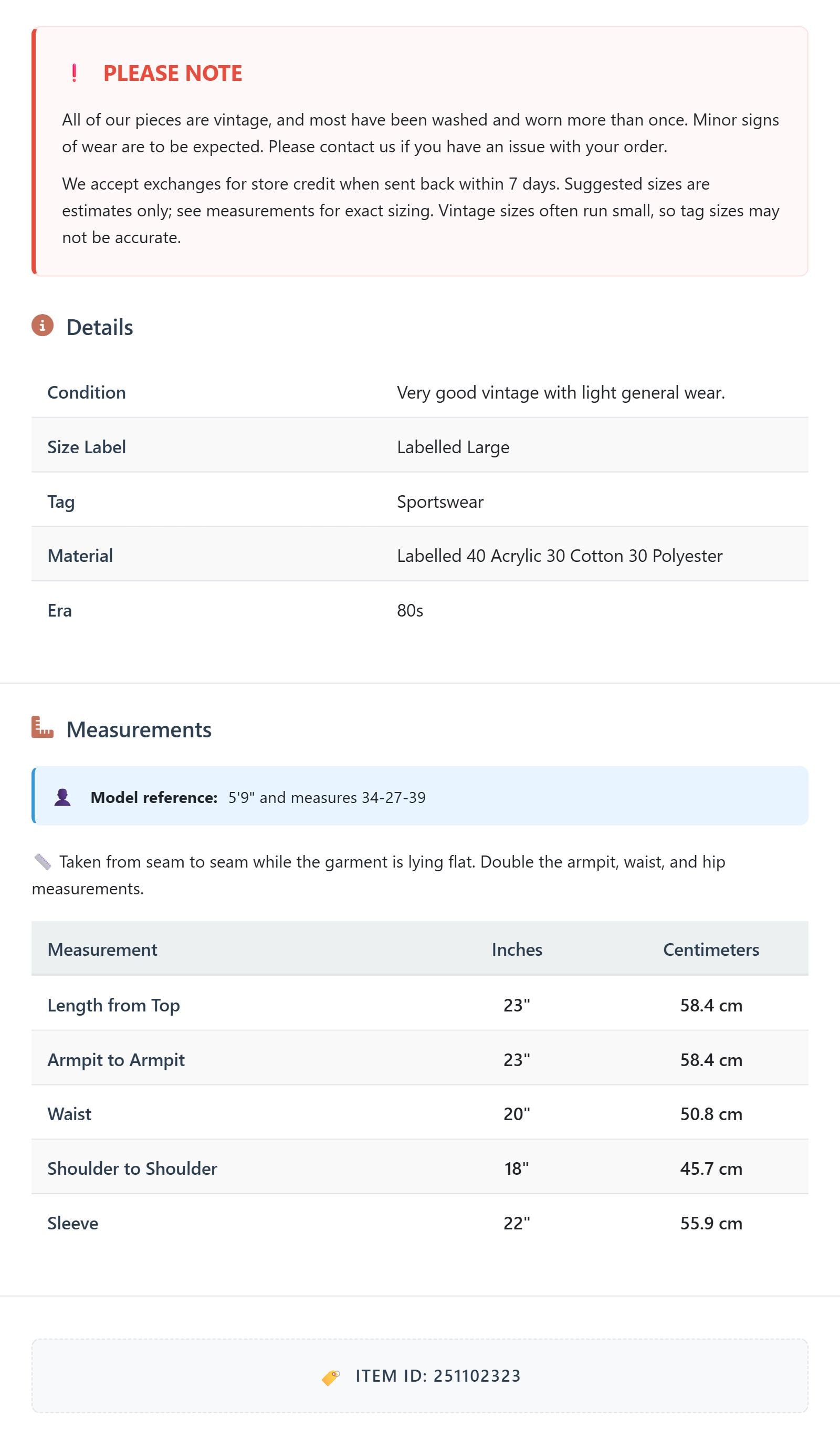 All of our pieces are vintage, and most have been washed and worn more than once. Minor signs of wear are to be expected. Please contact us if you have an issue with your order. We accept exchanges for store credit when sent back within 7 days.
